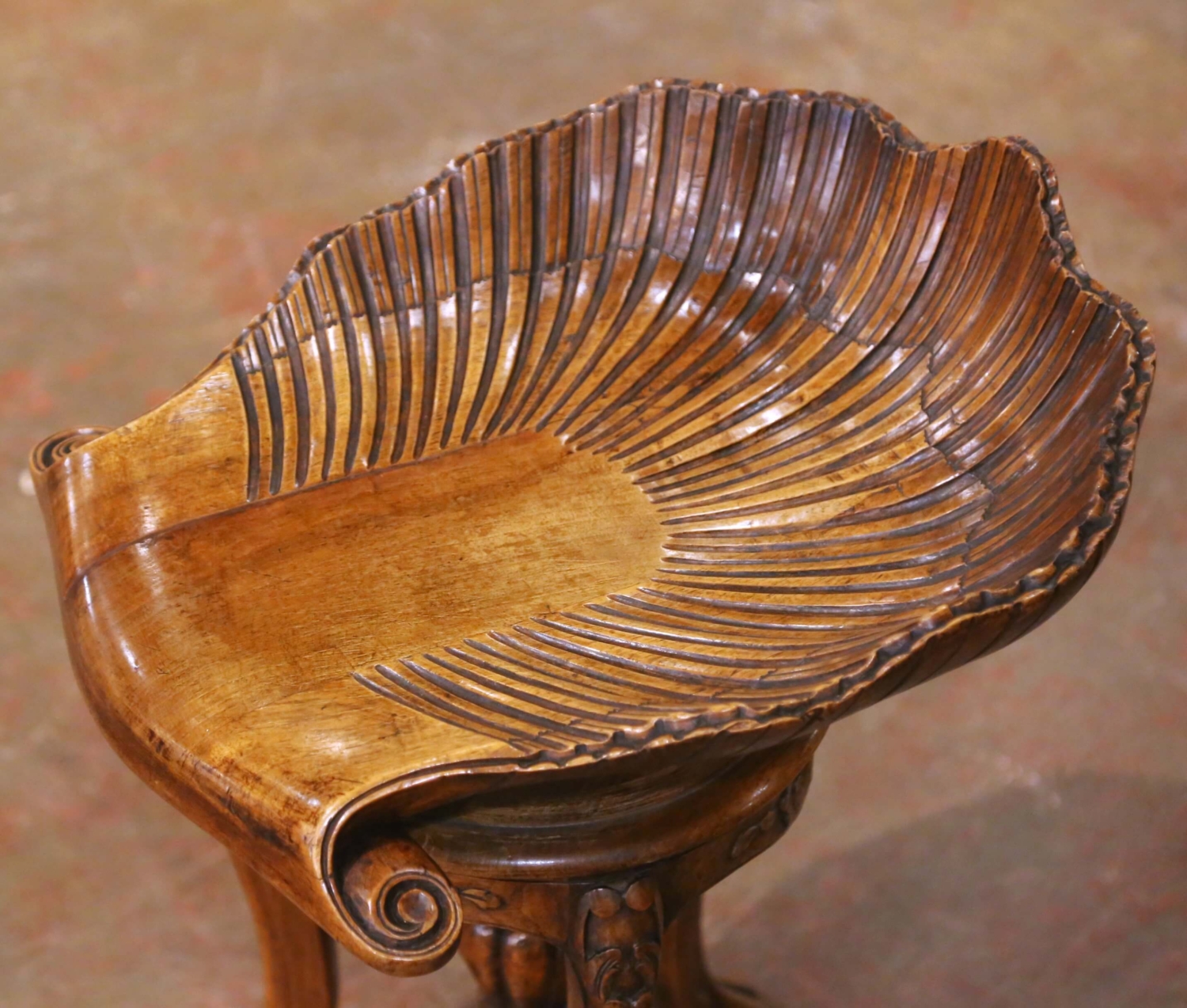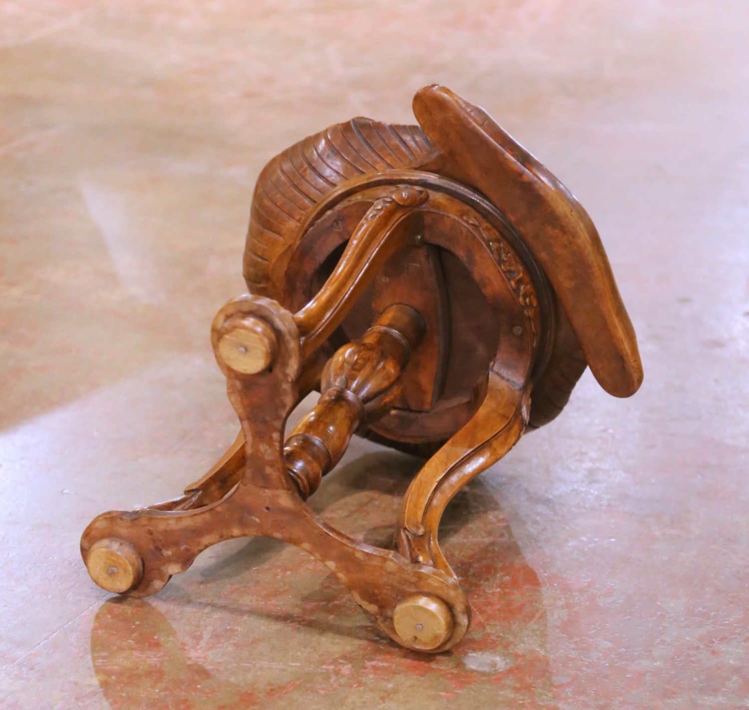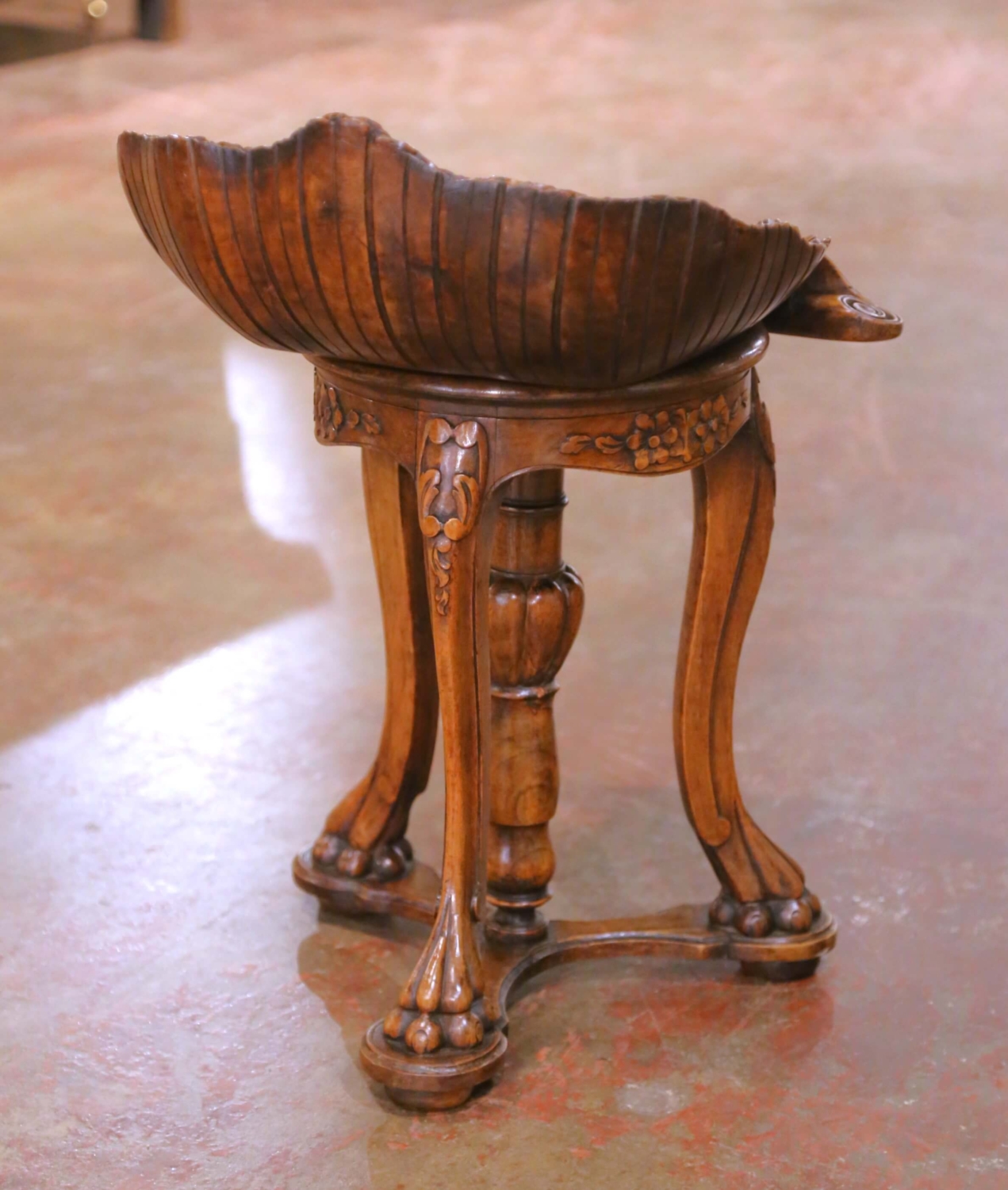 19th Century French Adjustable Walnut Piano Stool with Carved Shell Seat