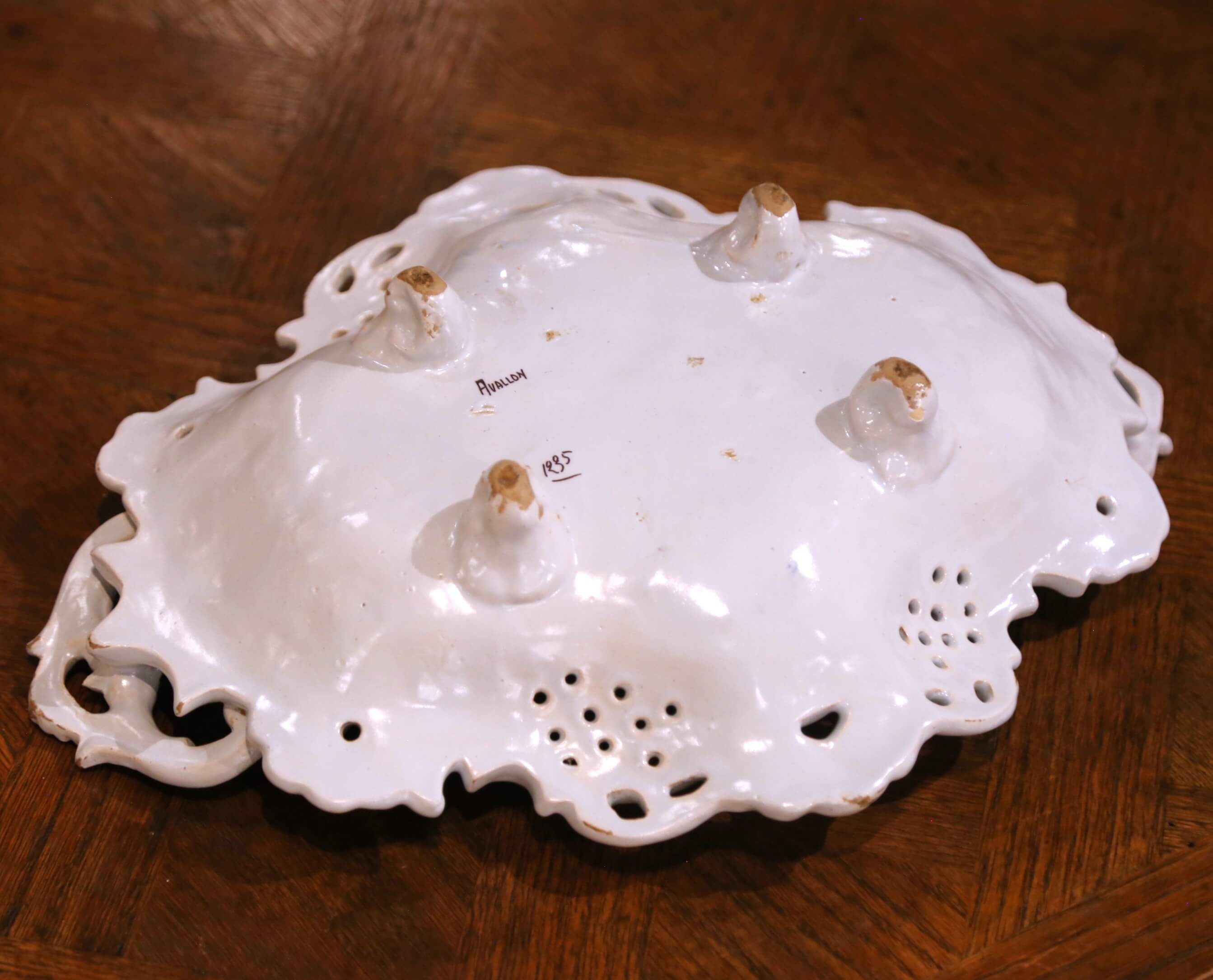 The openwork rim and shaped handles add movement and refinement, while the form rests on four small feet, giving the piece the presence of a sophisticated centerpiece or vide-poche. The underside bears a hand-painted “Avallon” mark along with a model number, indicative of production in Burgundy where faience workshops continued to reinterpret historic French ceramic traditions through the 19th century.