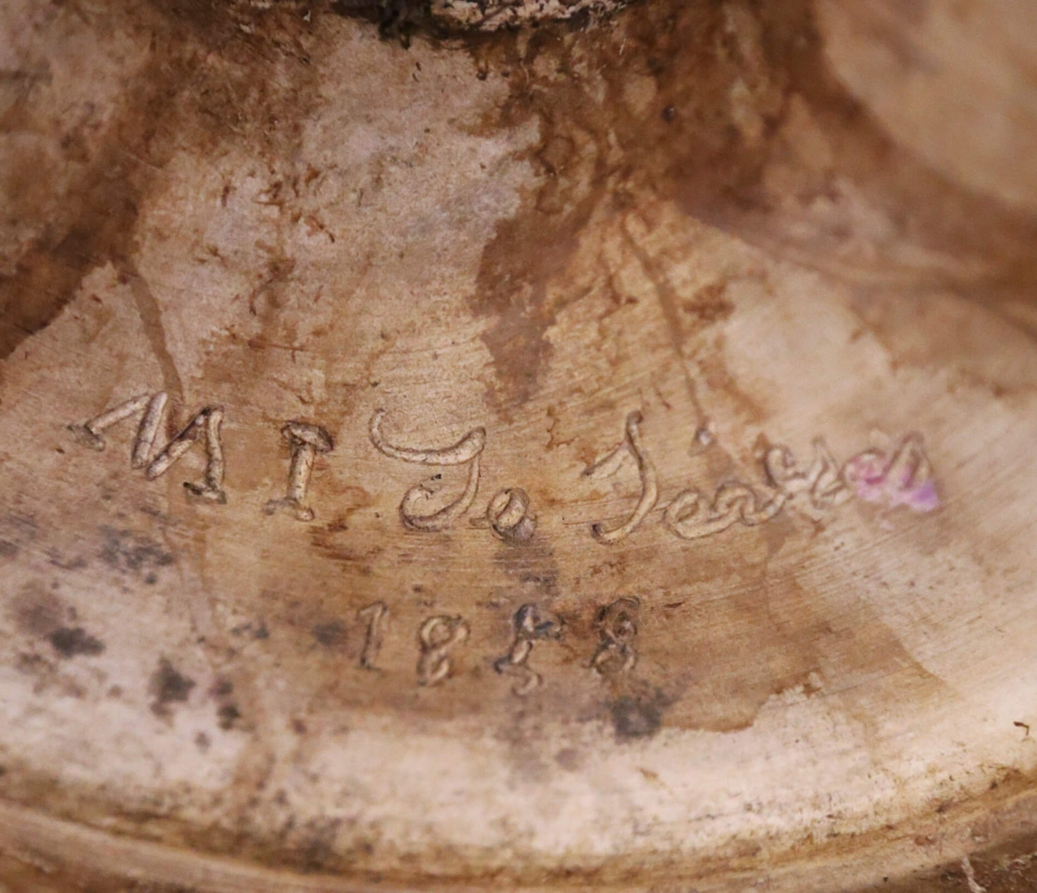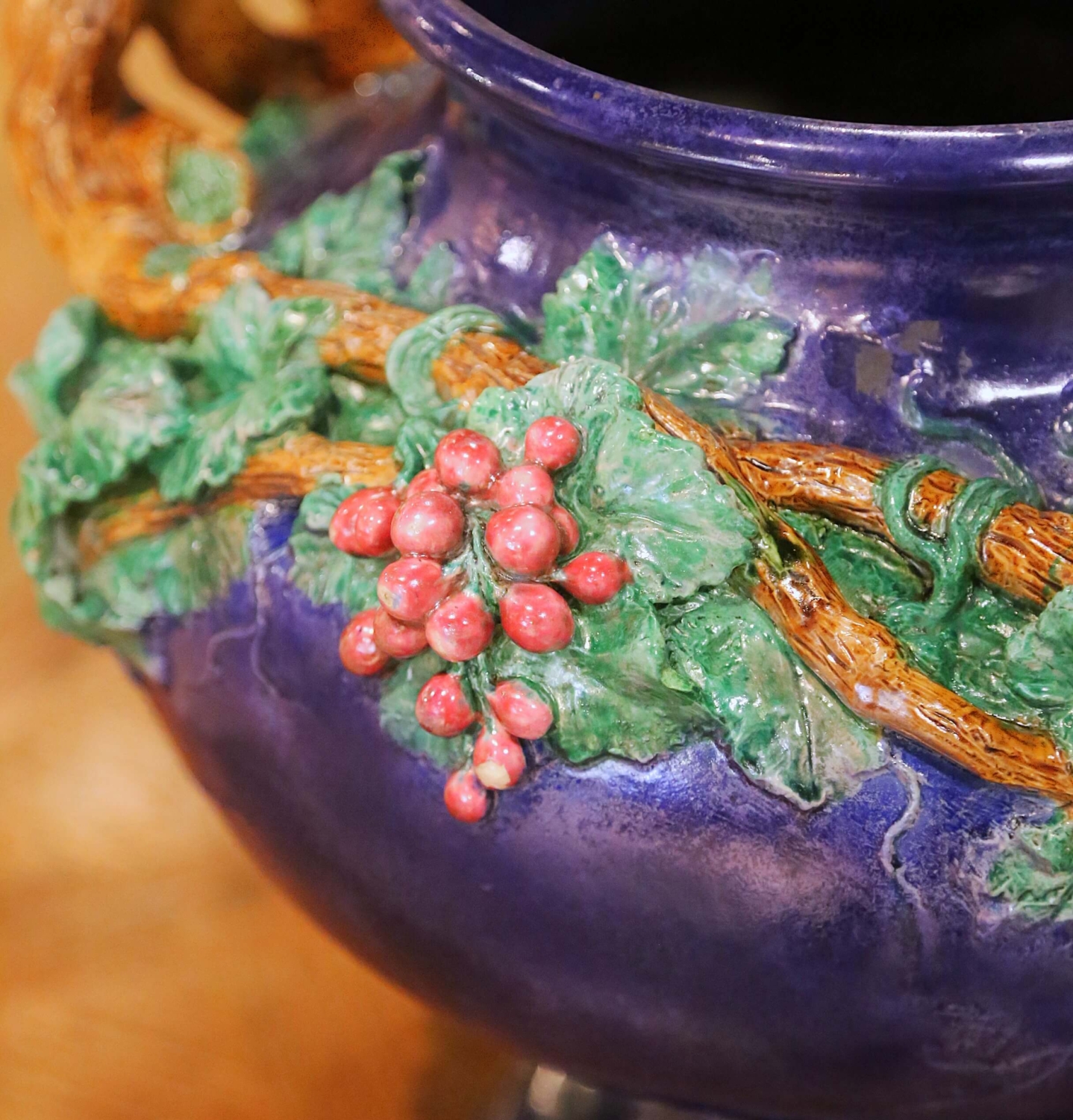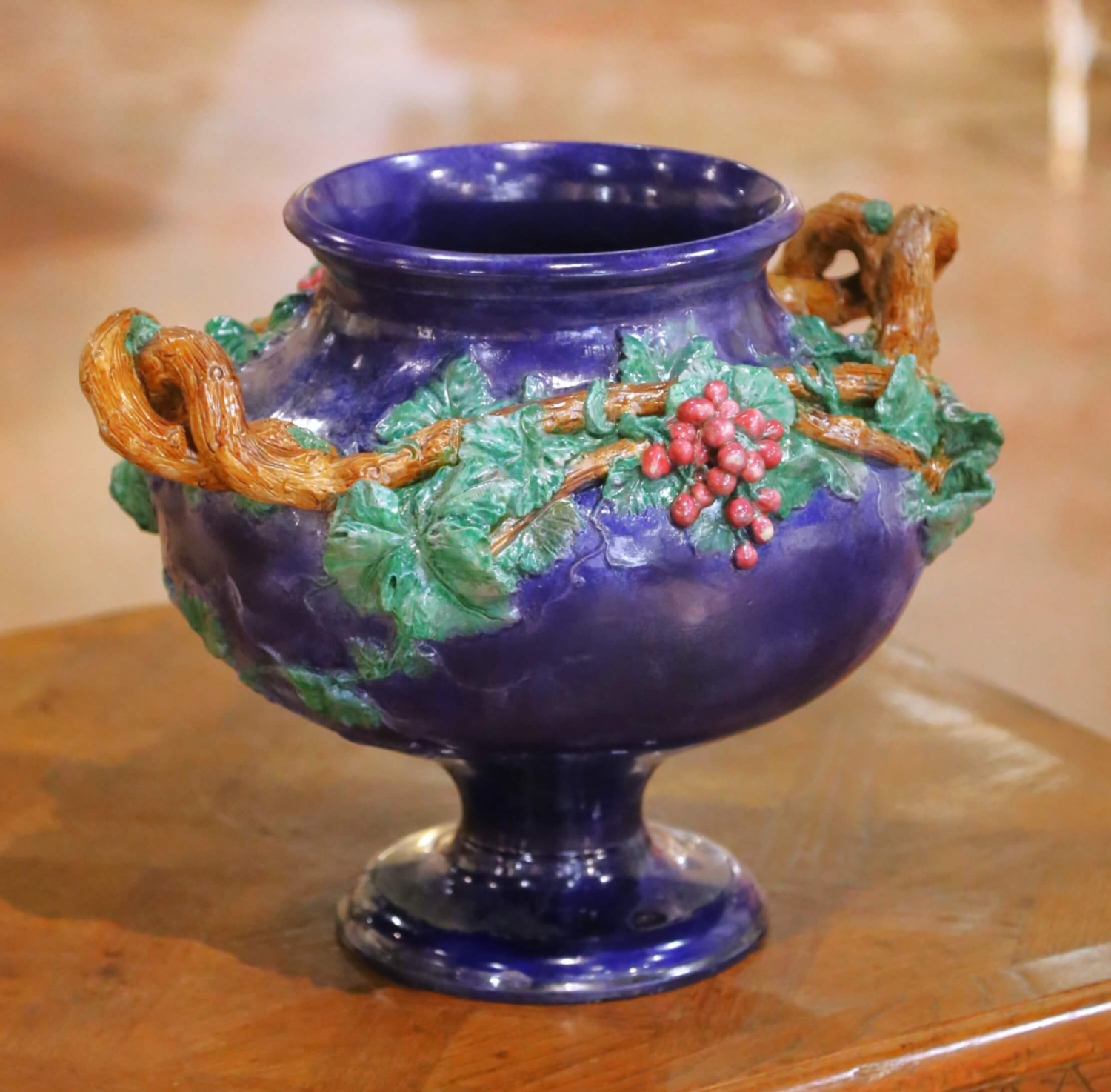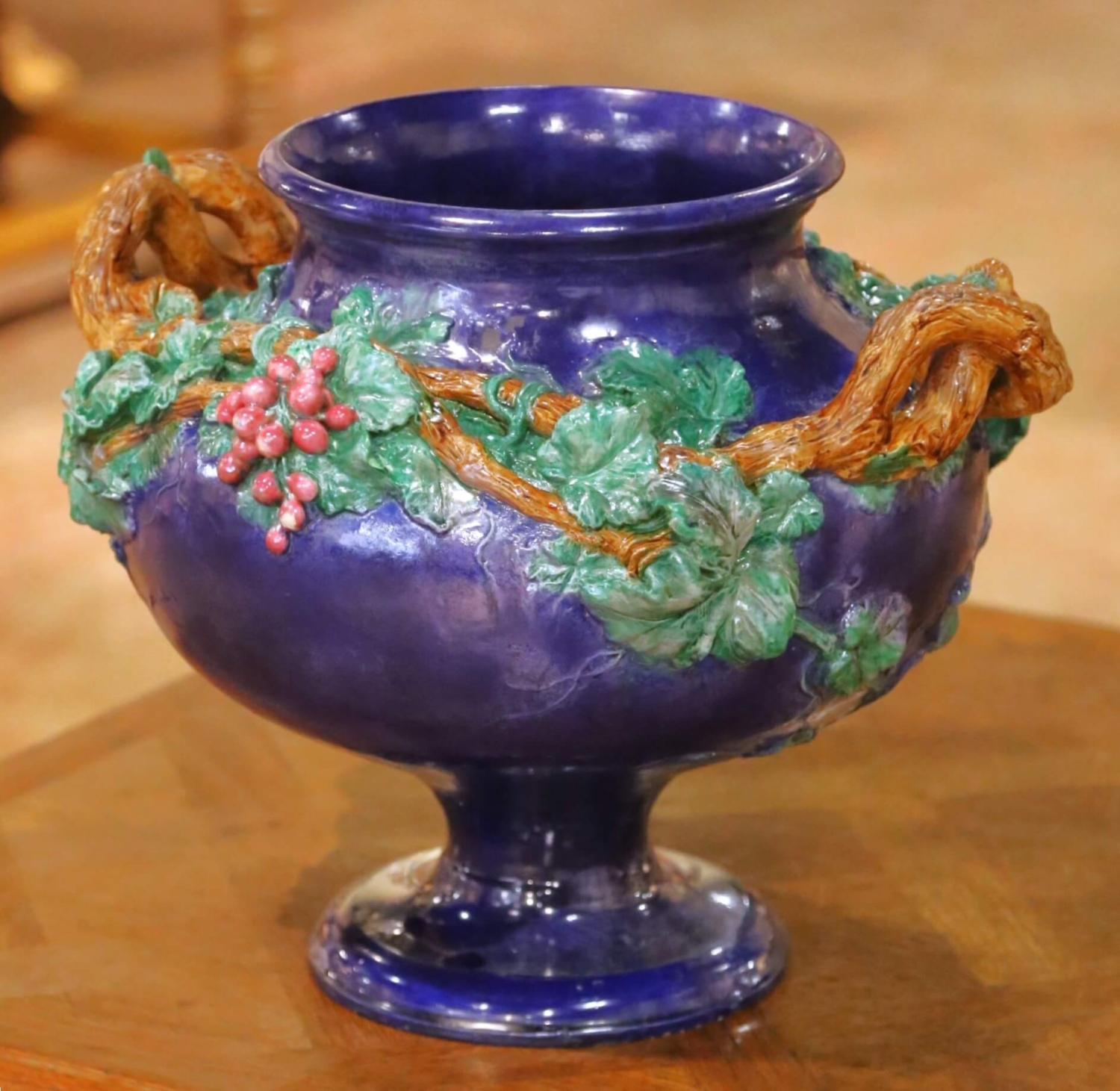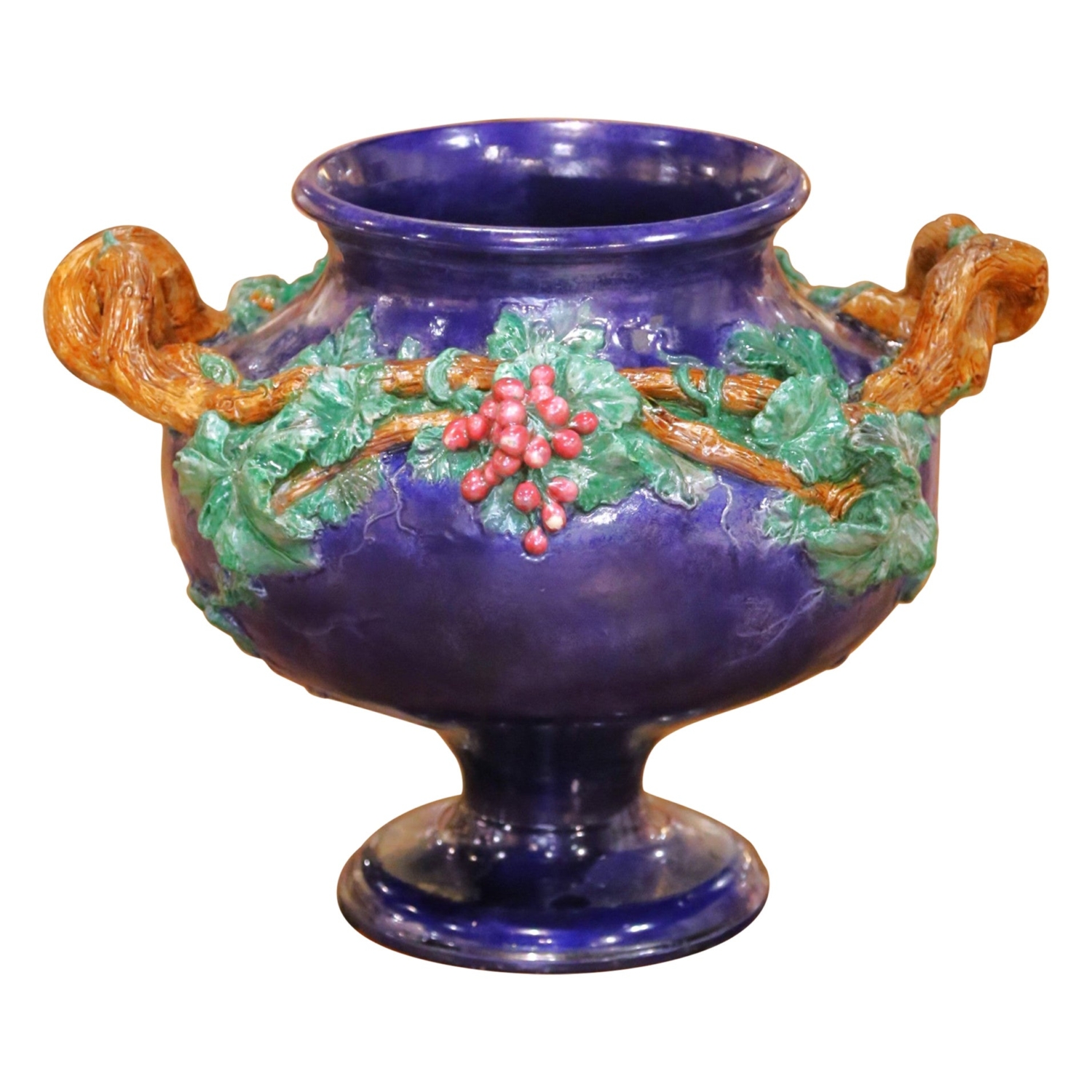 Crafted in France and signed and dated 1858, this striking antique barbotine pedestal urn features a richly glazed cobalt blue ground accented with sculptural grapevine garlands in high relief. The rounded body is encircled with naturalistic branches, textured leaves, and clusters of grapes modeled in vibrant green and red tones, creating strong depth and movement against the luminous blue surface. The classical campana form rests on a pedestal foot, giving the piece architectural presence while allowing the exuberant vineyard decoration to remain the focal point. The twisted vine handles emerge organically from the applied garlands, blending structure and ornament in true mid-19th century taste. The glaze shows beautiful pooling and tonal variation, consistent with hand-finished barbotine work of the period. The underside is incised “M I de Sèvres 1858.” The inscription appears hand-carved into the clay prior to firing and likely references a regional workshop rather than the official Manufacture Nationale de Sèvres, as the piece is earthenware and executed in relief barbotine rather than fine porcelain. The urn is in excellent antique condition commensurate with age and use, with minor glaze irregularities typical of early barbotine production. Dimensions: 17.5″W x 15″D x 13″H
