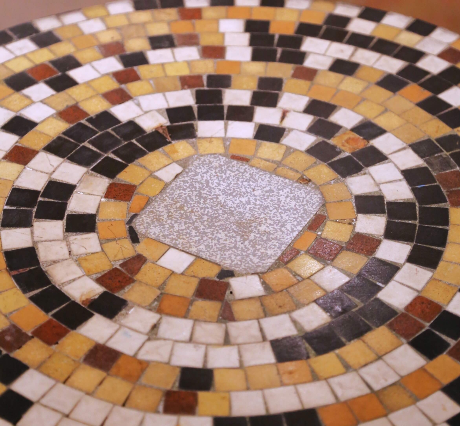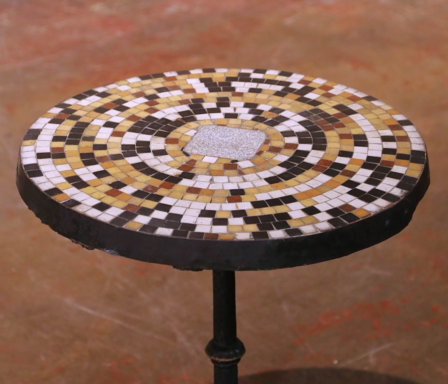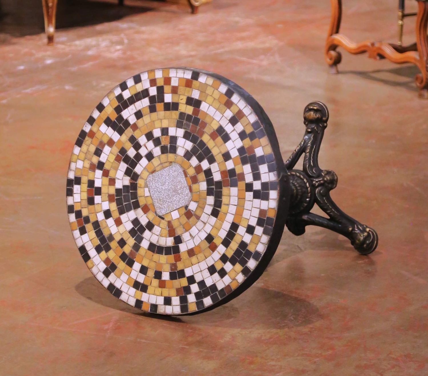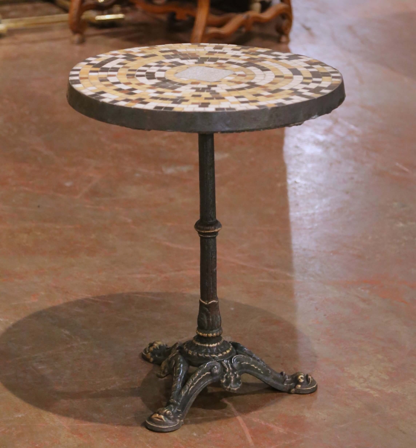 Crafted in France circa 1840, this elegant antique guéridon features a circular marble and stone mosaic top set within a thick iron frame. The round surface is composed of hand-cut tesserae arranged in concentric rings in warm tones of ochre, cream, rust, and deep brown, centered by a larger irregular marble medallion. The richly colored mosaic creates a lively geometric pattern while the timeworn surface displays minor wear consistent with its 19th century origins, enhancing its authentic antique character. The heavy top is supported by a slender turned iron pedestal raised on an ornate cast iron tripod base with scrolled Rocaille legs terminating in stylized pad feet. Subtle gilt highlights remain along the raised decorative elements, contrasting beautifully with the deep dark patina developed over time. Originally designed for intimate salon or café settings, this versatile antique guéridon can also be used outdoors on a covered patio, terrace, or garden loggia thanks to its durable iron construction and marble mosaic top. It would work beautifully between a pair of chairs, or as a charming bistro table. The piece is very solid and heavy for its size, weighing approximately 83 pounds. Excellent condition commensurate with age and use. Dimensions: 22.5″ Diameter x 28″H.