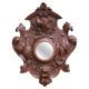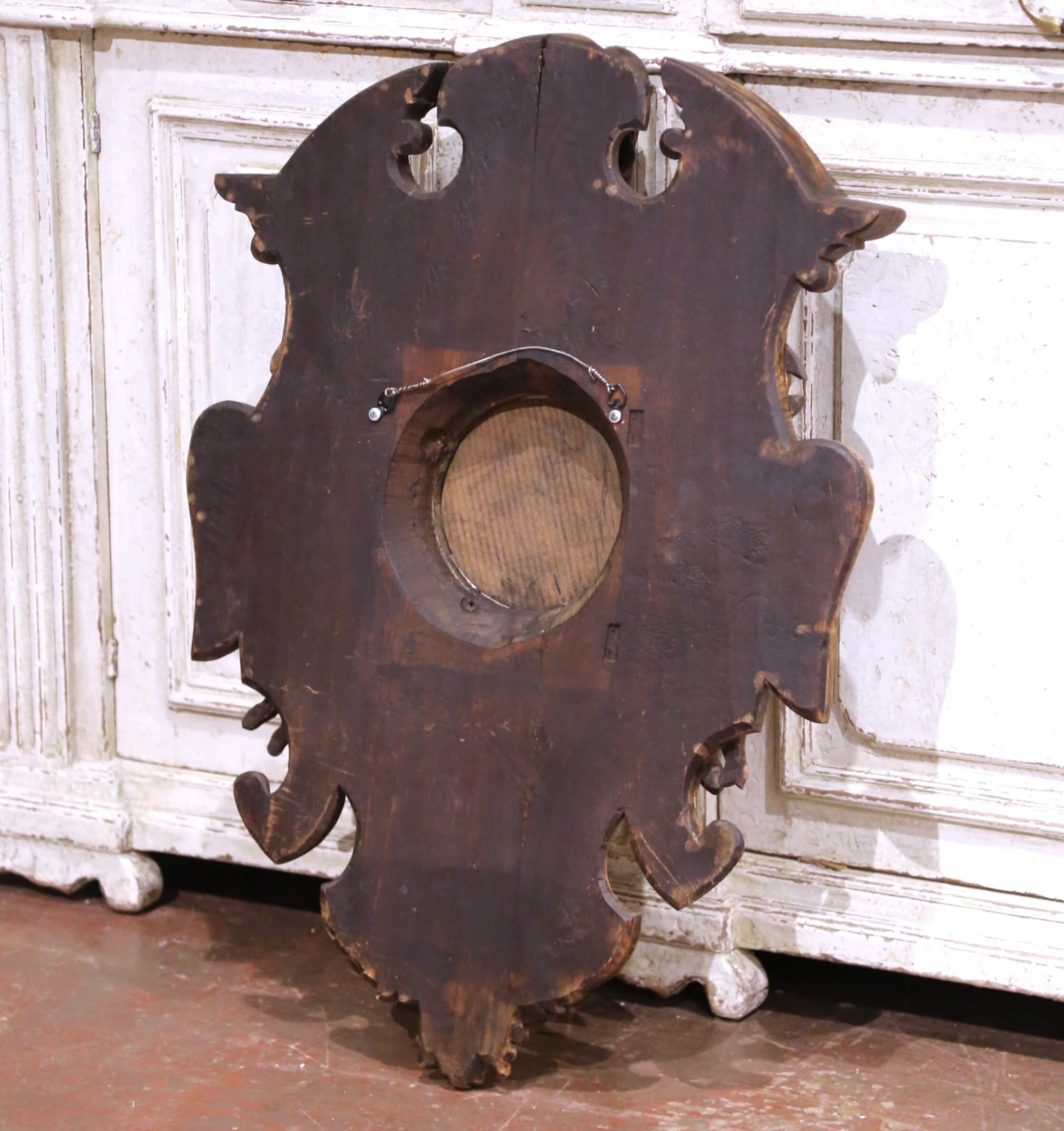 Bring bold Alpine character to a study, library, or lodge-inspired interior with this richly sculpted antique Black Forest panel, crafted in France circa 1880 and finished in a desirable light, bleached oak tone. Originally conceived as a decorative hunting plaque and fitted with a clock, the piece now incorporates a small circular mirror at its center, transforming it into a striking wall accent with both sculptural and reflective appeal. Expertly carved in deep relief, the panel features a dramatic menagerie of game and forest motifs: a prominently modeled fox head crowns the composition, while a hare and a squirrel flank the sides, each rendered with lifelike detail and expressive movement. Cascading foliage, ribbon-tied floral garlands, and abundant fruiting branches fill the background, all carved from solid oak with crisp chisel work characteristic of quality Black Forest craftsmanship. Scrolled volutes and a shaped lower cartouche complete the shield-like silhouette, giving the panel an architectural presence. The bleached finish highlights the grain of the oak and softens the traditionally dark Black Forest aesthetic, allowing the intricate carving to read with fresh clarity. The mirror shows age-appropriate foxing, complementing the panel’s warm patina. This antique 19th-century French carving is in excellent condition commensurate with age and use, and remains a distinctive decorative object for anyone seeking dramatic storytelling and artisanal detail. A true one of a kind! Dimensions: 24″ W x 4″ D x 33″ H