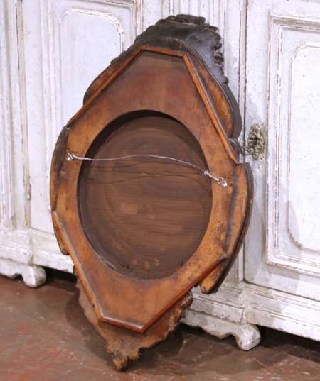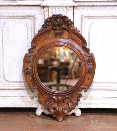 Enhance your home with this finely carved French Black Forest wall mirror, crafted circa 1880. Originally conceived as a clock housing, the piece has since been refitted with a round mirror plate, lending it both function and decorative appeal. The oak frame is richly carved in deep relief, featuring trailing floral garlands along the sides, a bold bouquet crest at the top, and scrolling acanthus ornamentation at the base. This antique French mirror displays a warm, well-preserved walnut-brown patina that accentuates the texture of the wood and the crispness of the carving, hallmarks of Black Forest craftsmanship. Measuring 20″ wide by 29″ high, it is a versatile size suitable for a hallway, bedroom, or above a console. In excellent condition commensurate with age and use, the mirror embodies both artistry and history, while its original purpose as a clock housing adds an intriguing layer of character.