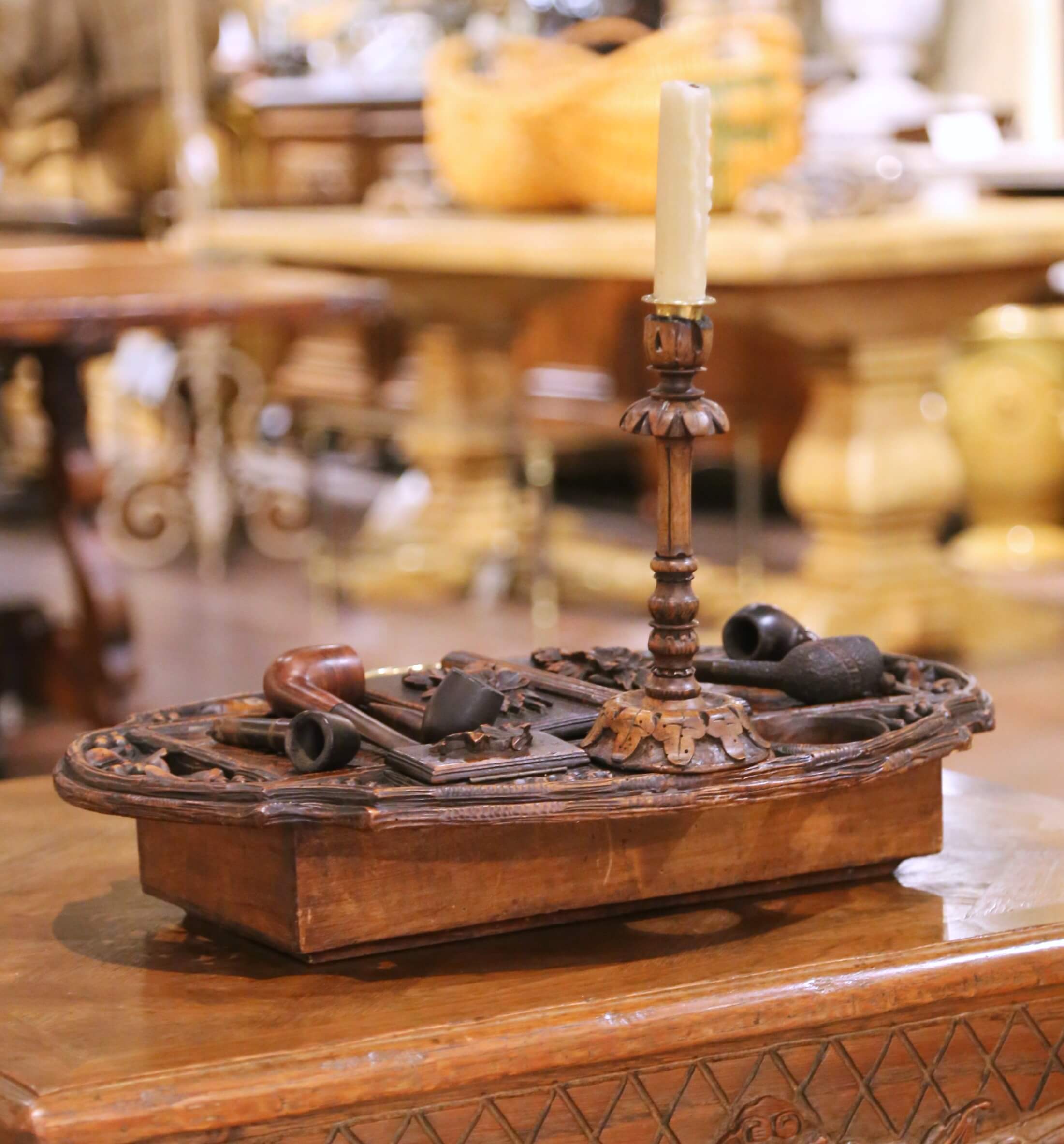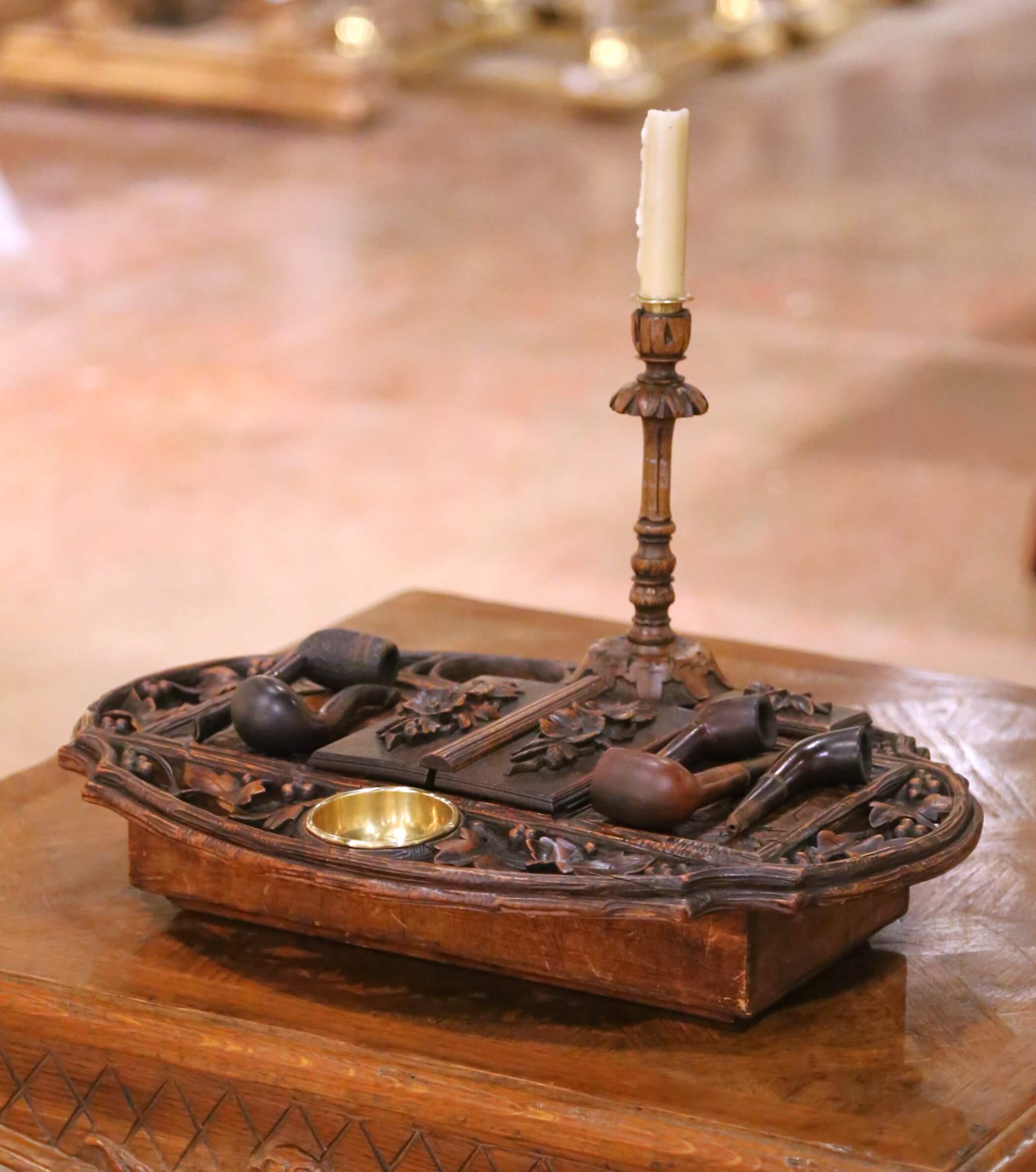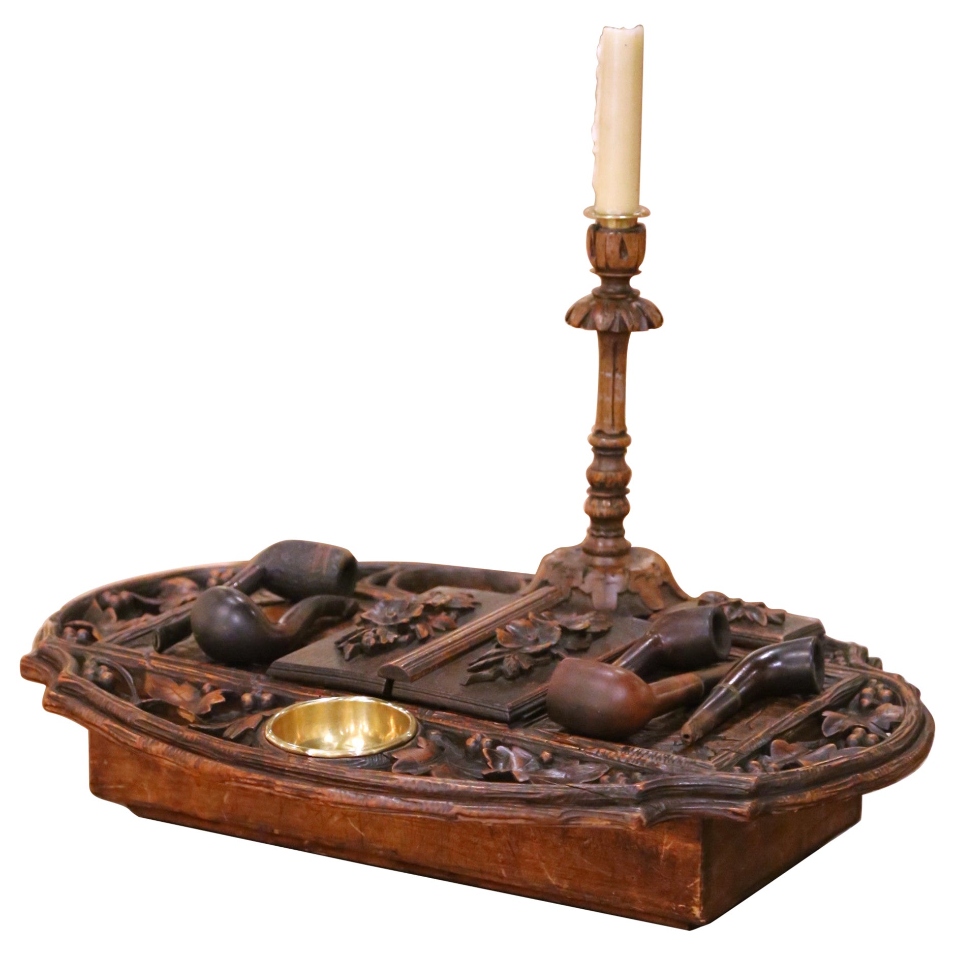 Rising from the center, a turned and carved candlestick adds both verticality and ambiance, reinforcing the piece’s intended use in a refined smoking or writing environment. The ensemble is accompanied by a group of period pipes, enhancing both authenticity and presentation.