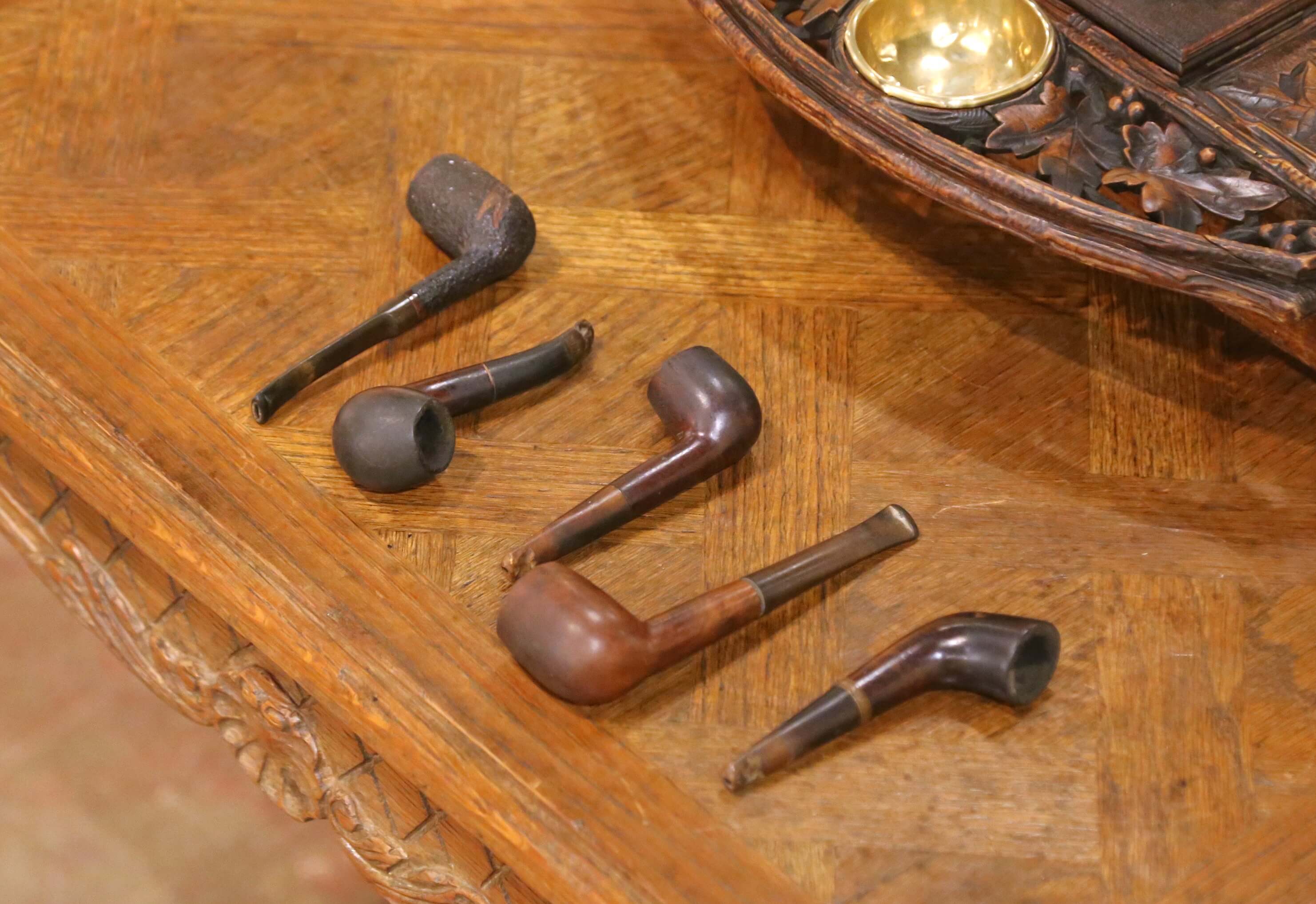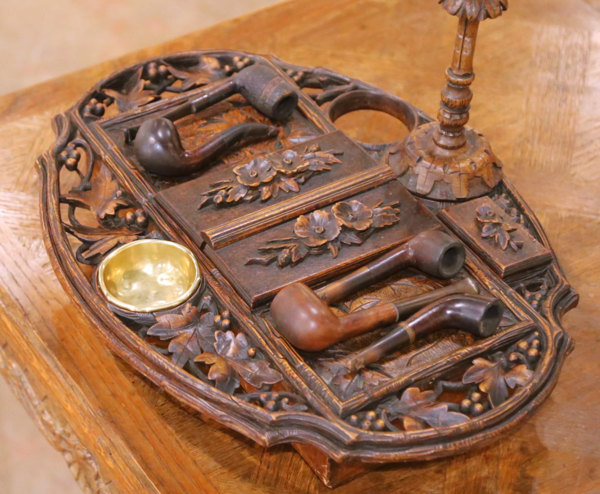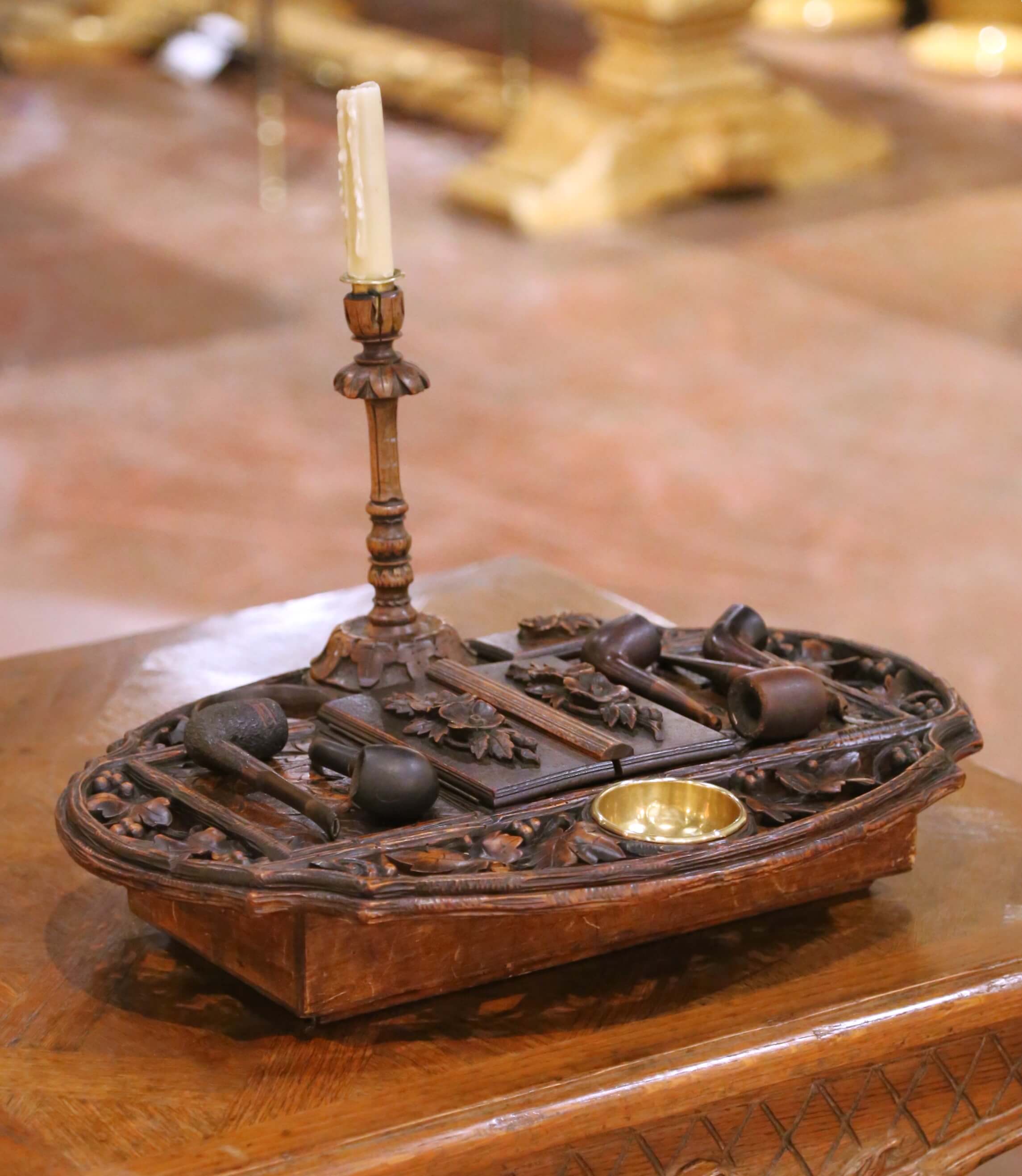 Rising from the center, a turned and carved candlestick adds both verticality and ambiance, reinforcing the piece’s intended use in a refined smoking or writing environment. The ensemble is accompanied by a group of period pipes, enhancing both authenticity and presentation.