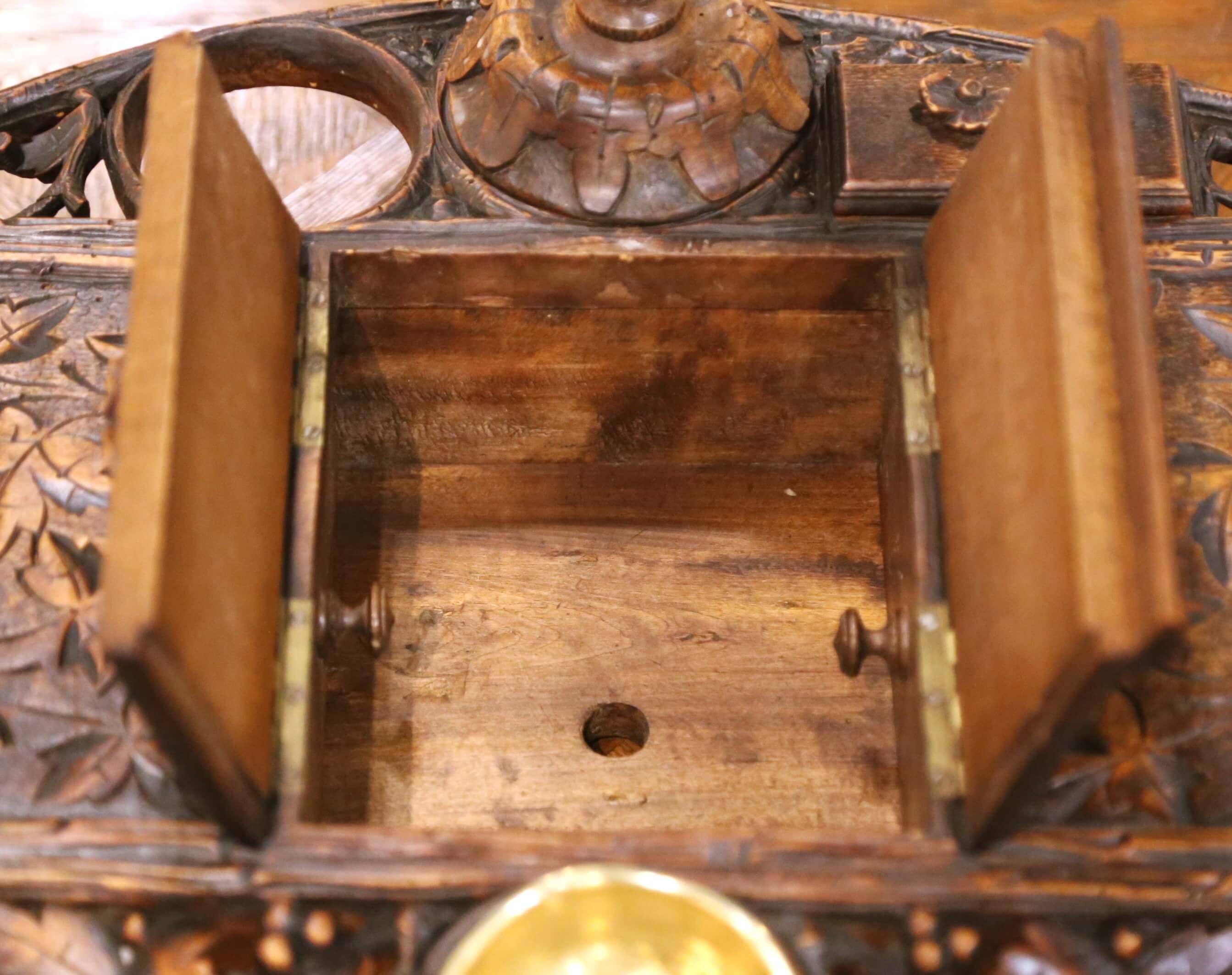 The fitted top is thoughtfully arranged with multiple functional elements. At the center, a hinged compartment opens to reveal divided interior storage, ideal for organizing pipes or tobacco. Flanking compartments with carved lids provide additional storage, including a mall box suitable for matches. A circular opening at the front is designed to hold an inkwell or removable insert, while the inset brass cup serves as an ash receiver or match holder.