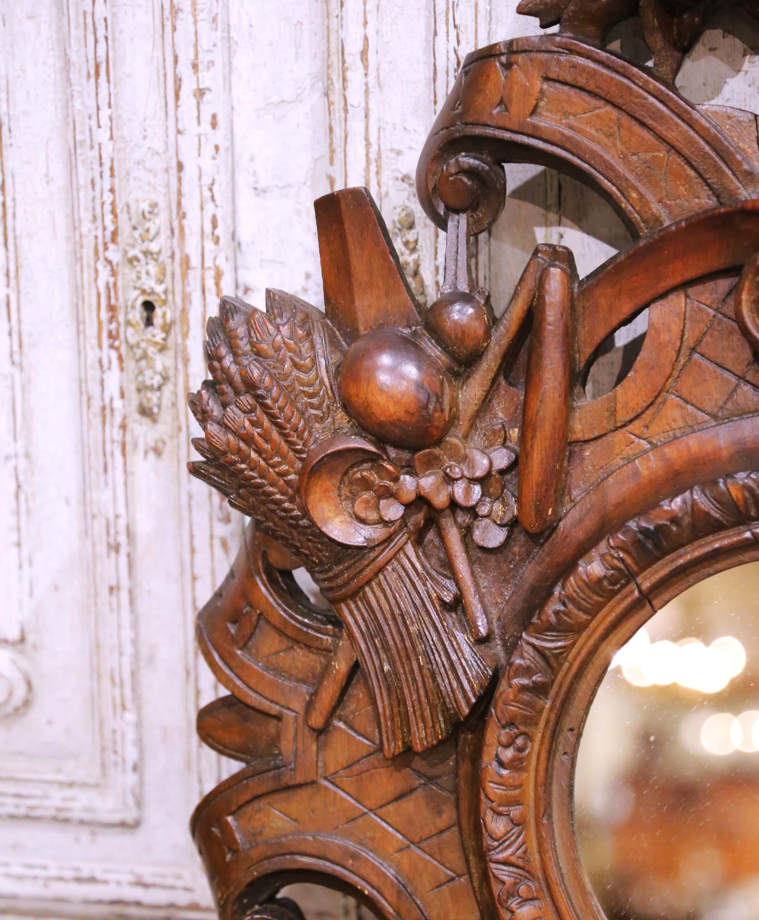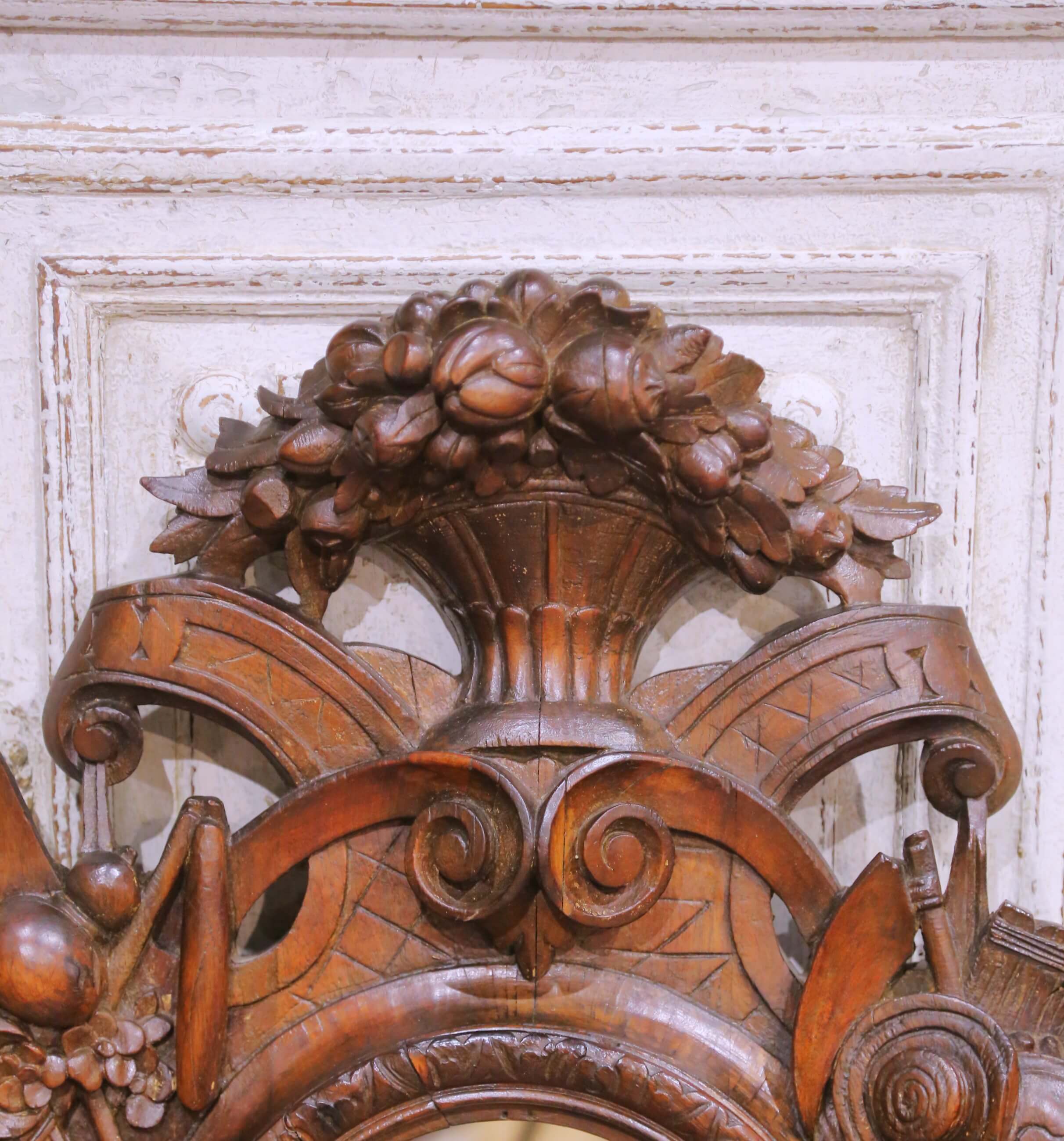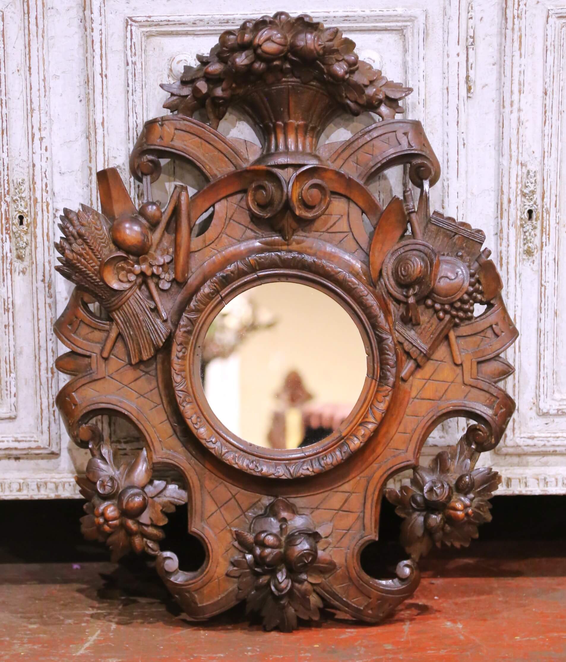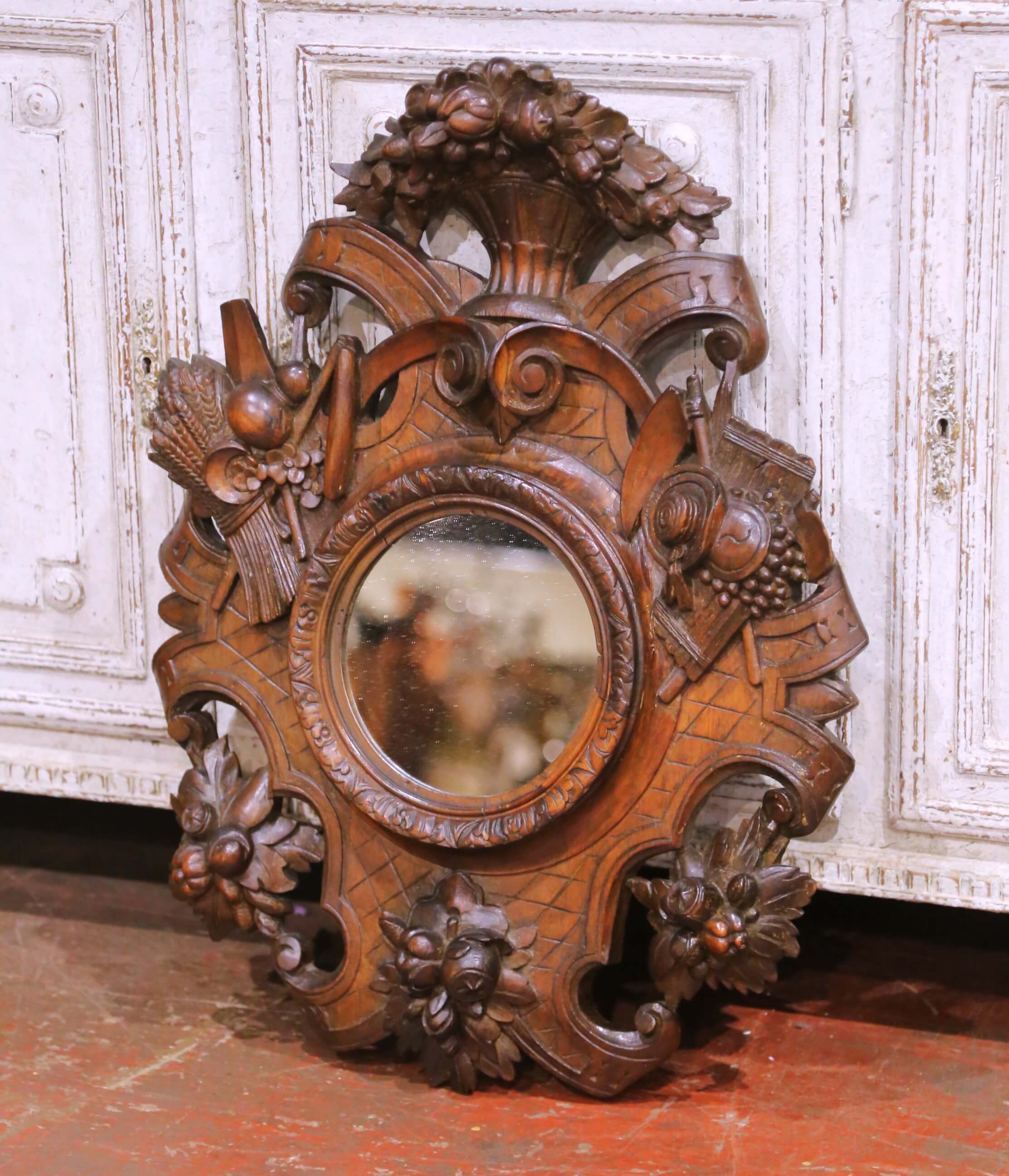 Decorate a study, hunting lodge, or rustic interior with this richly carved antique French oak mirror, crafted circa 1860 in the Black Forest style. The sculptural frame is densely ornamented with high-relief carvings of game, fruit, and foliage, including hanging game birds, clusters of grapes, and carved ribbons, all arranged around a central round mirror plate. The crest is crowned with a basket overflowing with carved fruit, adding height and dramatic presence to the composition.