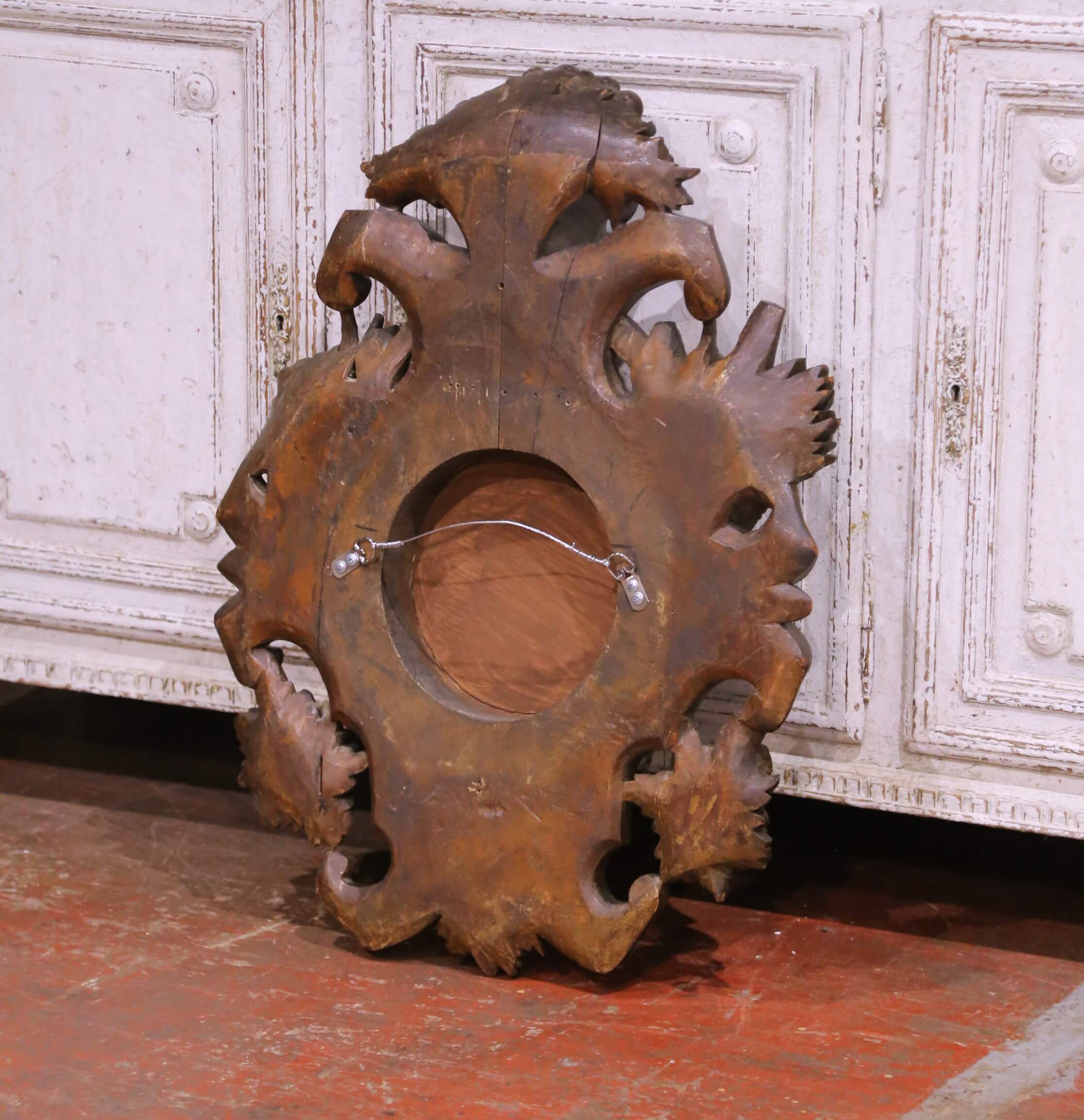 The deeply carved oak surface showcases a warm and rich patina, highlighting the exceptional craftsmanship and dimensional quality of the relief work. The openwork silhouette and layered carving create movement and shadow throughout, giving the piece a bold, decorative presence from every angle.