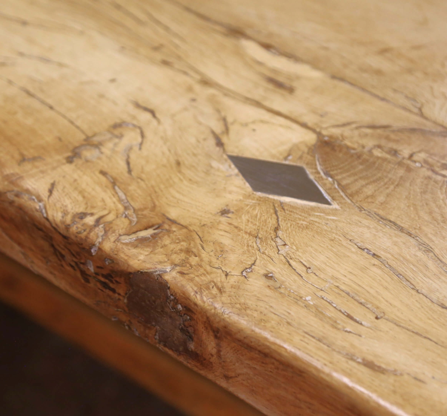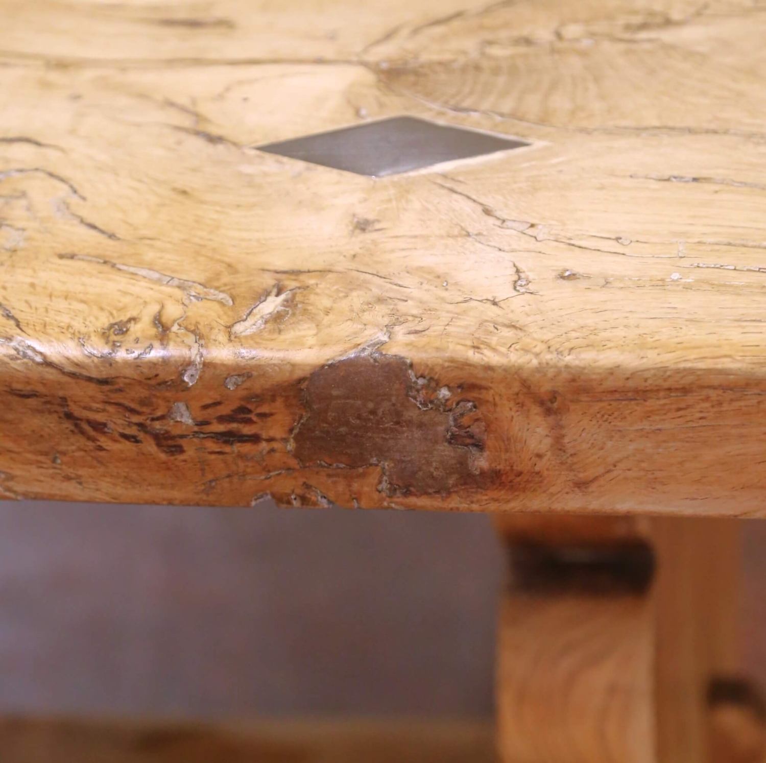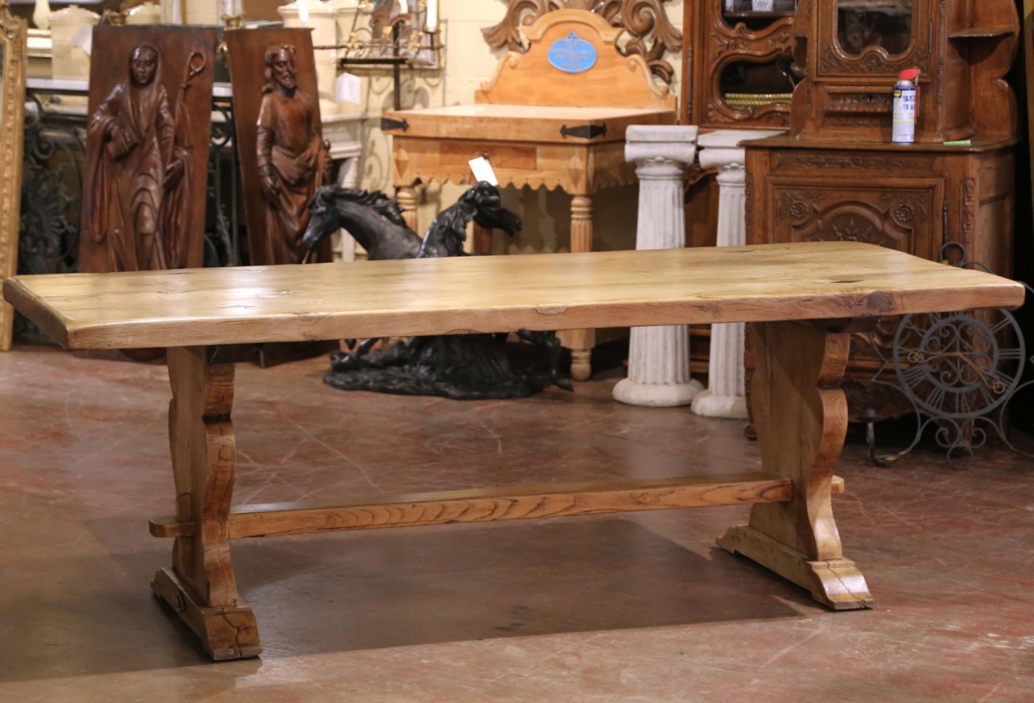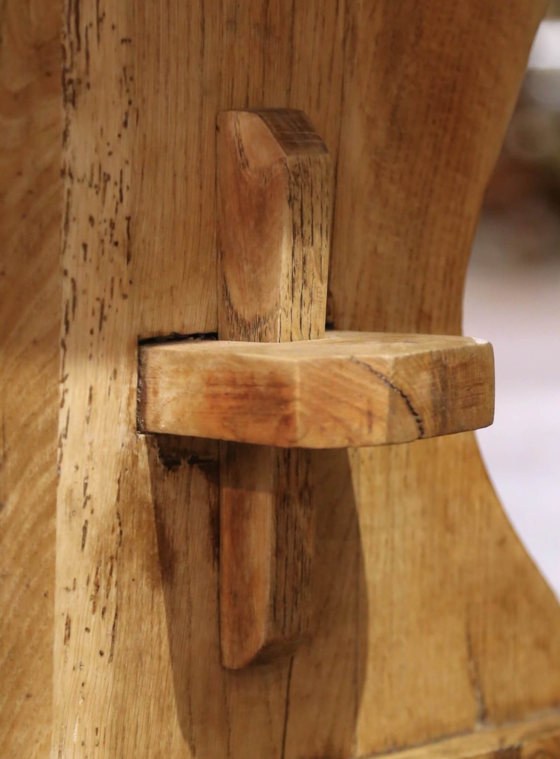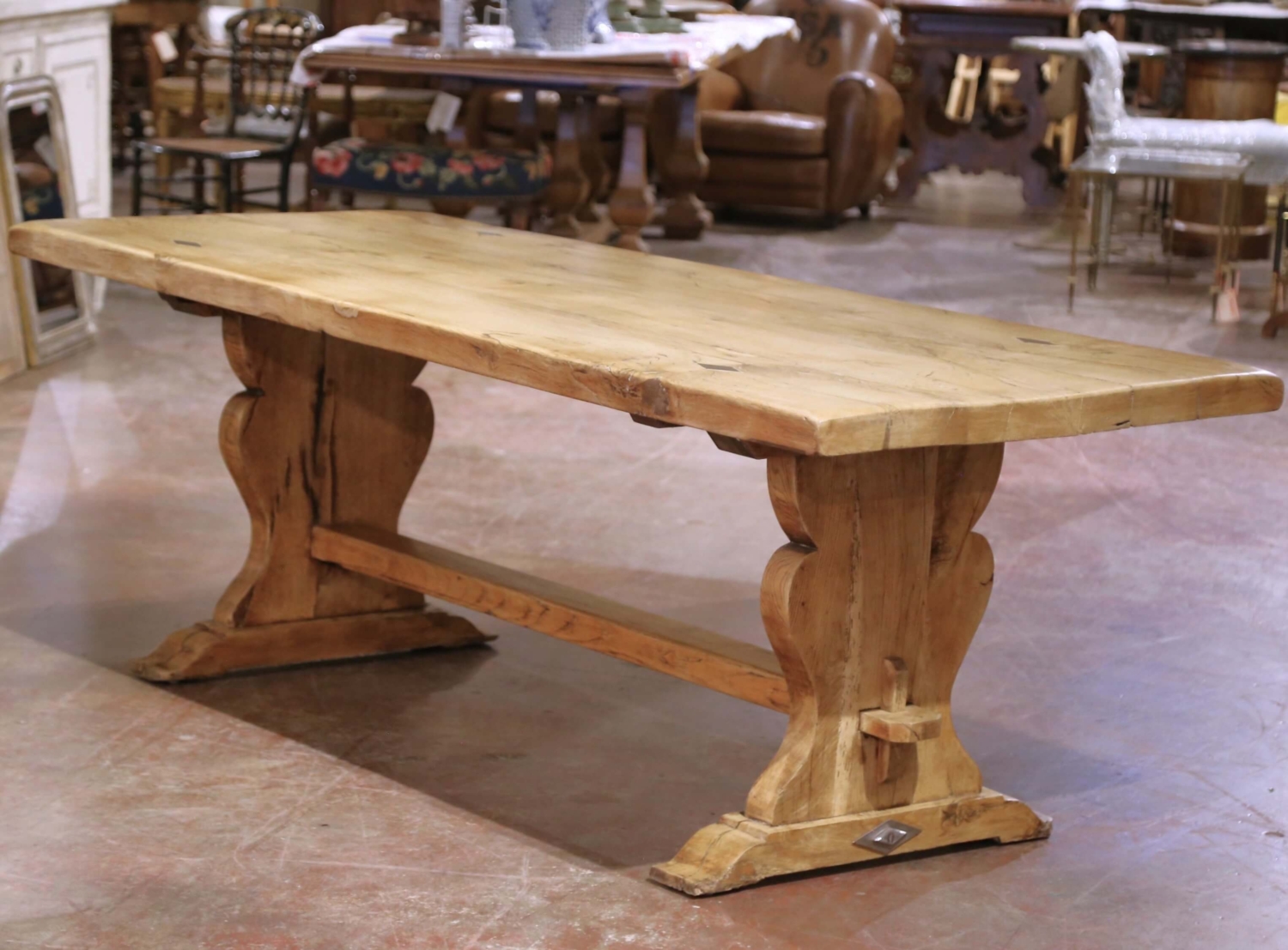 Bring understated provincial character to a dining room or kitchen with this handsome antique French trestle refectory monastery dining table, crafted in France circa 1880 from solid oak in the traditional French Provincial farmhouse style. The long rectangular plank top displays attractive end grain patterns, gentle surface wear, and visible wooden pegs, all bearing witness to decades of use and imparting a warm, timeworn patina prized in authentic country furniture. Forged iron diamond nails accent the top and base, adding subtle decorative detail while reinforcing the table’s honest rural construction. The table is supported by sculptural carved trestle bases joined by a substantial center stretcher, with shaped feet and traditional mortise and tenon joinery that speak to its durable craftsmanship. Sturdy, well balanced, and rich in rustic charm, this antique French refectory table is ideal for anchoring a dining room, breakfast nook, wine cellar, or country style kitchen, offering both everyday functionality and enduring provincial elegance. Excellent condition overall commensurate with age and use, with a warm bleached finish. Measures: 86.25″ W x 35″ D x 30″ H.