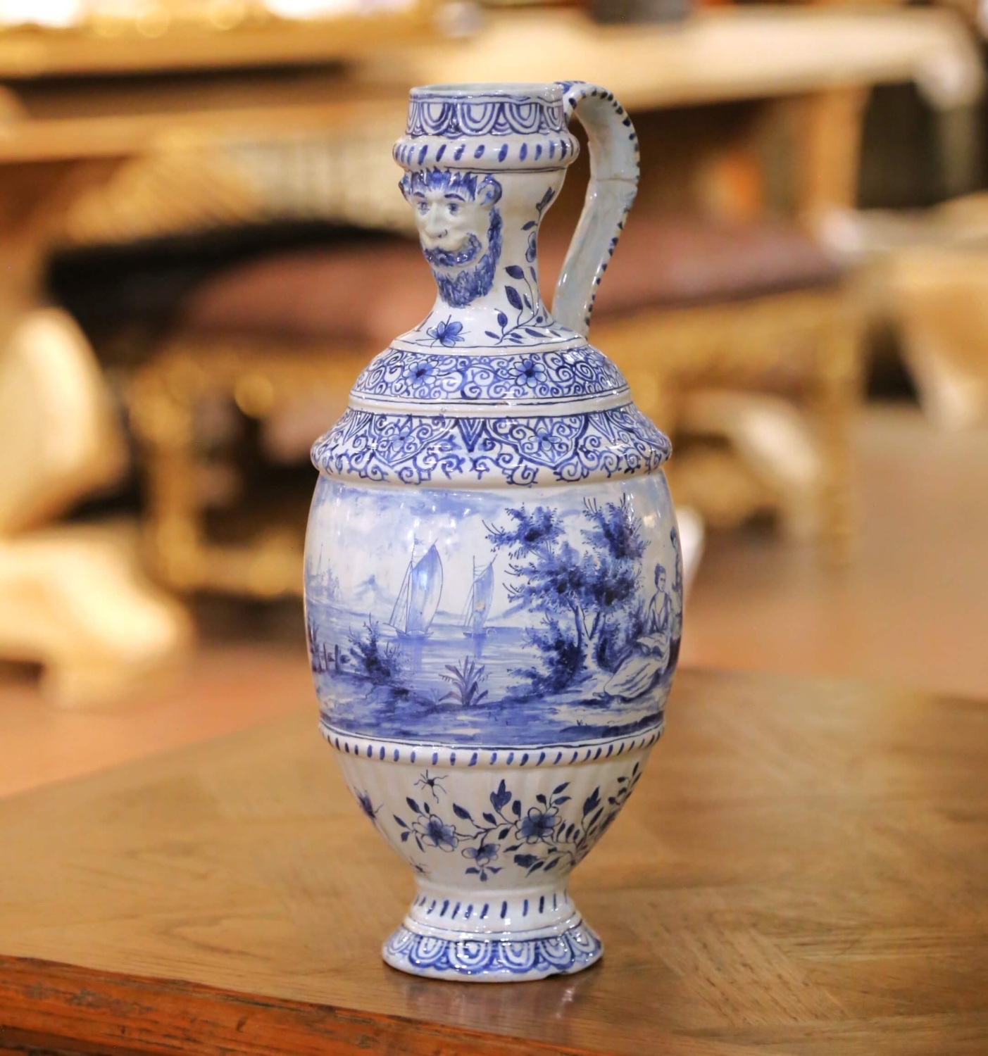 Bring classic European charm to a buffet, console, or dining-room display with this elegant antique French faience ewer, crafted in France circa 1880. Hand-painted in traditional cobalt blue on a warm white glaze, the pitcher features a baluster form richly decorated with scrolling floral motifs, geometric borders, and pastoral vignettes of courting couples and sailboats. The neck is adorned with a sculpted bearded male mask, a whimsical detail typical of 19th-century provincial pottery. The shaped handle shows delicate blue striping, while the footed base is embellished with stylized arches and botanical flourishes. The underside bears a painter’s mark, “A / 28.” The tall pitcher is in very good condition with light glaze irregularities consistent with age and use, enhancing its timeworn character. Repair on the handle. See detailed images. Dimensions: 6.5″ W x 5.5″ D x 13.75″ H