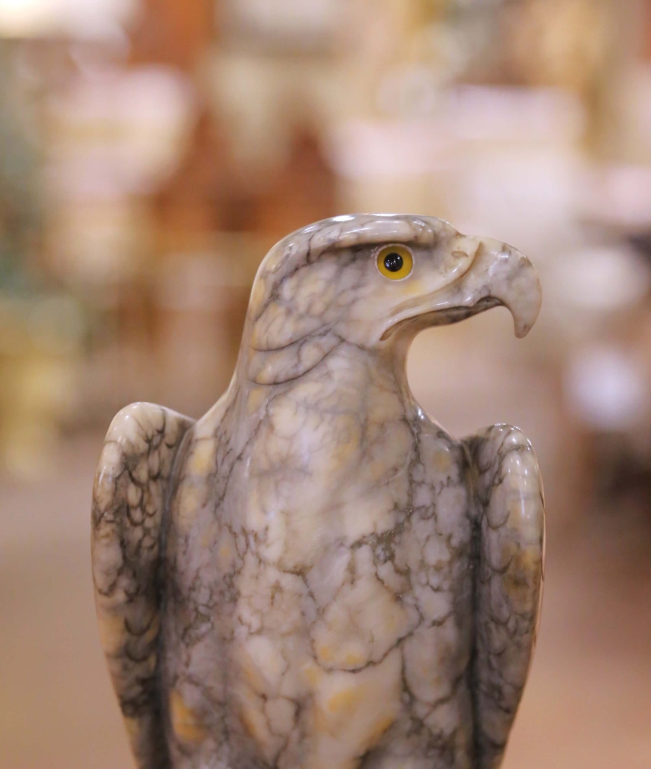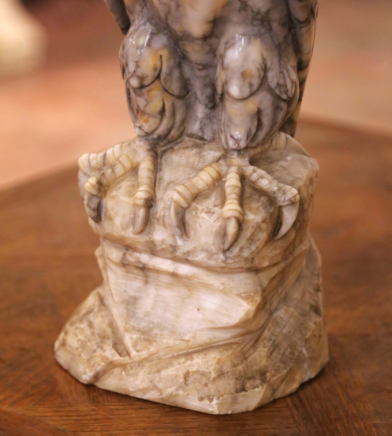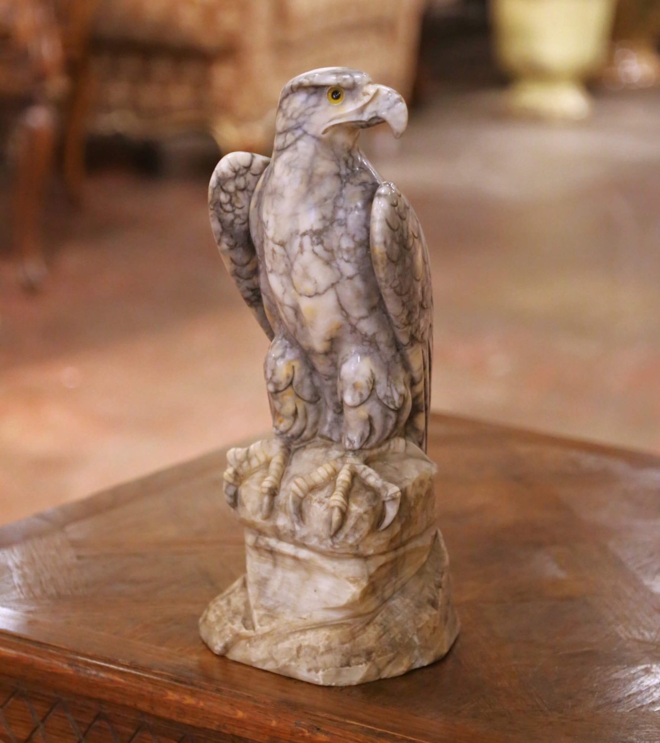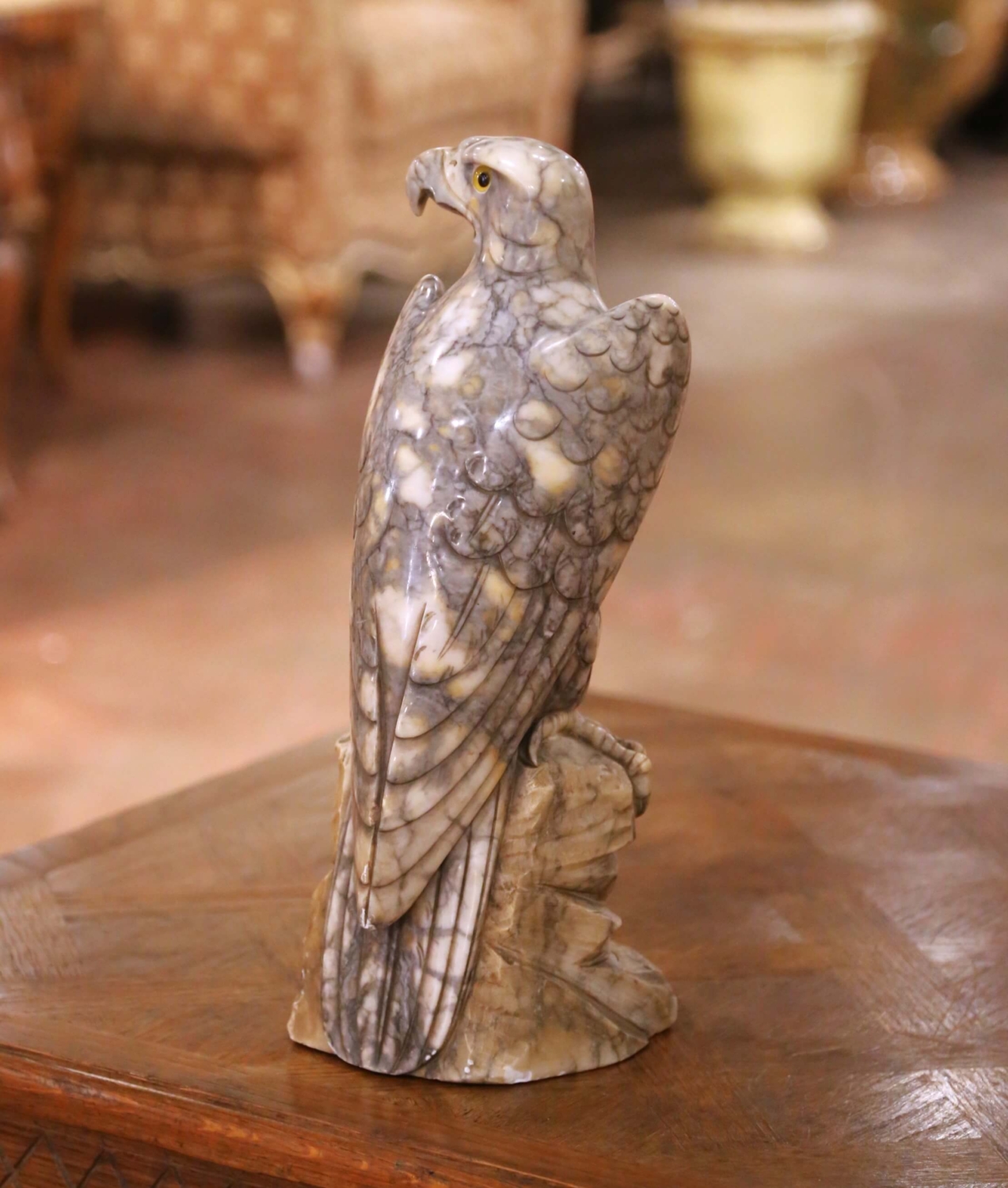 This striking antique eagle sculpture was carved in France circa 1880 and beautifully captures the commanding presence of a bird of prey in refined naturalistic detail. Sculpted from a single block of variegated marble, the figure stands firmly atop a faceted rocky base, its powerful talons gripping the stone with convincing tension and realism. The marble displays dramatic natural veining in tones of smoky gray, cream, and warm beige, which enhances the feathered surface and adds remarkable depth and movement to the carving. Finely incised plumage along the wings and body is subtly defined, while the inset yellow glass eyes bring an arresting lifelike intensity to the eagle’s forward gaze. Both sculptural and decorative, this 19th century French antique blends academic realism with strong decorative presence. Ideal for a library, study, or curated collection of animal sculptures, it makes a bold yet elegant statement. Excellent condition commensurate with age and use, with light surface wear consistent with the material. Dimensions: 6.5″W x 6.75″D x 15.75″H