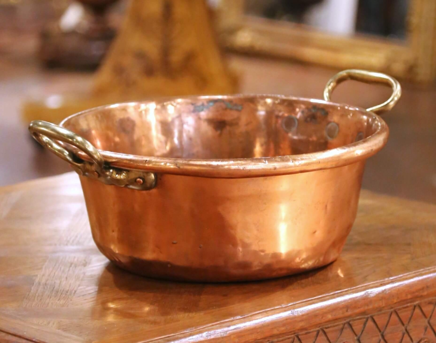 Bring a touch of authentic French countryside charm to your kitchen with this large 19th-century copper marmalade bowl. Crafted in Normandy, France circa 1880, this traditional bassine à confiture (jam pan) features a classic round form with two sturdy brass side handles secured with hand-hammered rivets. The richly polished copper surface gleams with warmth, reflecting the rustic elegance of a provincial kitchen. In good condition commensurate with age and use, this versatile antique can still serve its original culinary purpose, or be repurposed as a punch bowl, wine or beer cooler, or even as a striking centerpiece planter or cachepot. Some denting on the bottom see detailed images. Measures: 18″W x 14.5″D x 6.75″H.