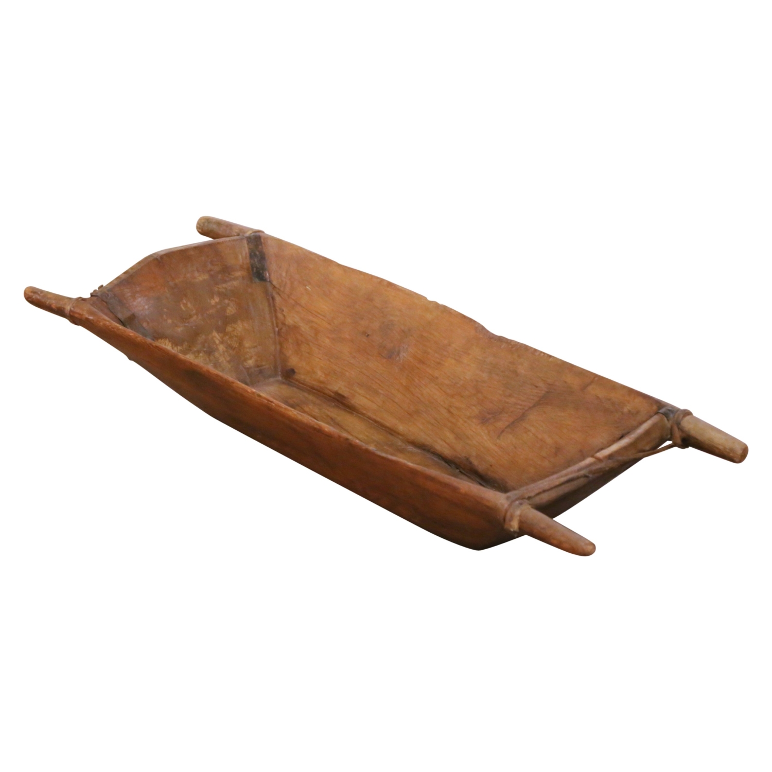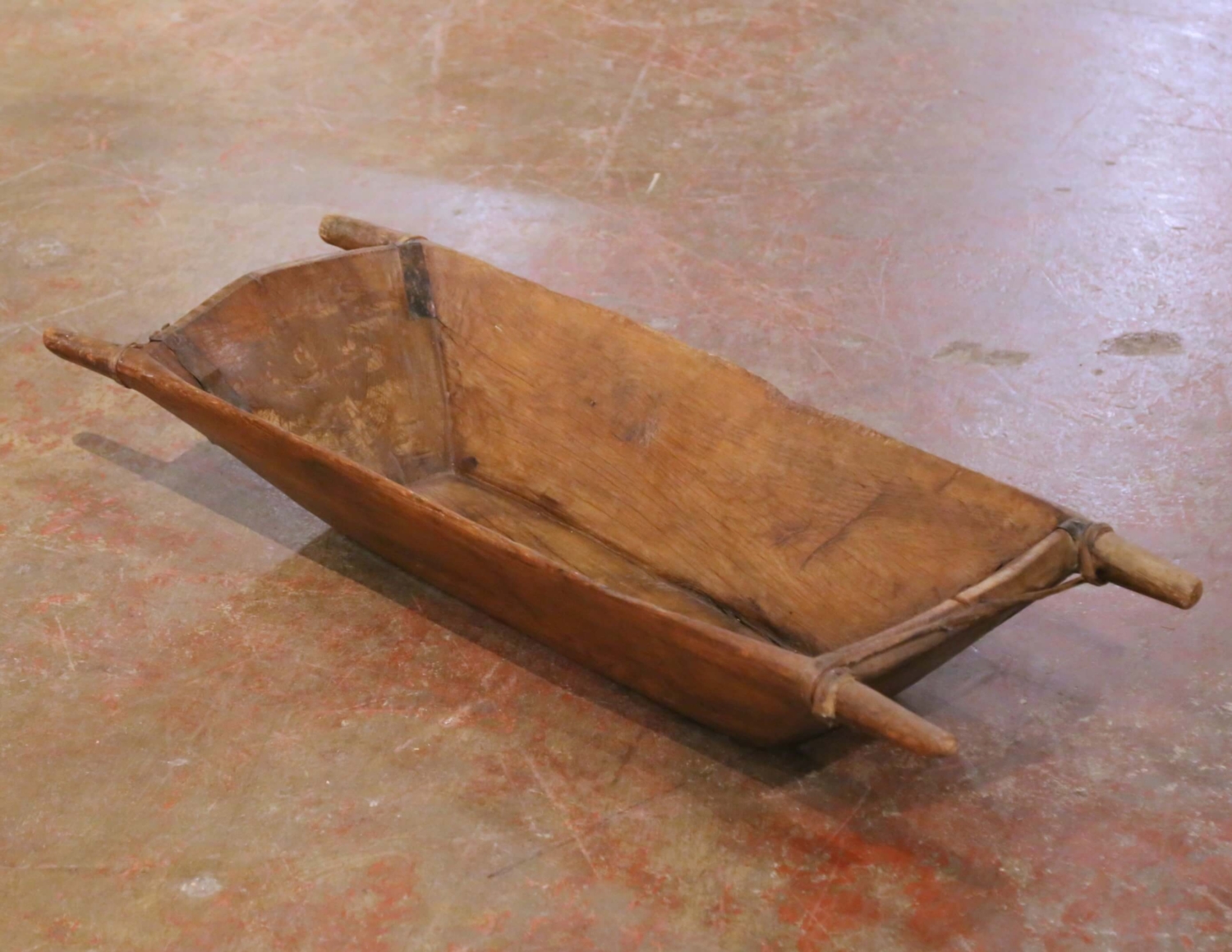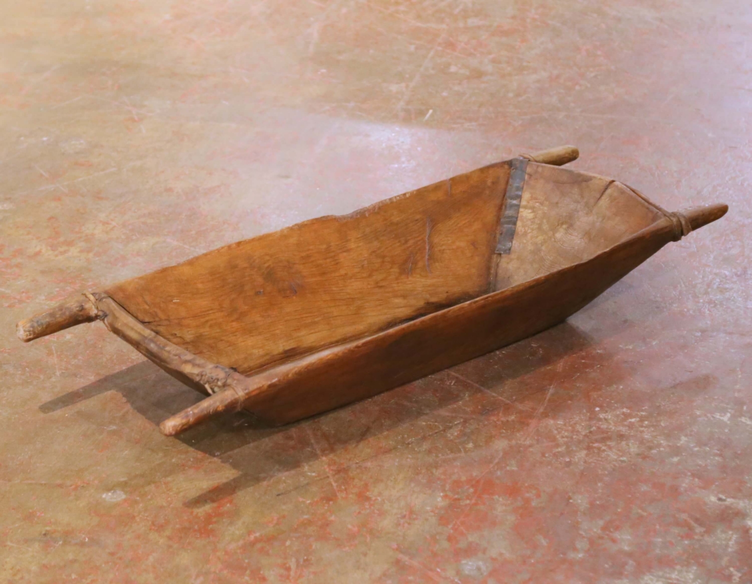 This authentic antique French dough bowl was hand-carved in France circa 1880 from a single solid block of elm, a wood traditionally prized for bread-making due to its durability and resistance to splitting. The elongated oval form with thick walls and generous depth reflects its original use for mixing and kneading dough in a provincial kitchen. The bowl features integral carved handles at each end and retains visible adze and gouge marks from its hand-hewn construction. The surface shows a rich, naturally developed patina with darker areas from long use, along with age-related shrinkage cracks, old worm holes, and knot openings, all consistent with authentic antique characterThe bowl is in excellent condition commensurate with age and use. Today, this antique dough bowl works beautifully as a decorative centerpiece on a farmhouse table, kitchen island, or console, ideal for displaying fruit, bread, or seasonal arrangements in French country, rustic, or wabi-sabi interiors. 45.5″W x 16.25″D x 7″H