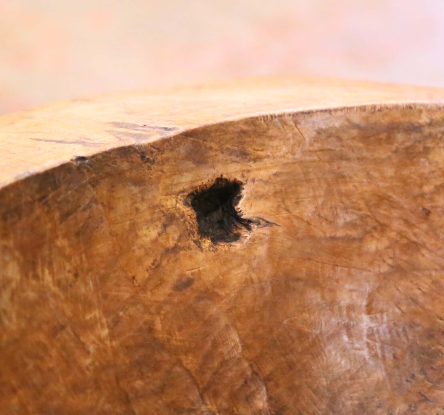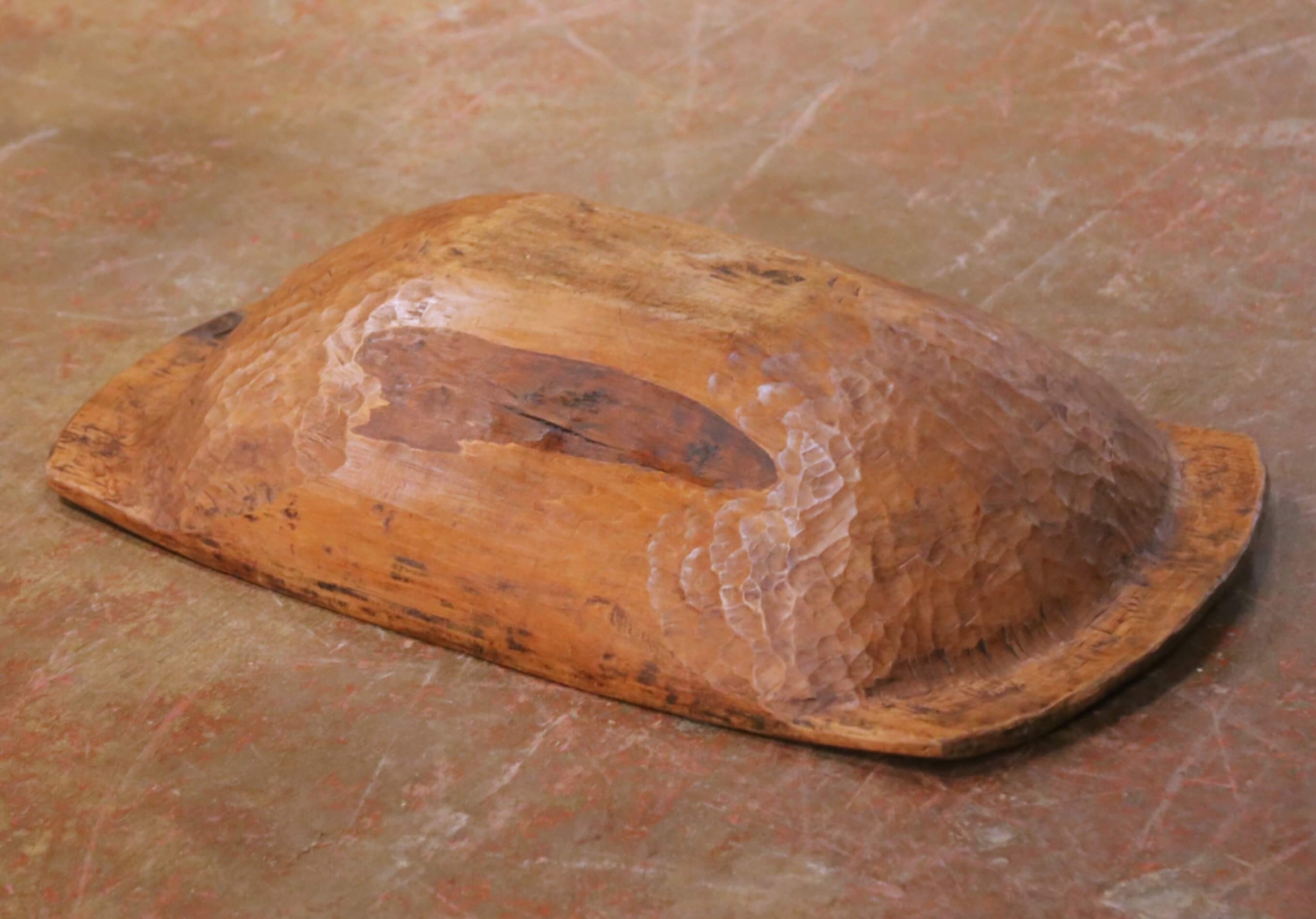 This authentic antique French dough bowl was hand-carved from a single solid block of elm in France circa 1880 and reflects the honest, utilitarian craftsmanship of traditional French kitchens. The elongated oval form features generous depth, thick walls, and integral flat handles at each end, making it well suited for mixing and kneading dough. The interior and exterior retain visible adze and gouge marks, highlighting its hand-hewn construction, while the surface displays a rich, time-softened patina with darkened areas from long use, along with natural shrinkage cracks, scattered worm holes, and an old knot opening, all consistent with age and authentic antique character. Today, this antique dough bowl makes a striking decorative centerpiece on a farmhouse table, kitchen island, or console, perfect for displaying fruit, bread, or seasonal arrangements, and adds rustic character to French country, primitive, or wabi-sabi interiors. The piece is in excellent condition commensurate with age and use. Dimensions: 31.5″W x 18.75″D x 7.5″H