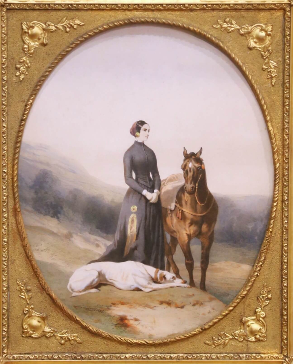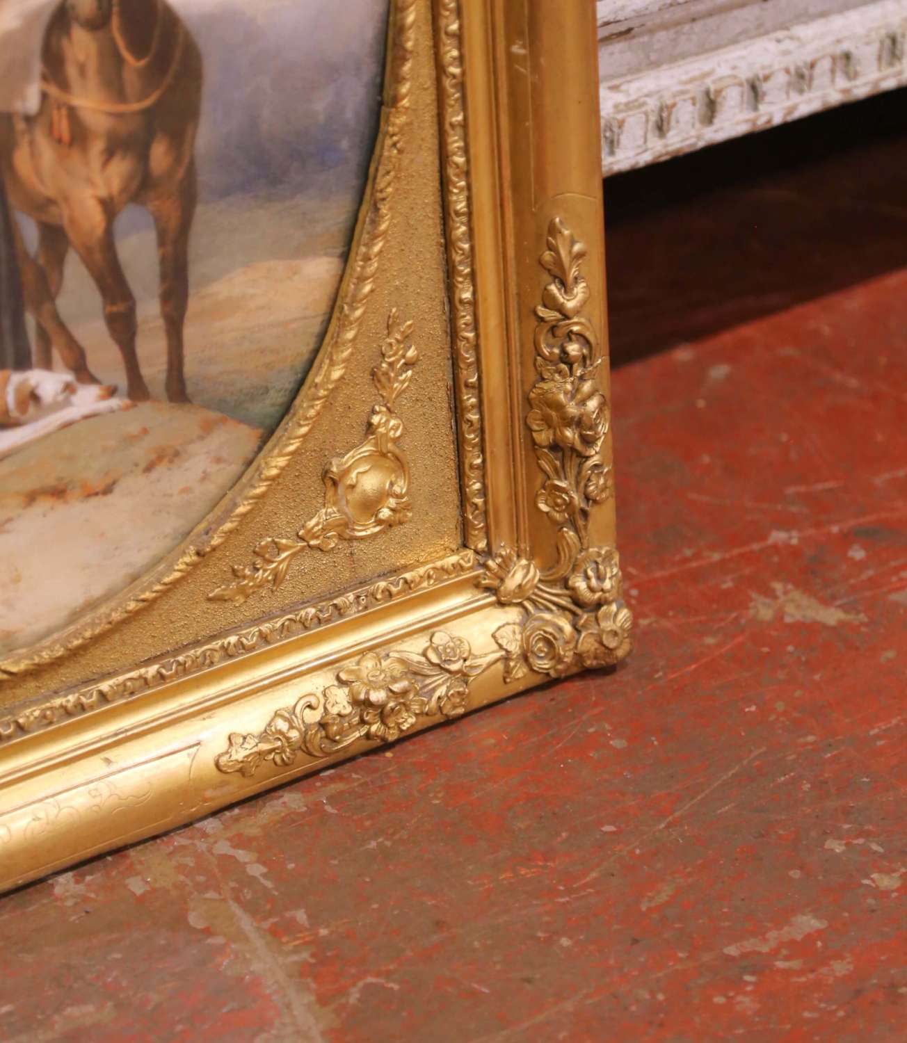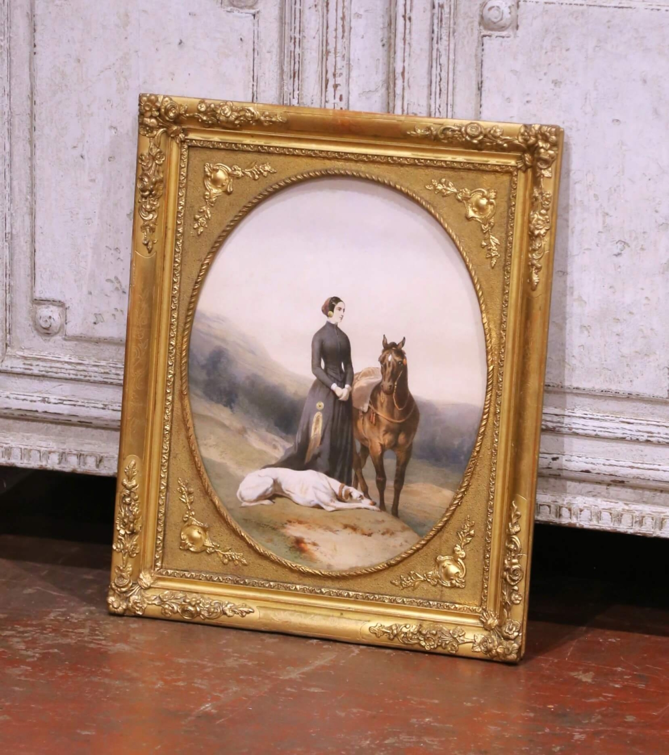 19th Century French Equestrian Portrait of Lady with Horse & Dog in Carved Frame