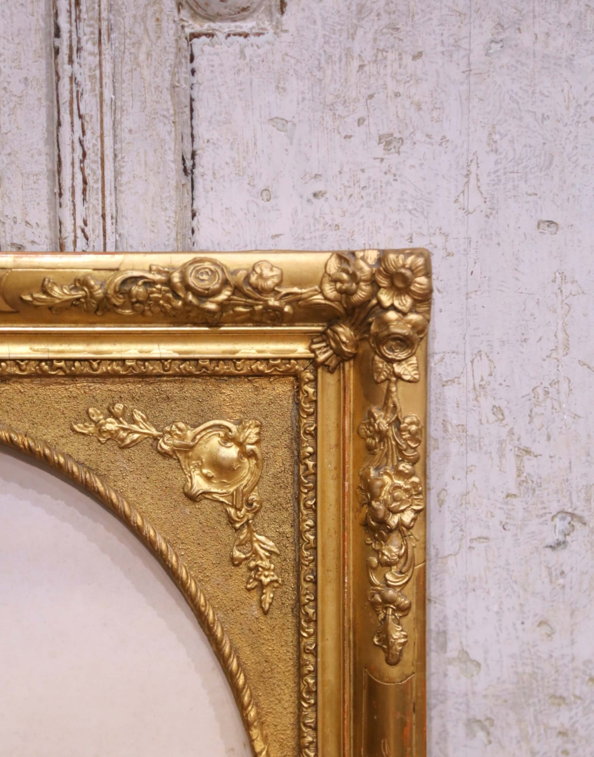 The artwork is presented in its original giltwood frame, richly decorated with applied floral and foliate motifs, a rope-twist oval surround, and a textured ground that enhances the central composition. The warm and softly aged gold patina adds depth and character, complementing the refined palette of the artwork.