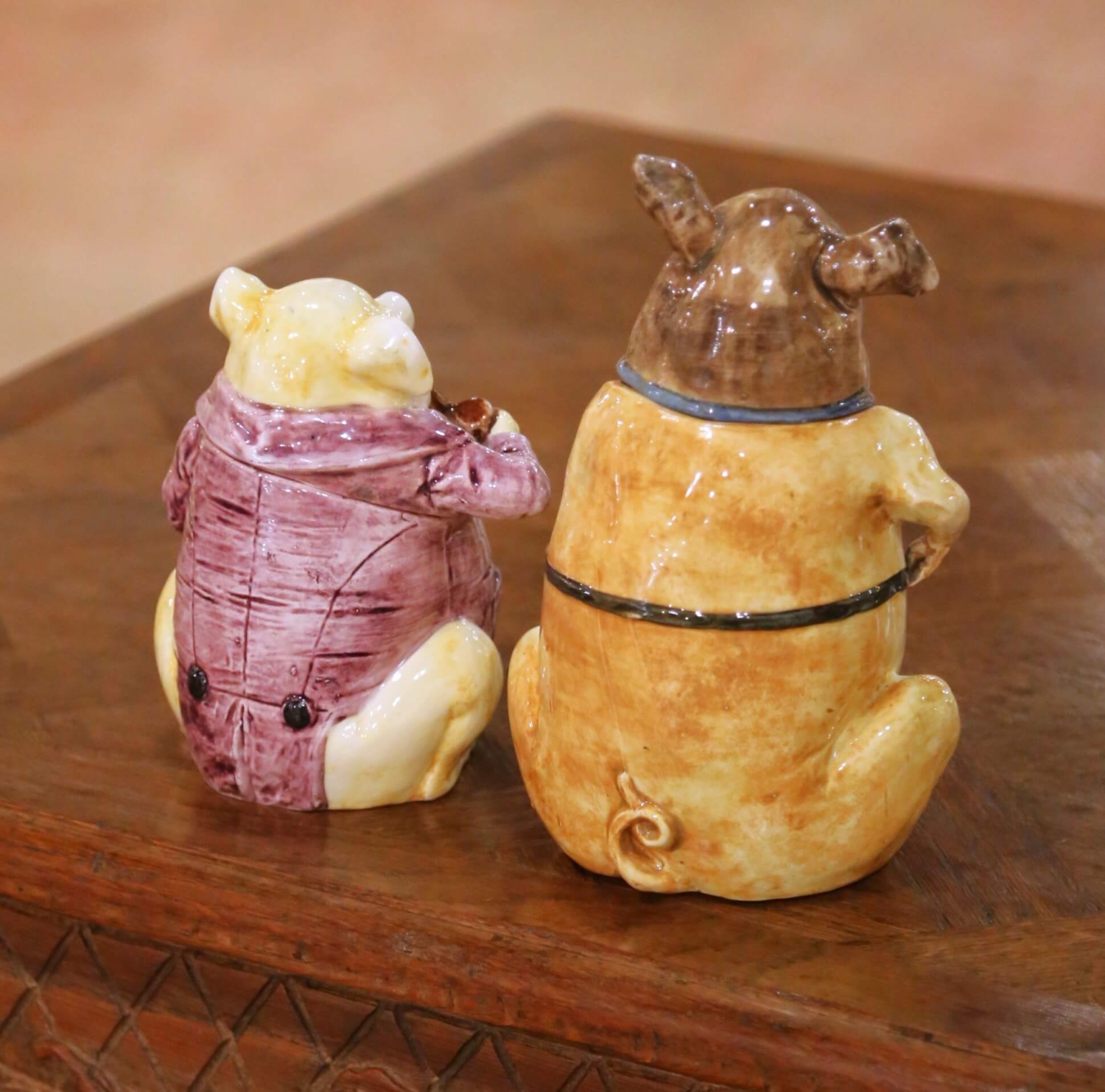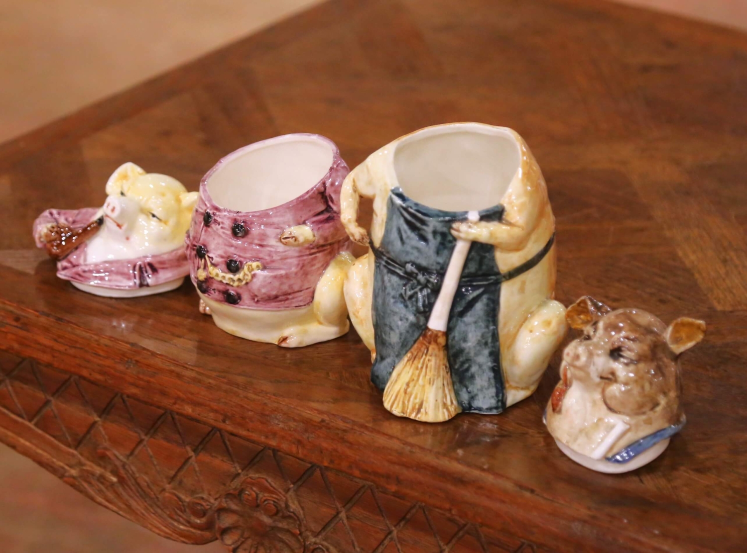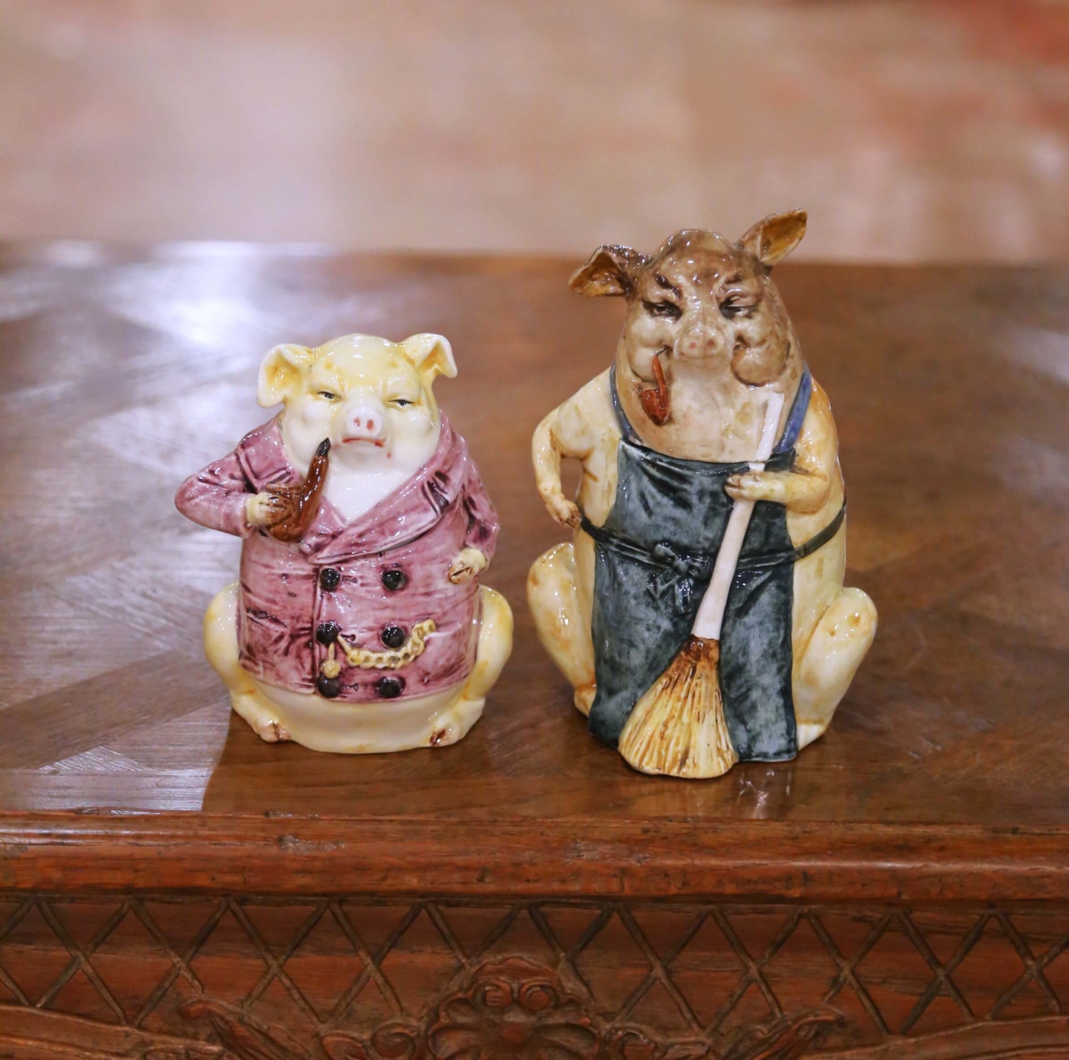 Crafted in Northern France circa 1880, this engaging pair of antique figural faience tobacco jars is executed in the manner of Onnaing, reflecting the lively humor and expressive modeling for which the factory became celebrated in the late 19th century. The anthropomorphic subject and spirited detailing place these pieces firmly within the tradition of Northern French faience. Each jar is sculpted as a seated pig dressed as a country gentleman. The larger figure wears a deep green apron with blue straps, holding a straw broom while smoking a pipe, evoking a rustic caretaker. The smaller companion is dressed in a mauve double-breasted coat accented with black buttons and a molded watch chain, also holding a pipe. Their half-closed eyes and subtly amused expressions lend narrative charm and personality. Formed in glazed faience with a creamy tin-glazed surface, the bodies are enriched by hand-painted accents in warm honey, blush, and earthy tones. The glossy finish enhances the dimensional modeling of the snouts, clothing folds, and accessories. Both figures open at the head to reveal hollow interiors, consistent with their original function as tobacco jars. The underside of the larger example bears the impressed number “4409 10” along with a small painted mark. Light wear to the base edges and minor surface variations are present, all consistent with age and use and reinforcing the authentic antique character of the pair. Whimsical yet substantial, this antique French faience set in the manner of Onnaing would make a distinctive addition to a study, library, bar, or curated ceramic collection. Dimensions: 5.5”W x 5”D x 8”H and 5”W x 4”D x 6”H.