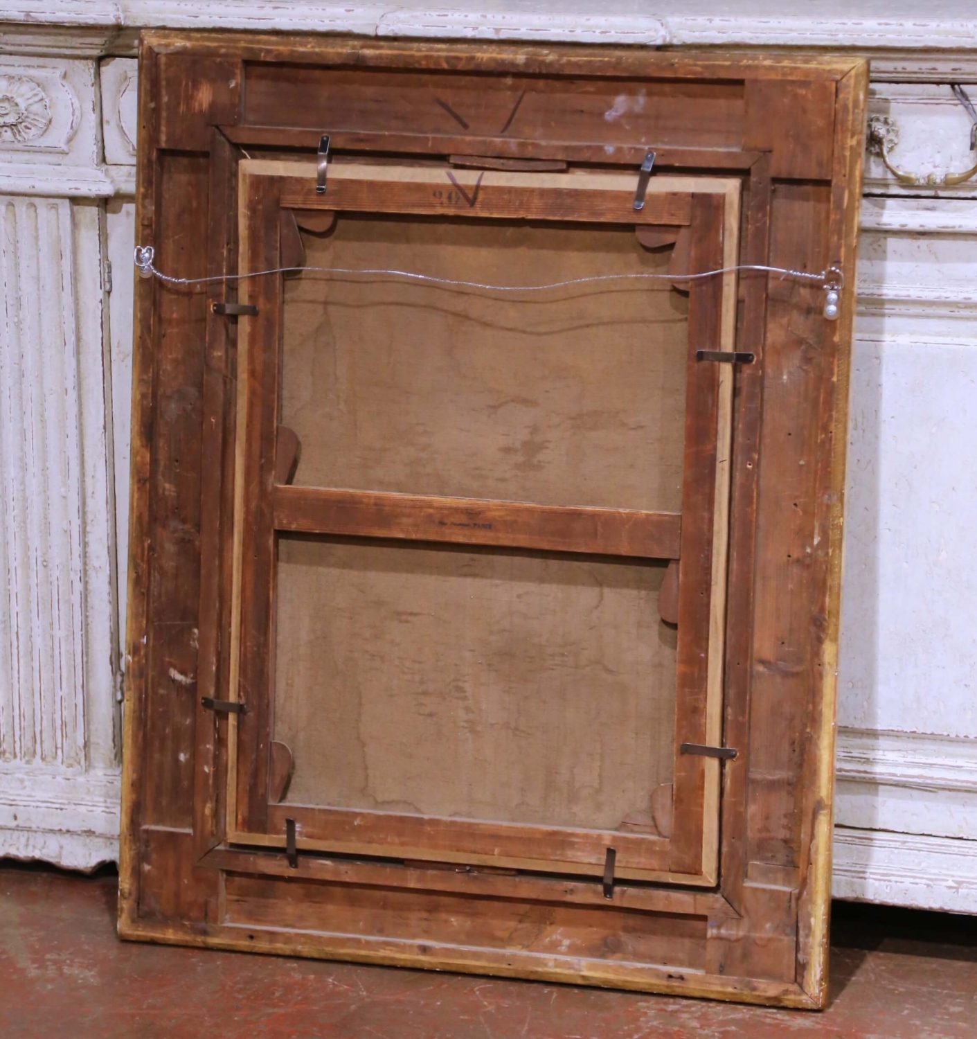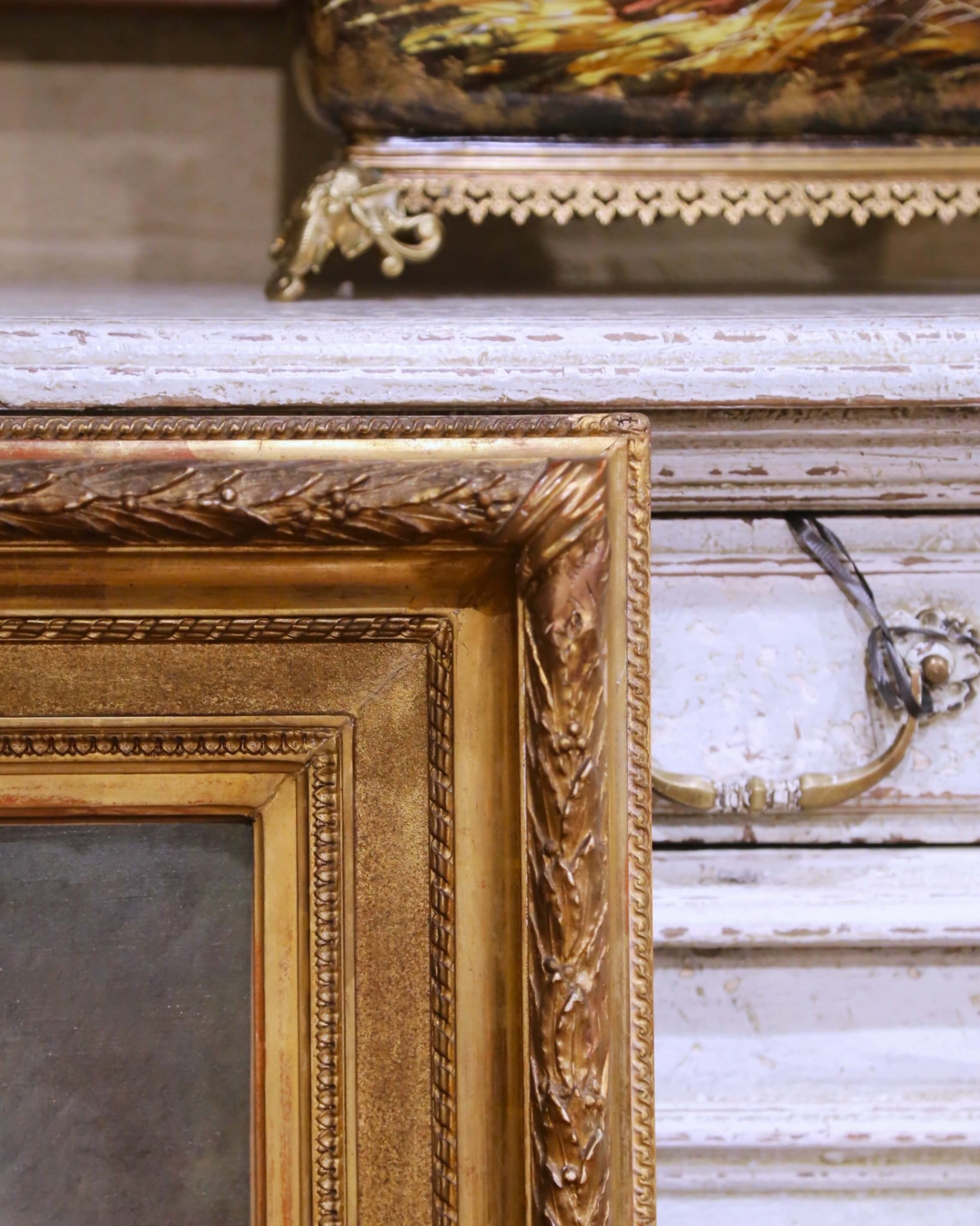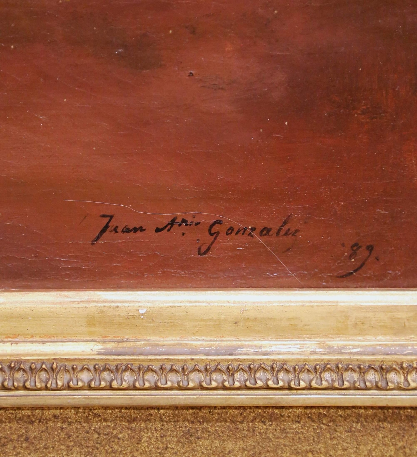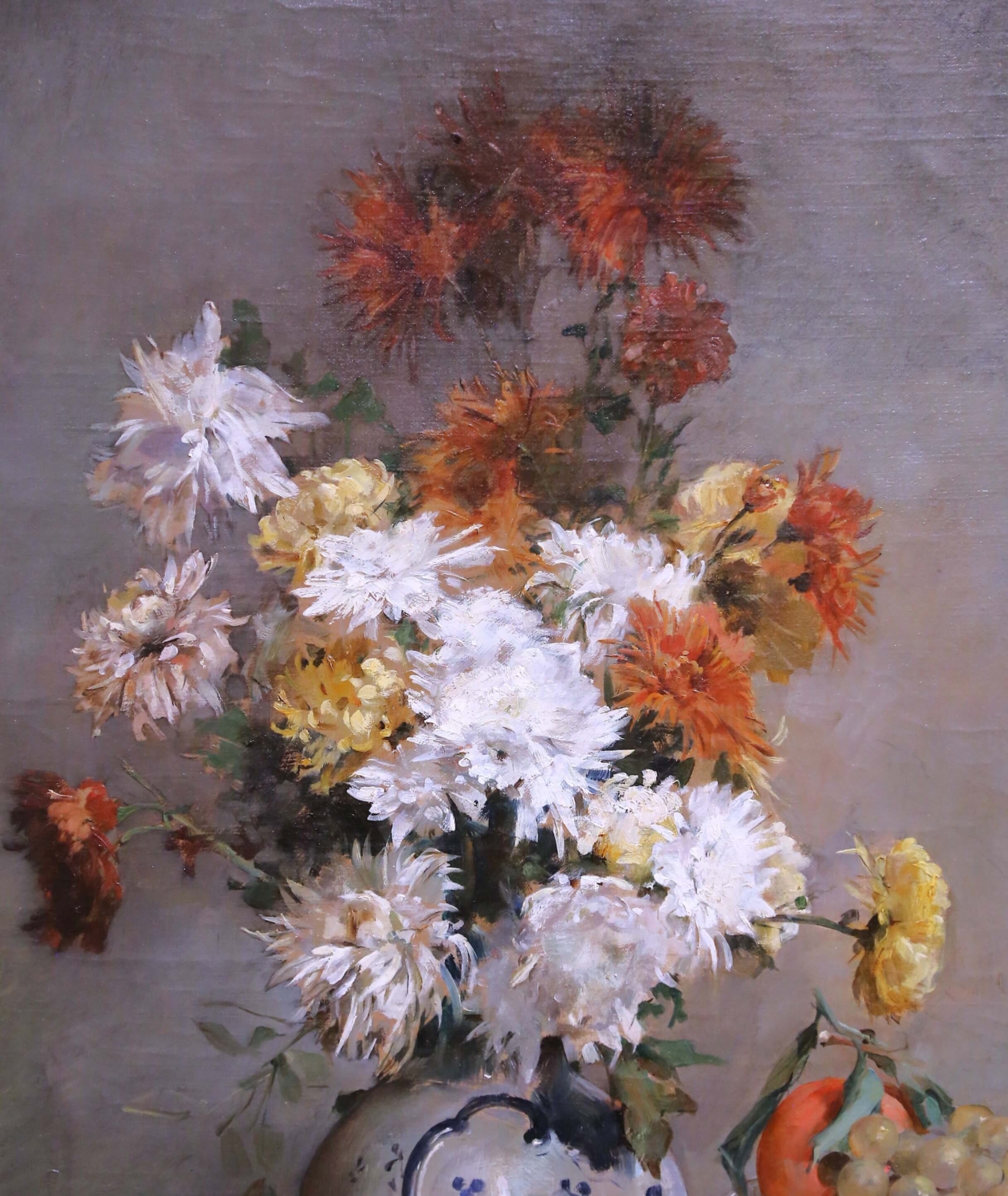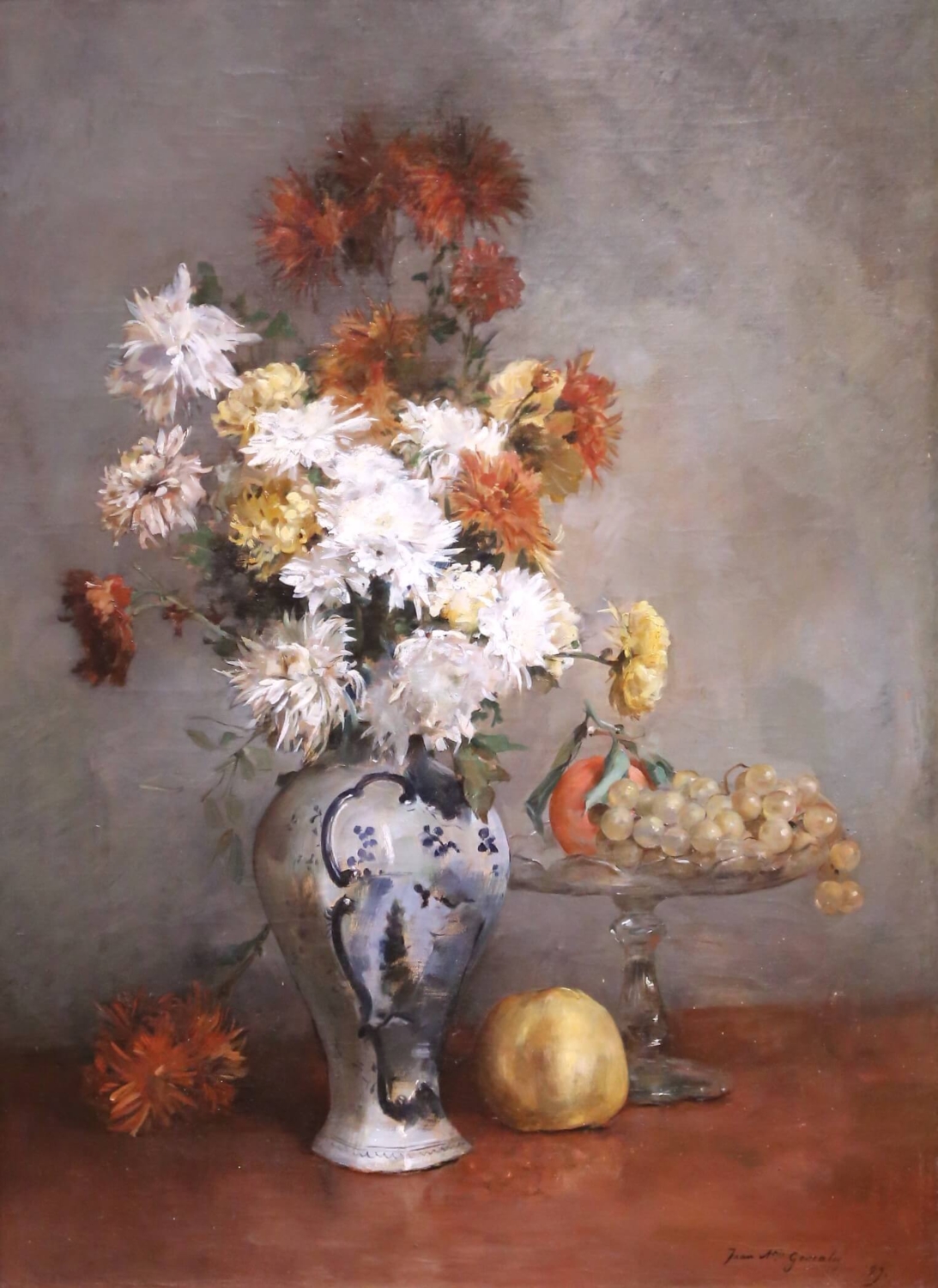 Crafted in France and dated 1889, this refined antique still life oil painting presents a harmonious arrangement of chrysanthemums and fruit executed in the academic tradition of the late 19th century. A porcelain baluster vase, delicately decorated in blue tonal accents, overflows with full blossoms in ivory, cream, and soft rust hues. Beside it, a compote of pale grapes and citrus rests on a polished tabletop, adding balance and quiet movement to the composition. The neutral gray background enhances the luminosity of the petals and fruit, allowing the subtle modeling of light and shadow to create depth and realism. The brushwork reflects confident academic training, with careful attention to texture in the layered petals, translucent grapes, and reflective ceramic surface. The composition is symmetrical yet naturalistic, characteristic of French studio painting of the period, created to bring elegance and refinement to an interior. Signed lower right “Jean A. Gonzalez” and dated 1889, the artist appears to have been an academically trained painter working in France in the late 19th century, likely producing refined decorative still lifes in the salon tradition. While not widely documented in major artist dictionaries, his work demonstrates solid technical skill and a clear understanding of light, composition, and tonal harmony typical of trained provincial studio artists of the era. The painting retains its original carved and giltwood frame with classical leaf and molded detailing. It is in excellent antique condition commensurate with age and use, and presents beautifully with warm patina to the gilding. Dimensions: 31″W x 4″D x 38.5″H