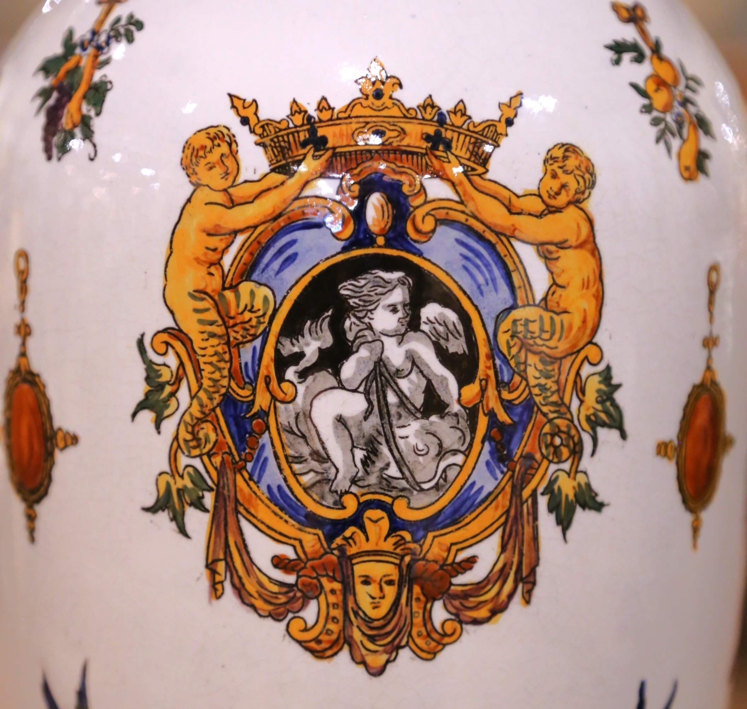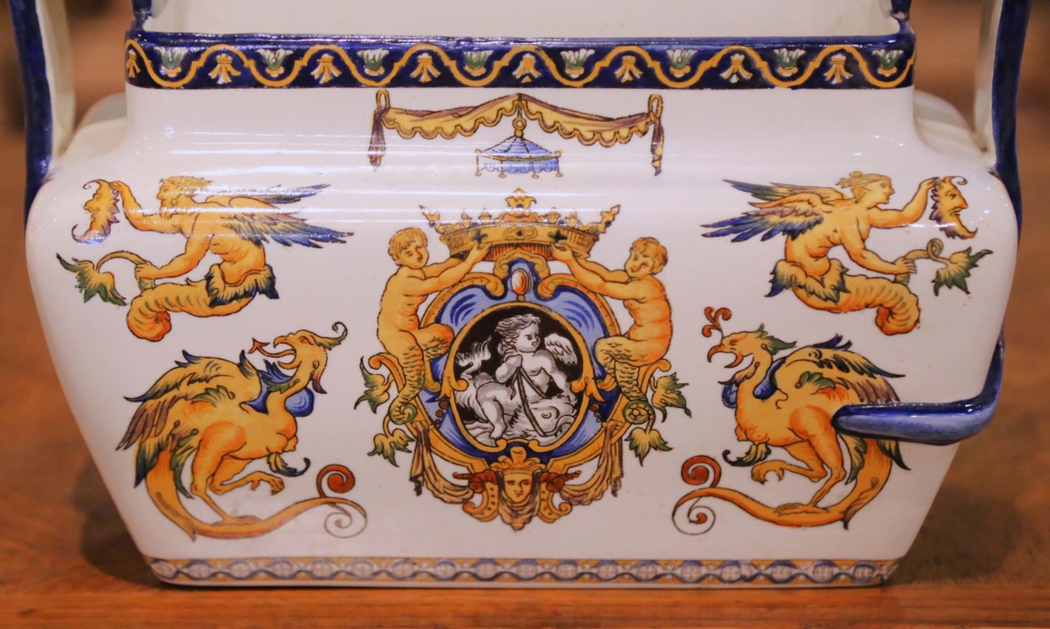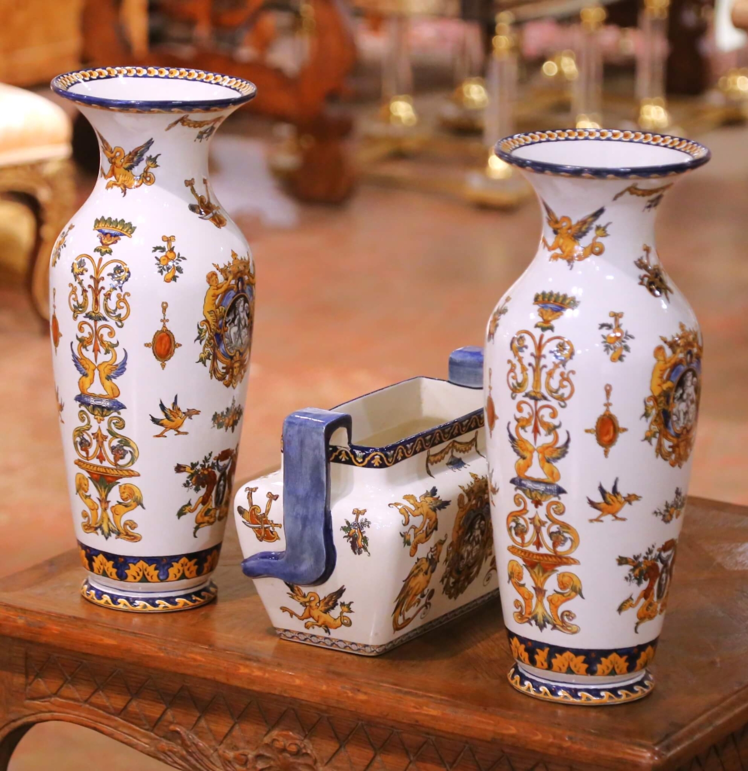 Circa 1880, this elegant antique three-piece garniture set was crafted in France by the celebrated faience manufactory Faïencerie de Gien, founded in 1821 and renowned for producing richly decorated earthenware inspired by Renaissance ornament and historical European decorative arts. The set includes a pair of tall baluster vases and a matching rectangular jardinière with raised side handles. Each piece is lavishly decorated with intricate Renaissance Revival motifs including winged cherubs, griffins, classical portrait medallions, scrolling foliage, and ornamental trophies. The lively decoration is rendered in a vibrant palette of cobalt blue, ochre, and burnt orange against a creamy faience ground, while bold cobalt borders frame the rims and bases, adding strong visual contrast. The underside bears the printed Gien factory mark along with hand-painted decorator’s numbers. Richly detailed yet balanced in form, this antique garniture set would make an impressive decorative statement on a mantel, console, or dining room sideboard. Excellent antique condition commensurate with age and use. Dimensions: Vases: 7″ Diameter x 18.25″H Jardinière: 13″W x 6.5″D x 8.5″H