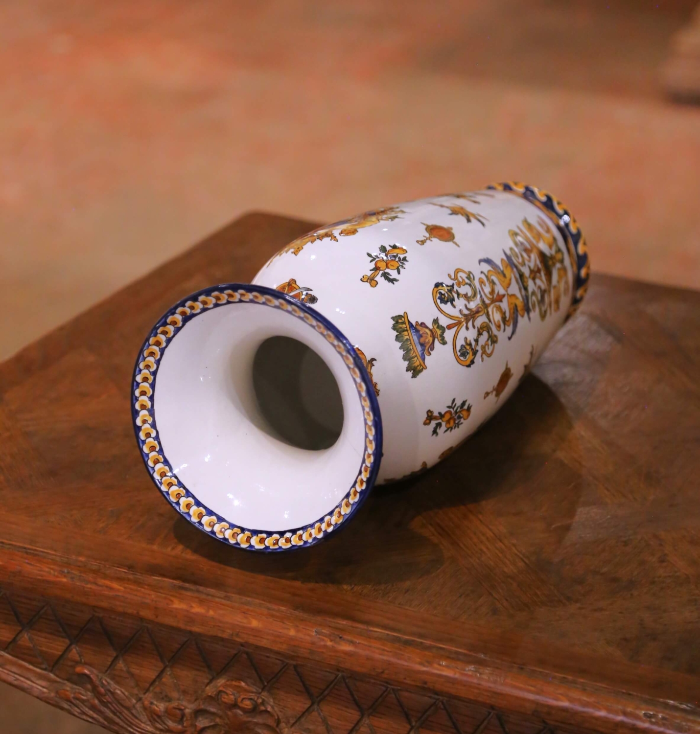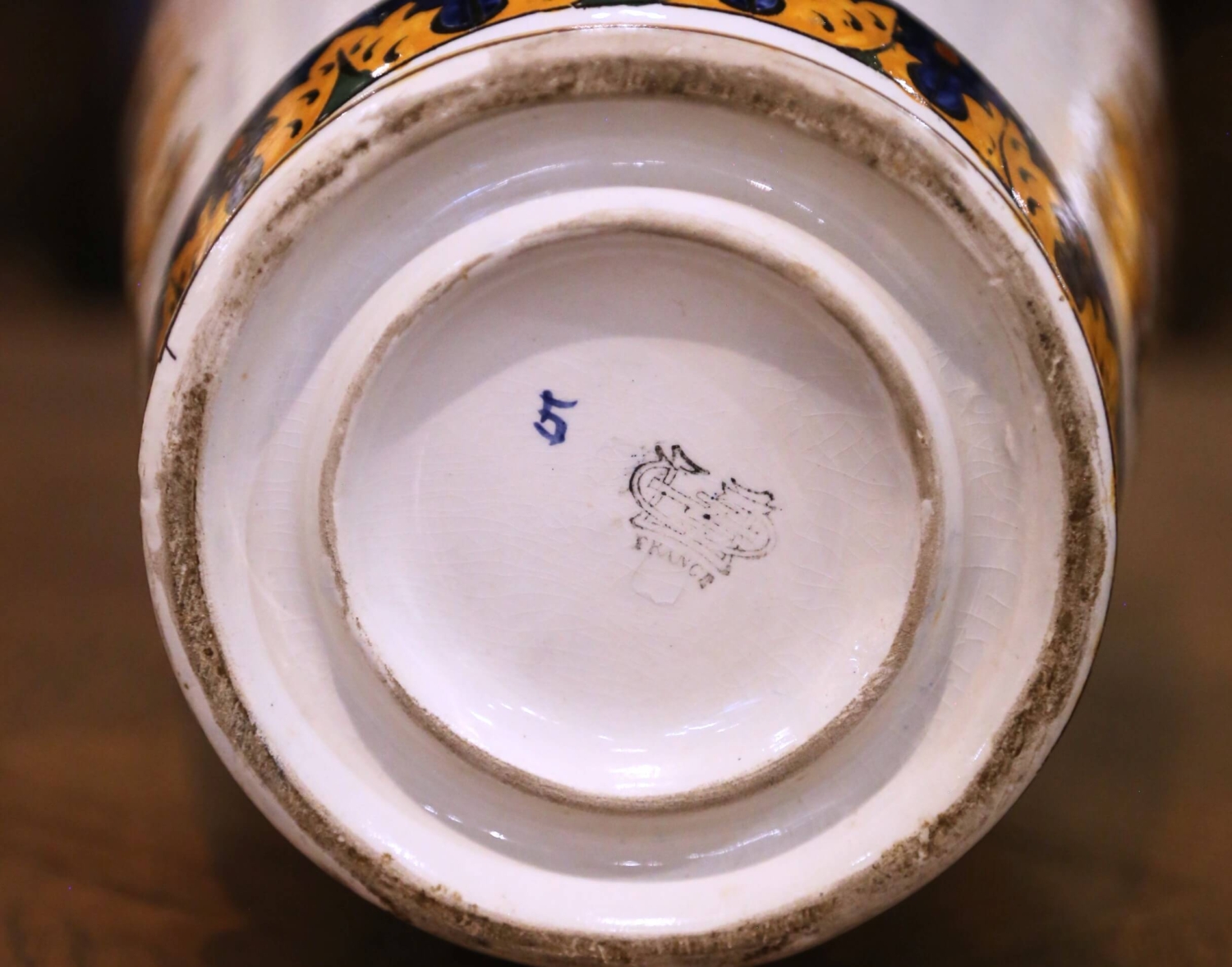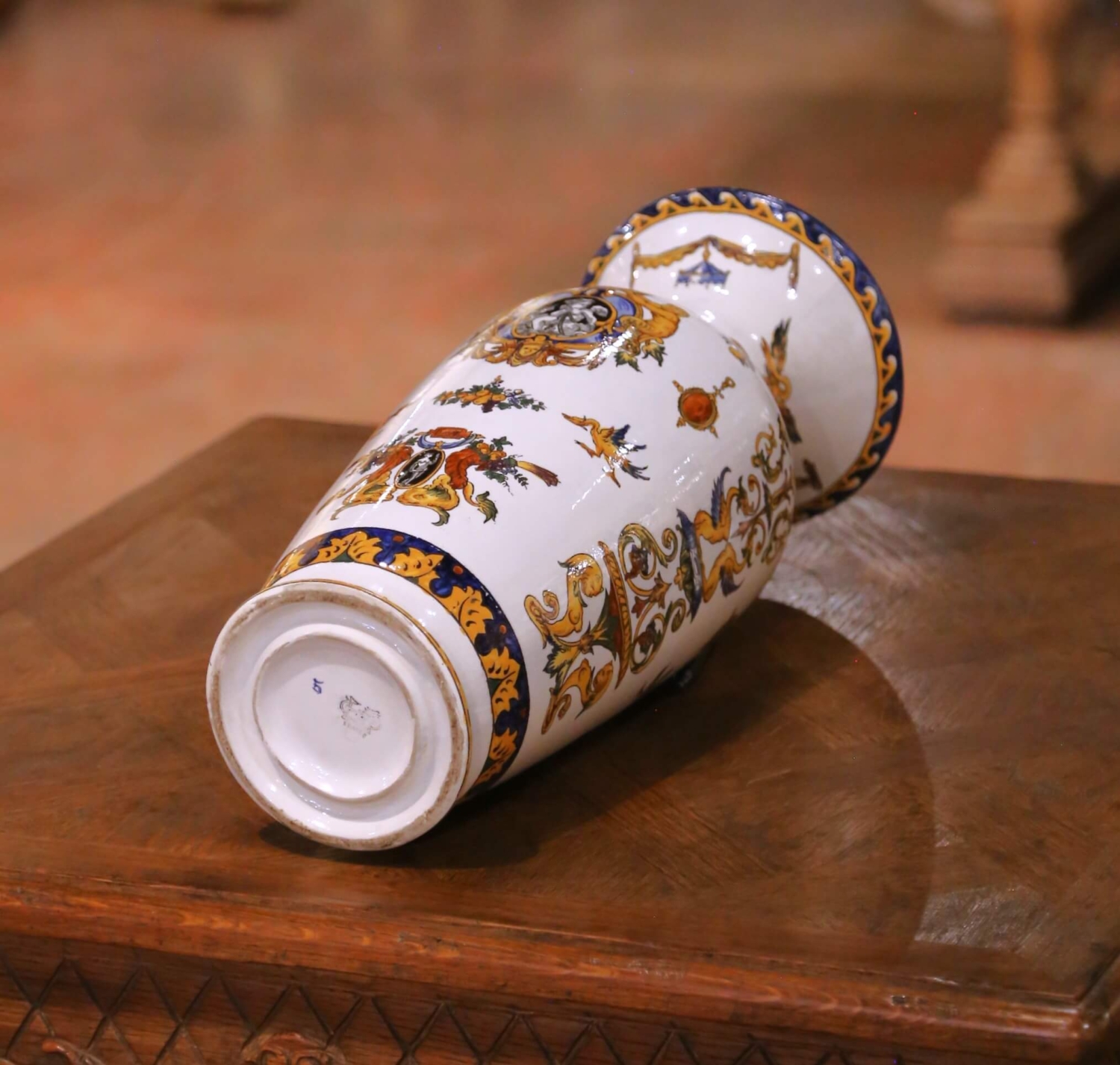 Circa 1880, this elegant antique three-piece garniture set was crafted in France by the celebrated faience manufactory Faïencerie de Gien, founded in 1821 and renowned for producing richly decorated earthenware inspired by Renaissance ornament and historical European decorative arts. The set includes a pair of tall baluster vases and a matching rectangular jardinière with raised side handles. Each piece is lavishly decorated with intricate Renaissance Revival motifs including winged cherubs, griffins, classical portrait medallions, scrolling foliage, and ornamental trophies. The lively decoration is rendered in a vibrant palette of cobalt blue, ochre, and burnt orange against a creamy faience ground, while bold cobalt borders frame the rims and bases, adding strong visual contrast. The underside bears the printed Gien factory mark along with hand-painted decorator’s numbers. Richly detailed yet balanced in form, this antique garniture set would make an impressive decorative statement on a mantel, console, or dining room sideboard. Excellent antique condition commensurate with age and use. Dimensions: Vases: 7″ Diameter x 18.25″H Jardinière: 13″W x 6.5″D x 8.5″H