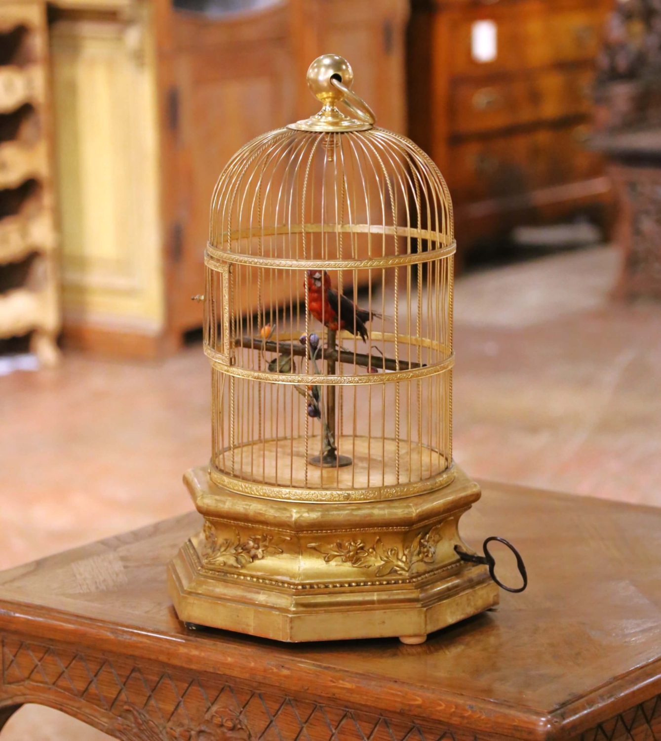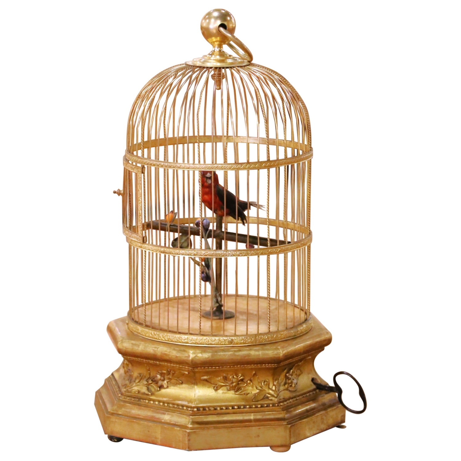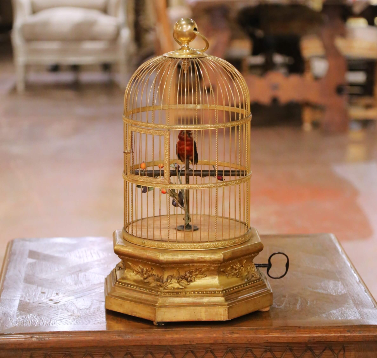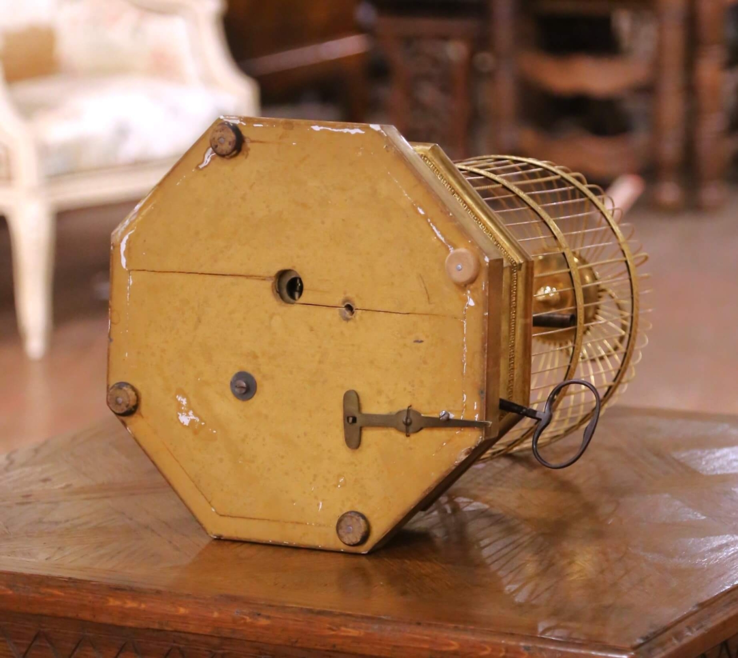 This exceptional antique singing bird automaton clock, crafted in France circa 1880, is a finely executed example of French luxury mechanical artistry. The finely worked gilt bronze birdcage is elegantly proportioned with delicately twisted vertical bars, a hinged front door, and a domed top surmounted by a ring finial. It is mounted on a sculptural giltwood base, octagonal in form, richly carved with floral garlands and beaded moldings, and retaining a warm, luminous patina developed through age and careful preservation. Within the cage, a vividly colored songbird with hand-painted plumage perches on a naturalistic branch adorned with polychrome berries and foliage, offering remarkable realism and charm. When activated by the original side winding key, the bird animates, turning its head, opening its beak, and producing song, a captivating interplay of movement, sound, and craftsmanship characteristic of the Belle Époque. (See video). The underside reveals the original construction and access panels, further confirming the authenticity and quality of this refined antique object, which functions equally well as a mantelpiece centerpiece, cabinet curiosity, or distinguished conversation piece. Dimensions: 11.75″ diameter x 20.5″ high.
