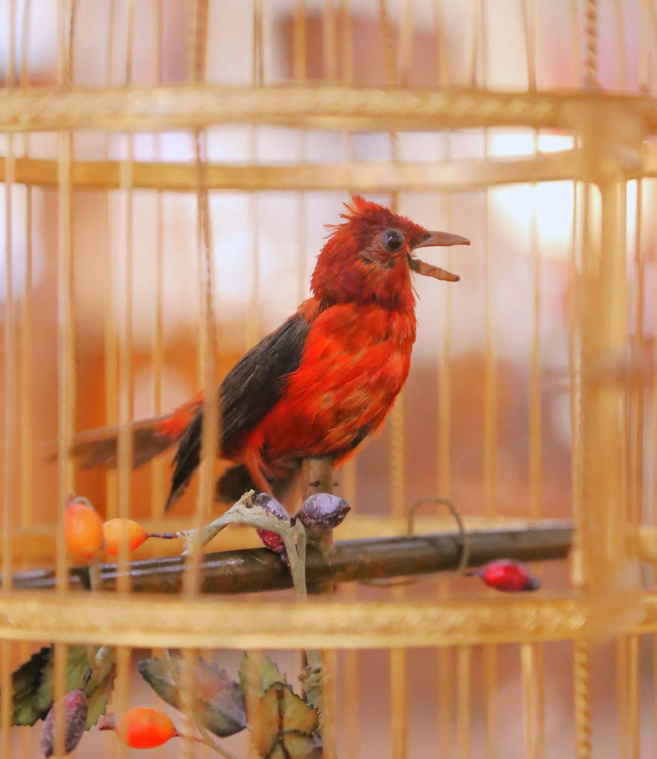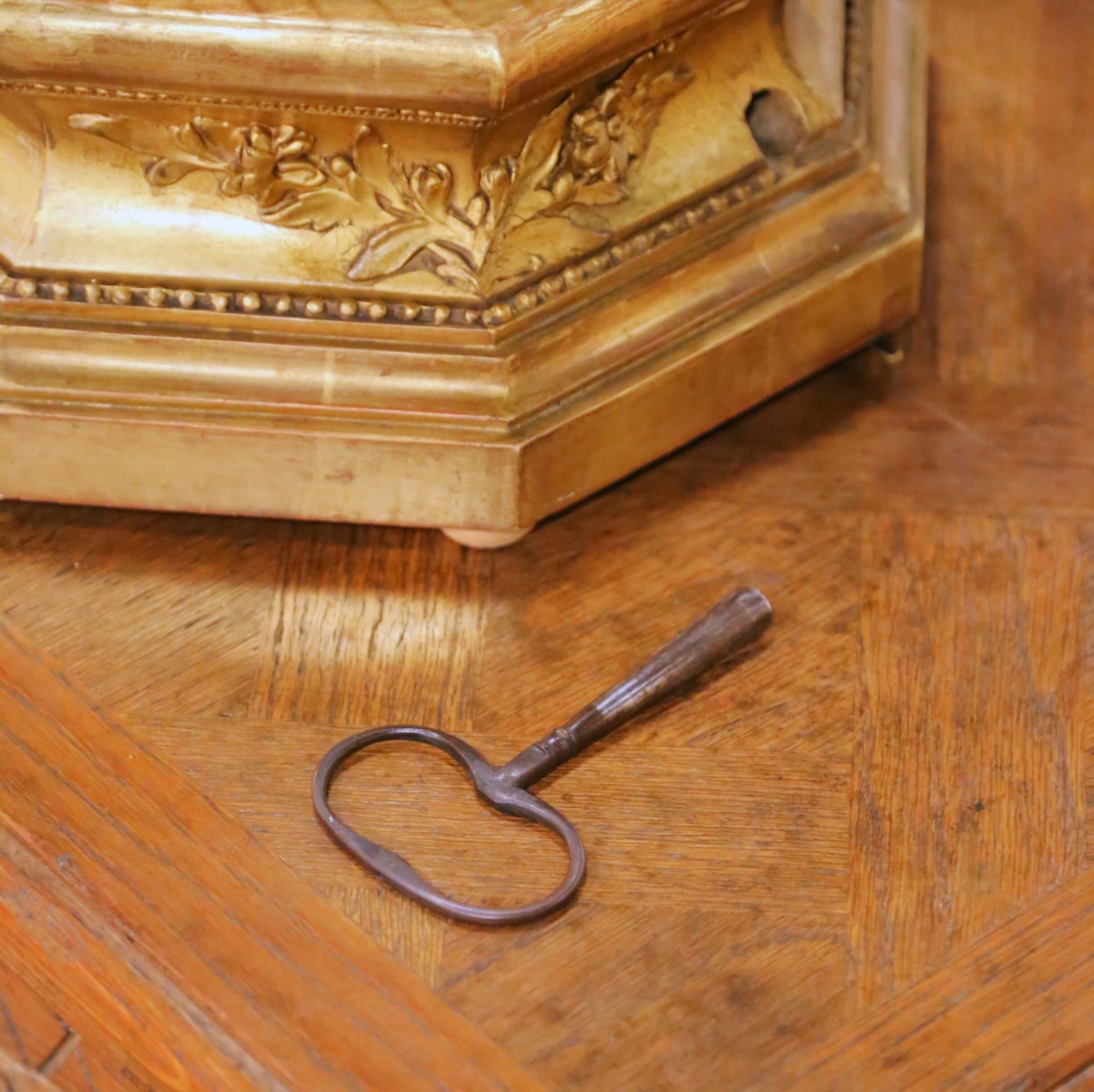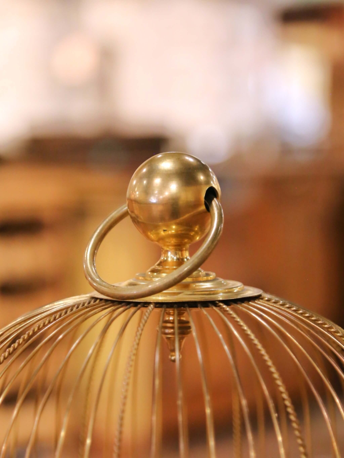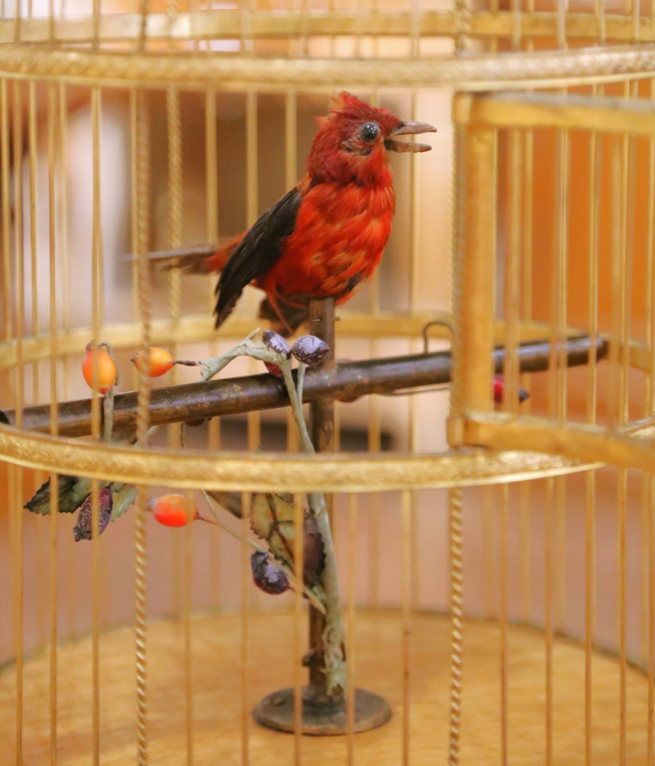 This exceptional antique singing bird automaton clock, crafted in France circa 1880, is a finely executed example of French luxury mechanical artistry. The finely worked gilt bronze birdcage is elegantly proportioned with delicately twisted vertical bars, a hinged front door, and a domed top surmounted by a ring finial. It is mounted on a sculptural giltwood base, octagonal in form, richly carved with floral garlands and beaded moldings, and retaining a warm, luminous patina developed through age and careful preservation. Within the cage, a vividly colored songbird with hand-painted plumage perches on a naturalistic branch adorned with polychrome berries and foliage, offering remarkable realism and charm. When activated by the original side winding key, the bird animates, turning its head, opening its beak, and producing song, a captivating interplay of movement, sound, and craftsmanship characteristic of the Belle Époque. (See video). The underside reveals the original construction and access panels, further confirming the authenticity and quality of this refined antique object, which functions equally well as a mantelpiece centerpiece, cabinet curiosity, or distinguished conversation piece. Dimensions: 11.75″ diameter x 20.5″ high.