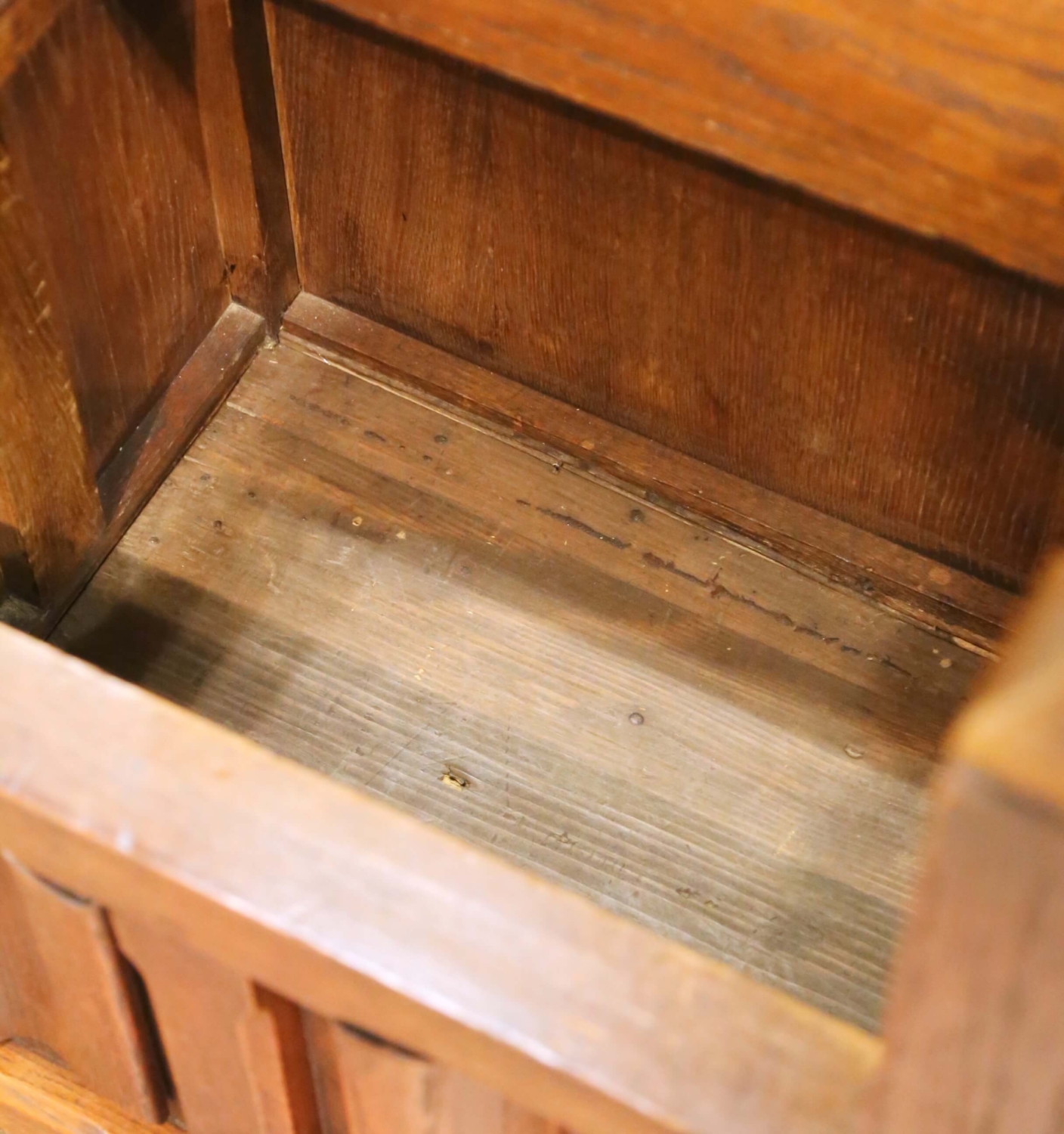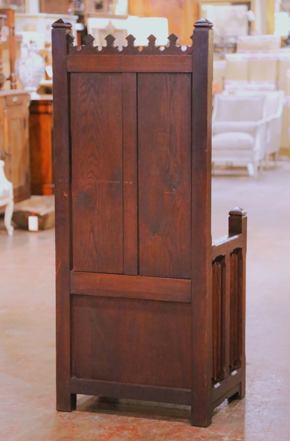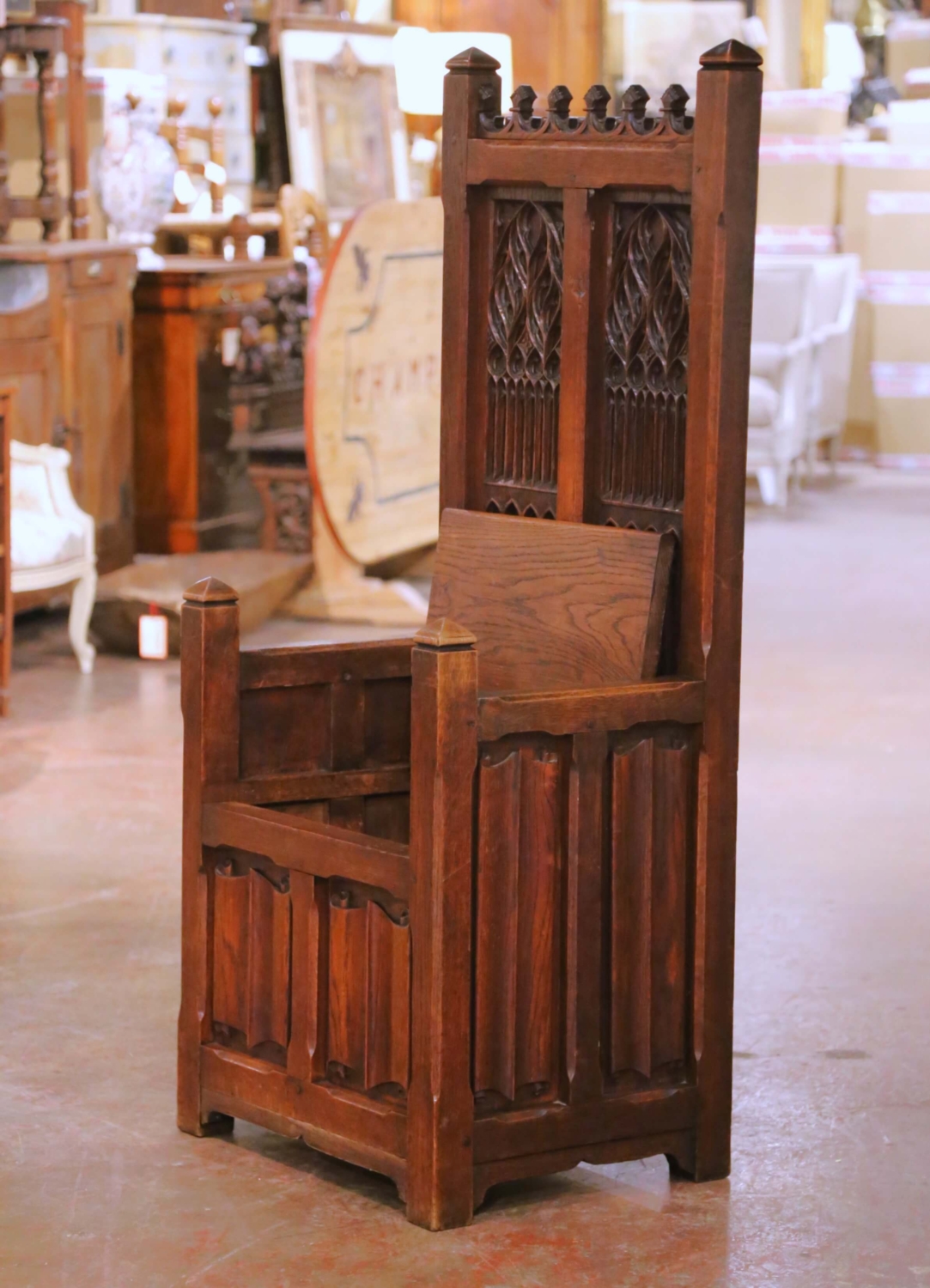 This imposing Gothic stalle de chœur (French for choir stall) was crafted in southern France circa 1860. Built of solid oak, the architectural chair stands on sturdy bracket feet over a scalloped plinth apron, reflecting its ecclesiastical origins. The exceptionally tall back is richly hand carved with pointed arches, Gothic tracery, and lancet motifs, evocative of medieval cathedral woodwork. The enclosed sides and upright proportions emphasize its ceremonial function and visual authority. The bench seat lifts up on iron strap hinges to reveal an interior storage compartment, originally intended for prayer books or liturgical objects. Shaped armrests flank the seat, further reinforcing the throne-like presence of the piece. The antique oak chair is in excellent condition commensurate with age and use and retains a warm, richly patinated finish throughout. Sculptural and architectural, it may be used today as a dramatic accent chair in an entry hall, library, stair landing, or as a statement piece in a Gothic or historic interior. Dimensions: 23.5″W x 18.5″D x 57″H Seat Height: 18.75″H