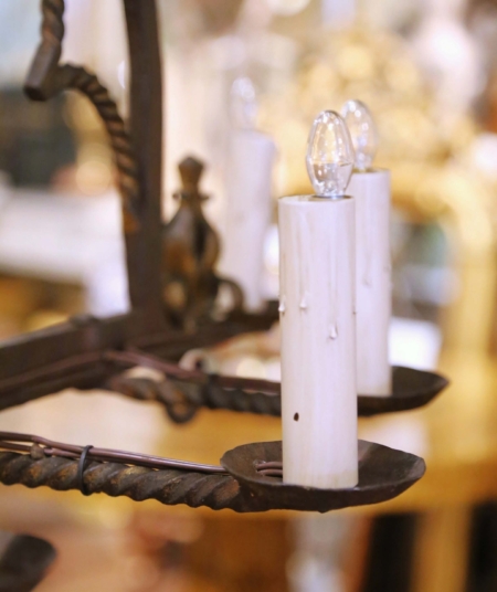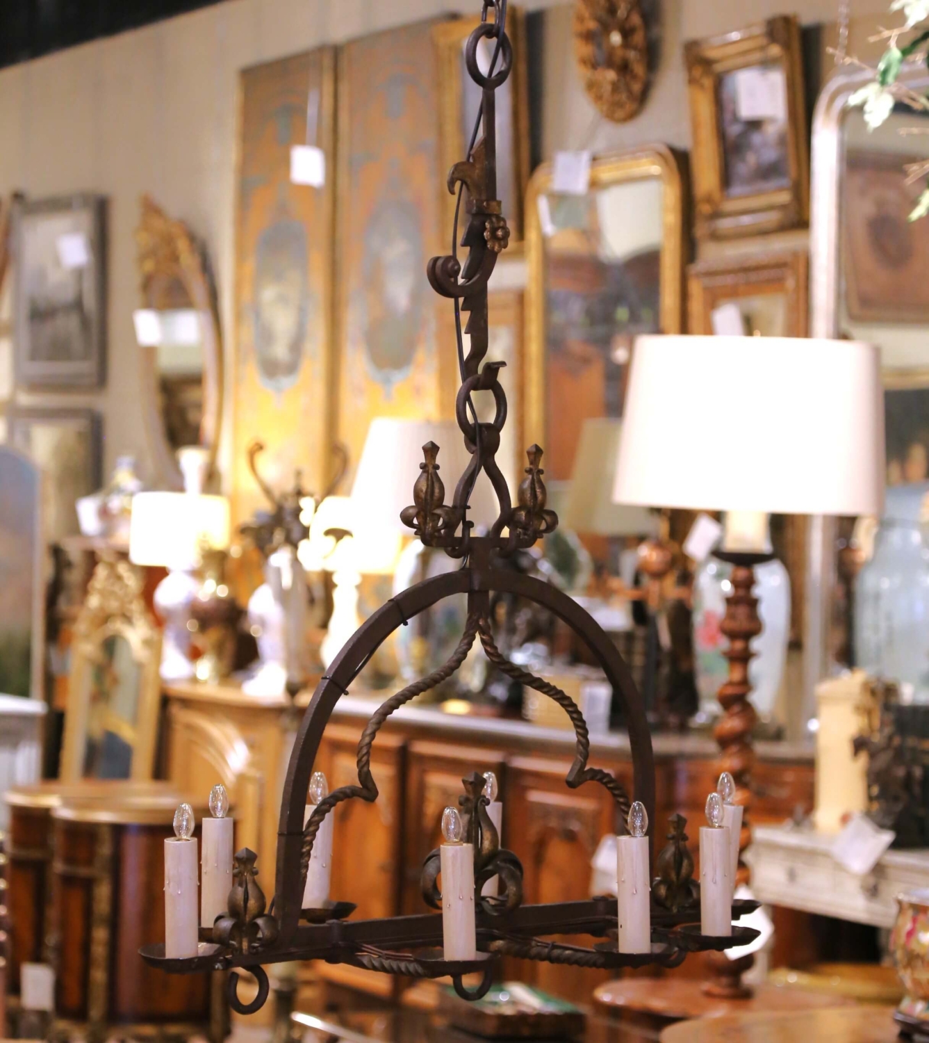 This impressive antique chandelier was crafted in France circa 1880. Forged from heavy wrought iron, the eight-light fixture showcases bold Gothic design with scrolled arms, twisted supports, and decorative Fleur-de-Lis motifs. The iron surface is finished with a naturally aged, rustic patina, richly contrasted by remnants of gilt accents that highlight the decorative details. The chandelier’s arched frame and pierced center finial create a strong architectural presence, while the Fleur-de-Lys embellishments emphasize its French origin. Each perimeter arm is fitted with a newly wired candle-form socket, bringing the total to eight lights. The fixture is fully functional and ready for installation. The suspension rod at the top is adjustable, making it versatile for different ceiling heights. This rare 19th-century French light fixture is in excellent condition commensurate with age and use. A dramatic statement piece, it would be ideal above a dining table, in a grand entryway, over a kitchen island, or in a living room with historic character. Included: a canopy, loop and chain, each color-matched to the fixture. Measures: 37″ W x 23″ D x 42.5″ H (adjustable).