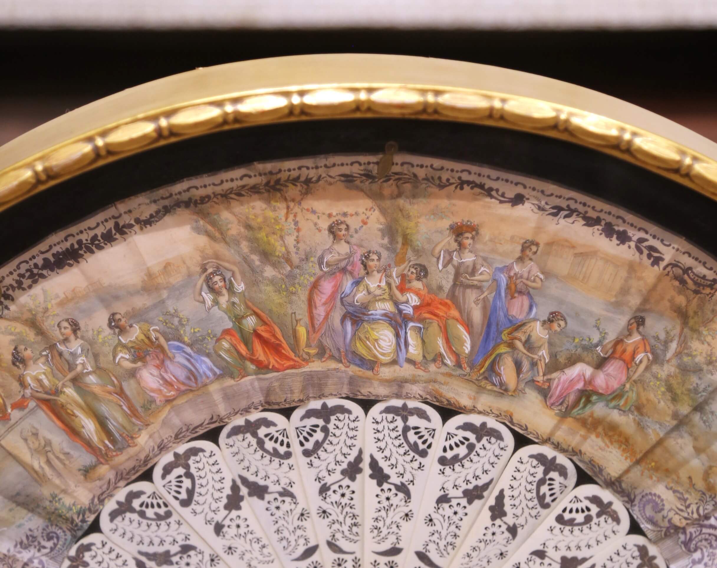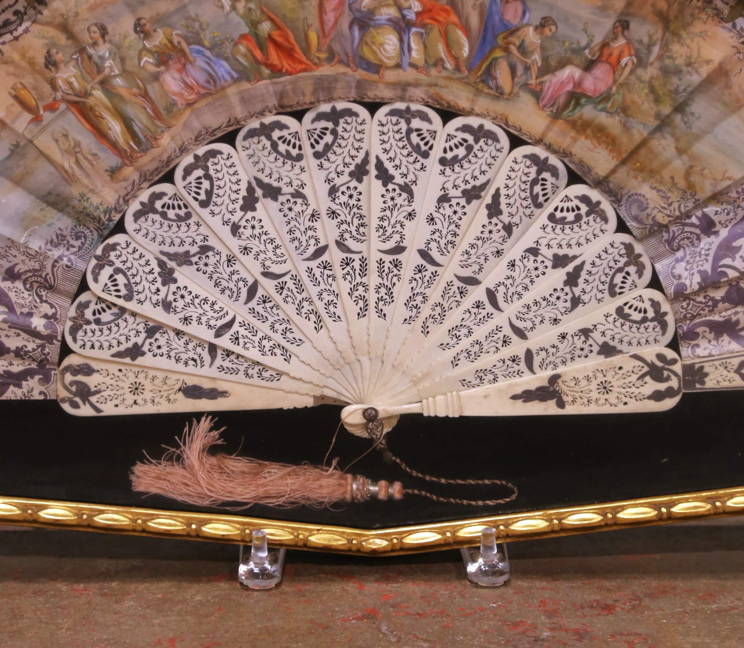 19th Century French Hand-Painted Fan with Pierced Bone Sticks in Gilt Frame