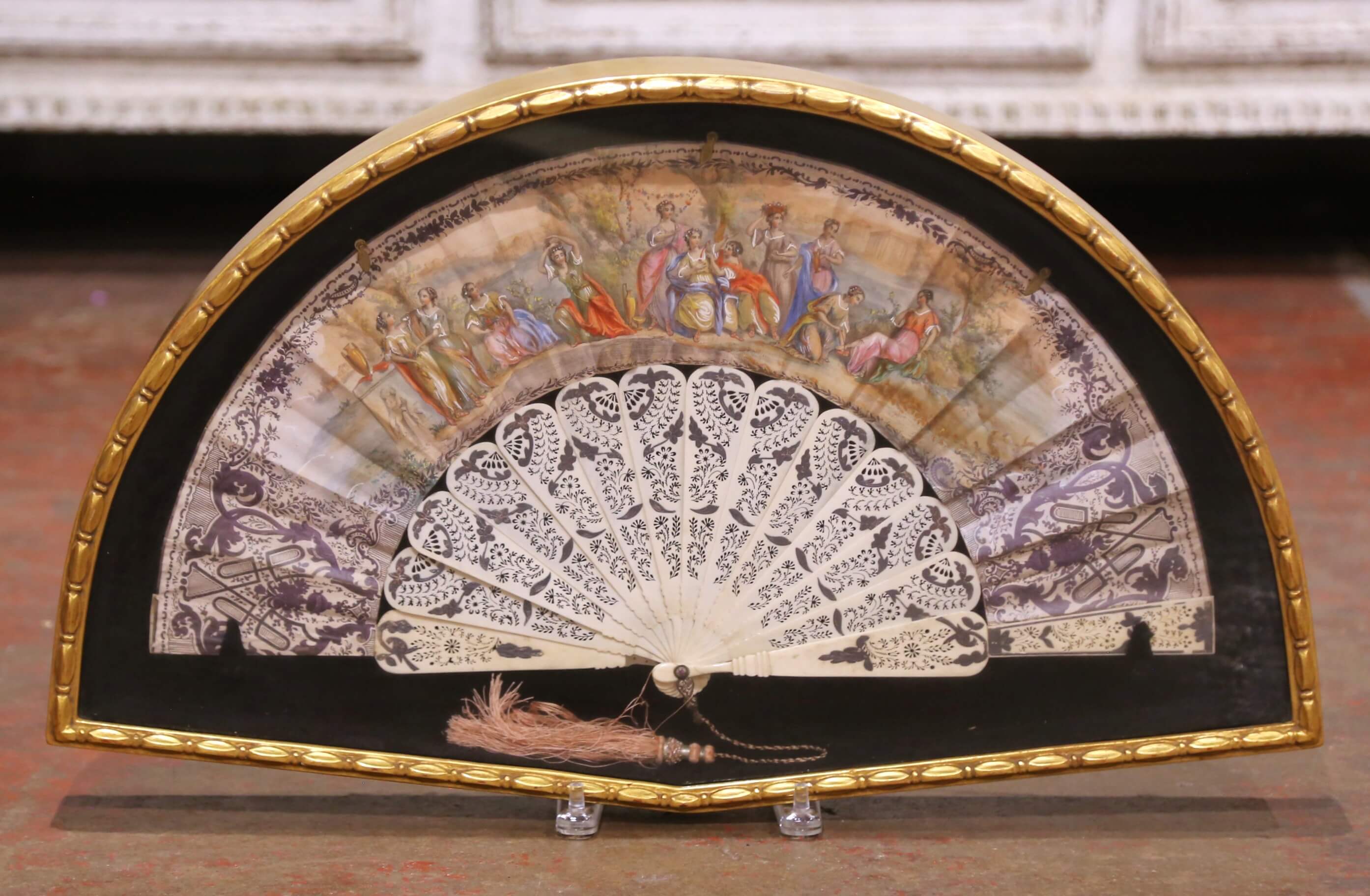Decorate a wall or salon with this elegant antique hand-painted fan, crafted in France circa 1890. Presented in a refined half-moon shadowbox, the composition is set against a black ground and enclosed under glass within a carved giltwood frame, accented with a repeating beaded motif and finished in a warm, softly aged patina. The fan body is beautifully hand-painted with a lively figural scene, depicting a group of finely dressed women in a pastoral setting, gathered in graceful poses beneath garlands and trees. The palette is soft yet luminous, with delicate tonal transitions and subtle detailing that reflect the romantic sensibility of the late 19th century. The gentle arc of the fan enhances the movement of the composition, drawing the eye fluidly across the scene. Below, the sticks are crafted from finely pierced and carved bone, intricately decorated scrolling foliage and stylized motifs in a contrasting sliver leaf. The lace like openwork creates a striking visual texture and provides a refined counterpoint to the painted silk above. The original tassel remains attached at the guard, adding an authentic finishing detail. The antique wall piece is in excellent condition commensurate with age and use, with wear consistent with its age. A sophisticated decorative object, it brings color, craftsmanship, and a sense of French elegance to both traditional and transitional interiors. Dimensions: 23.5″W x 2″D x 14″H