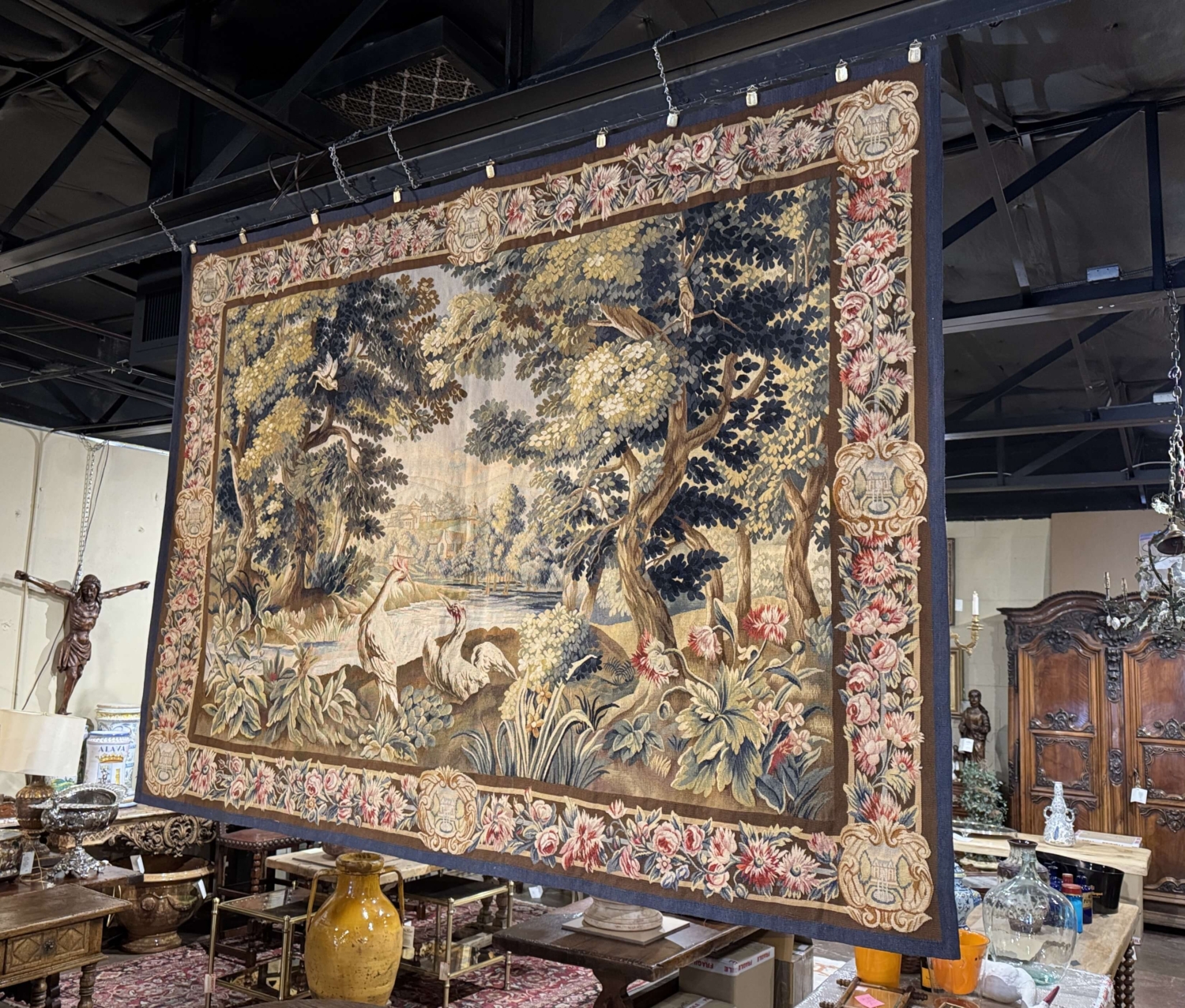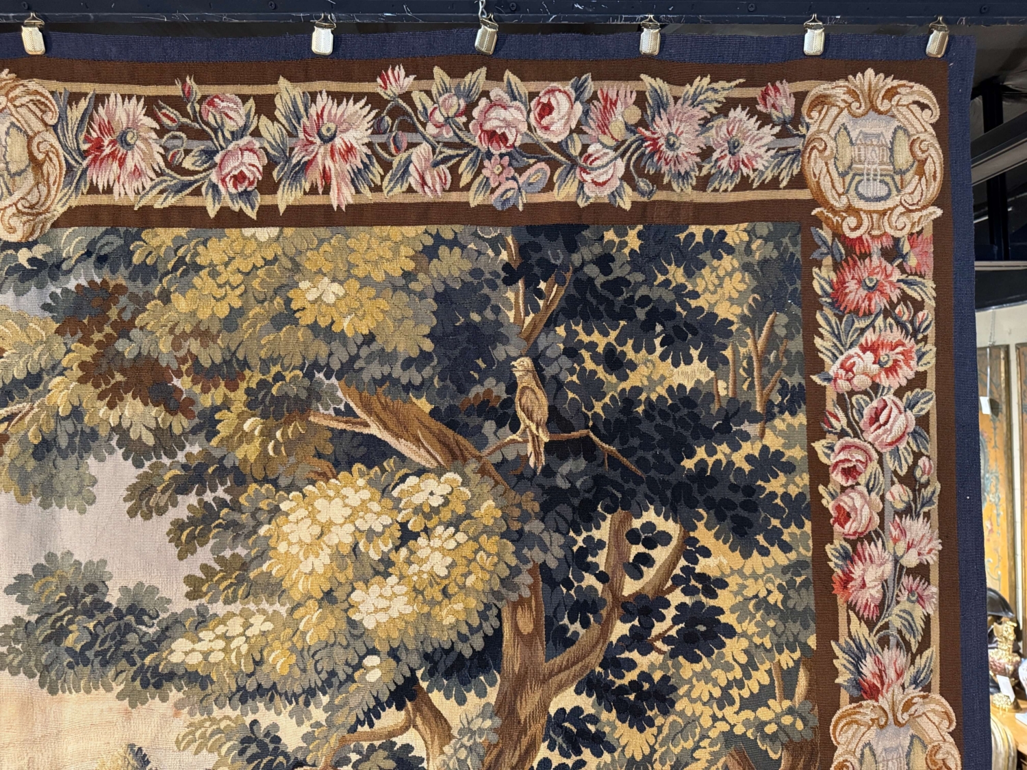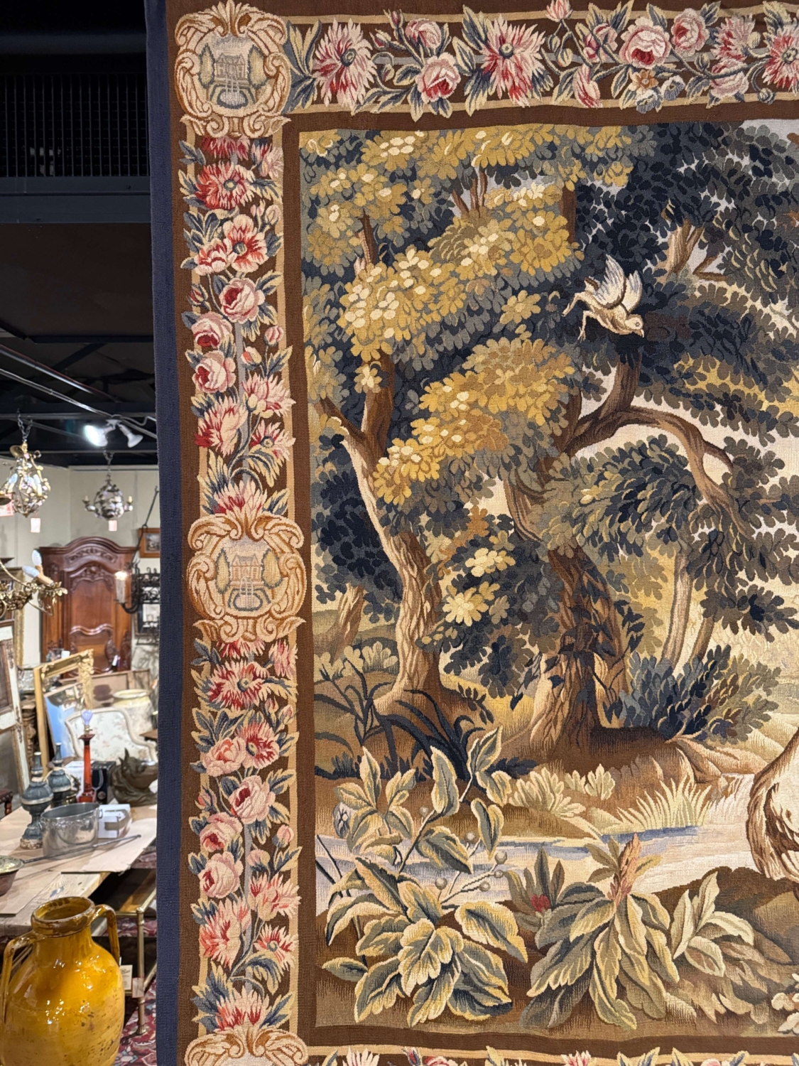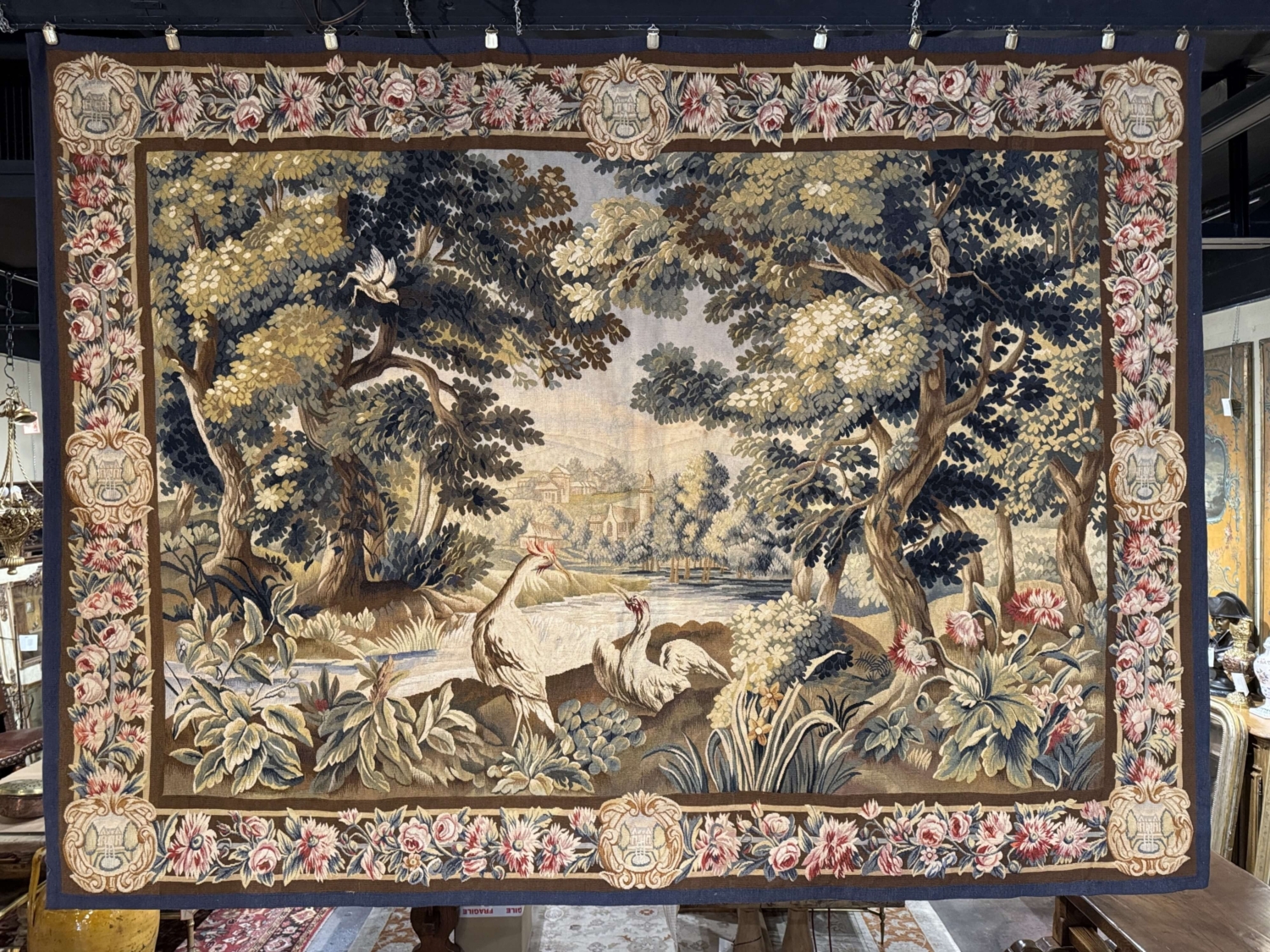 This antique French Aubusson verdure tapestry was handwoven circa 1870 and depicts a lush wooded landscape animated by birds perched among twisting tree branches. Rendered in a classic verdure palette of layered greens, soft blues, warm ochres, and muted earth tones, the composition offers strong depth and decorative presence. Aubusson tapestries, woven in central France, are renowned for their painterly landscapes, refined color harmonies, and timeless appeal. Verdure scenes such as this were among the most sought-after designs produced by the Aubusson workshops and remain highly versatile for both traditional and transitional interiors. The tapestry is framed by an elaborate floral border featuring roses and stylized blossoms, accented with decorative urn cartouches and finished with a contrasting blue outer guard. The wall decor is in excellent condition commensurate with age and use and adorns strong and vivid colors. Dimensions: 90.5″W x 67″H