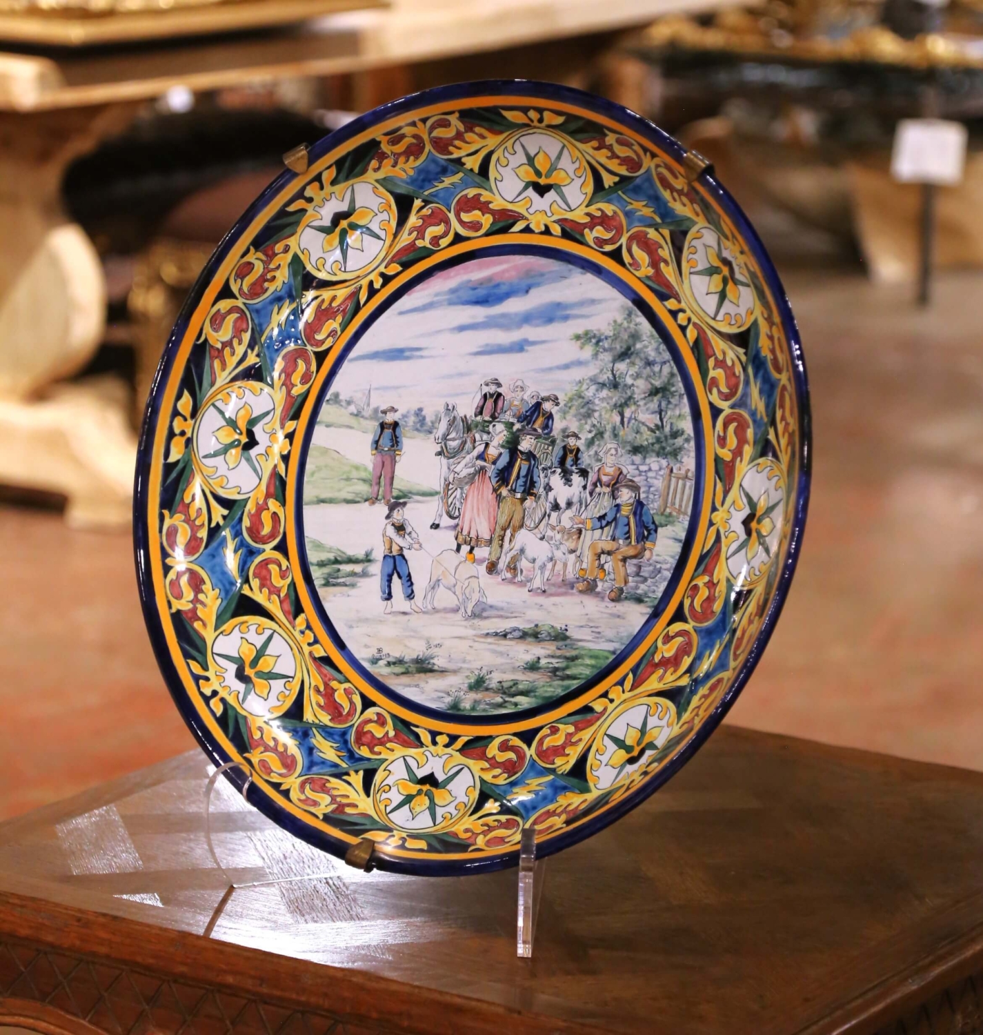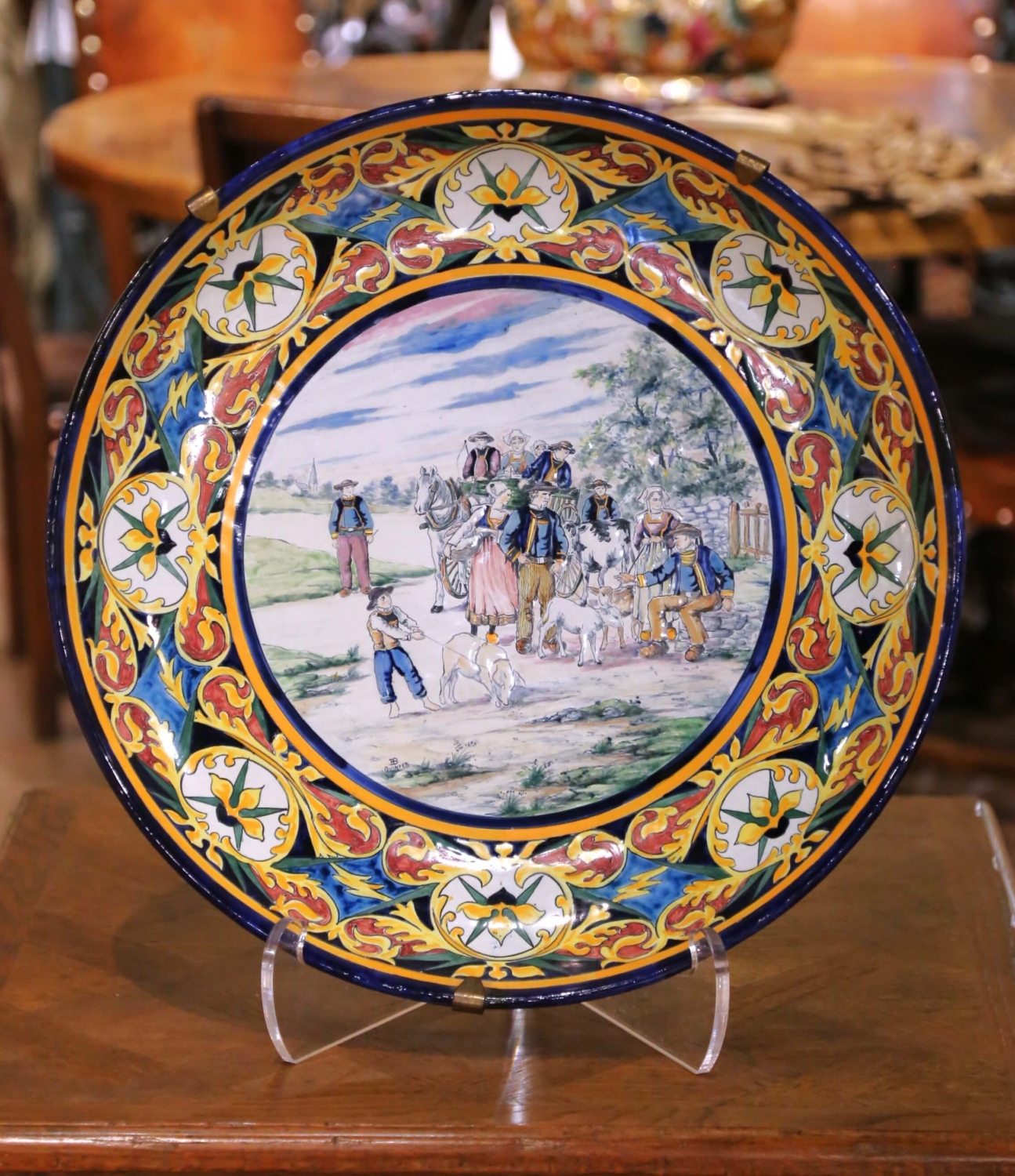 Dress a kitchen wall, dining room, or breakfast nook with this monumental antique French faience platter from Quimper, Brittany. Crafted circa 1880 and entirely hand-painted, the large circular platter features a vibrant foliated border in rich Breton palette, deep blues, saffron yellow, emerald green, garnet red, and black, encircling a pastoral central scene depicting Breton villagers with animals and a horse-drawn carriage. The underside is signed HB Quimper, identifying the work as part of the renowned Henriot production. Founded in 1690, Quimper’s faience tradition quickly became celebrated for its tin-glazed earthenware decorated with folkloric Breton subjects. By the 19th century, the Henriot workshop, later known as HB Henriot, was acclaimed for its distinctive hand-painted figures, bright palette, and decorative artistry. Each piece was decorated individually, making every platter unique. The large tray retains its period brass hanging hardware, allowing it to be displayed as wall art. Excellent overall condition commensurate with age. Hanging hardware intact. Dimensions: 22″diameter x 3H