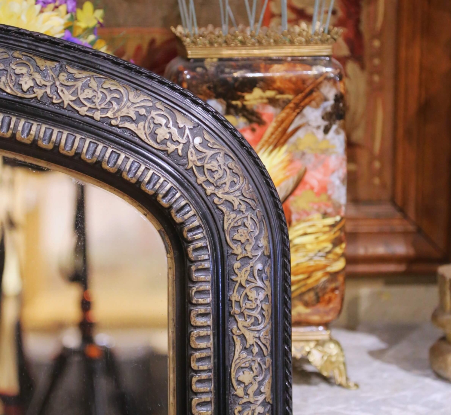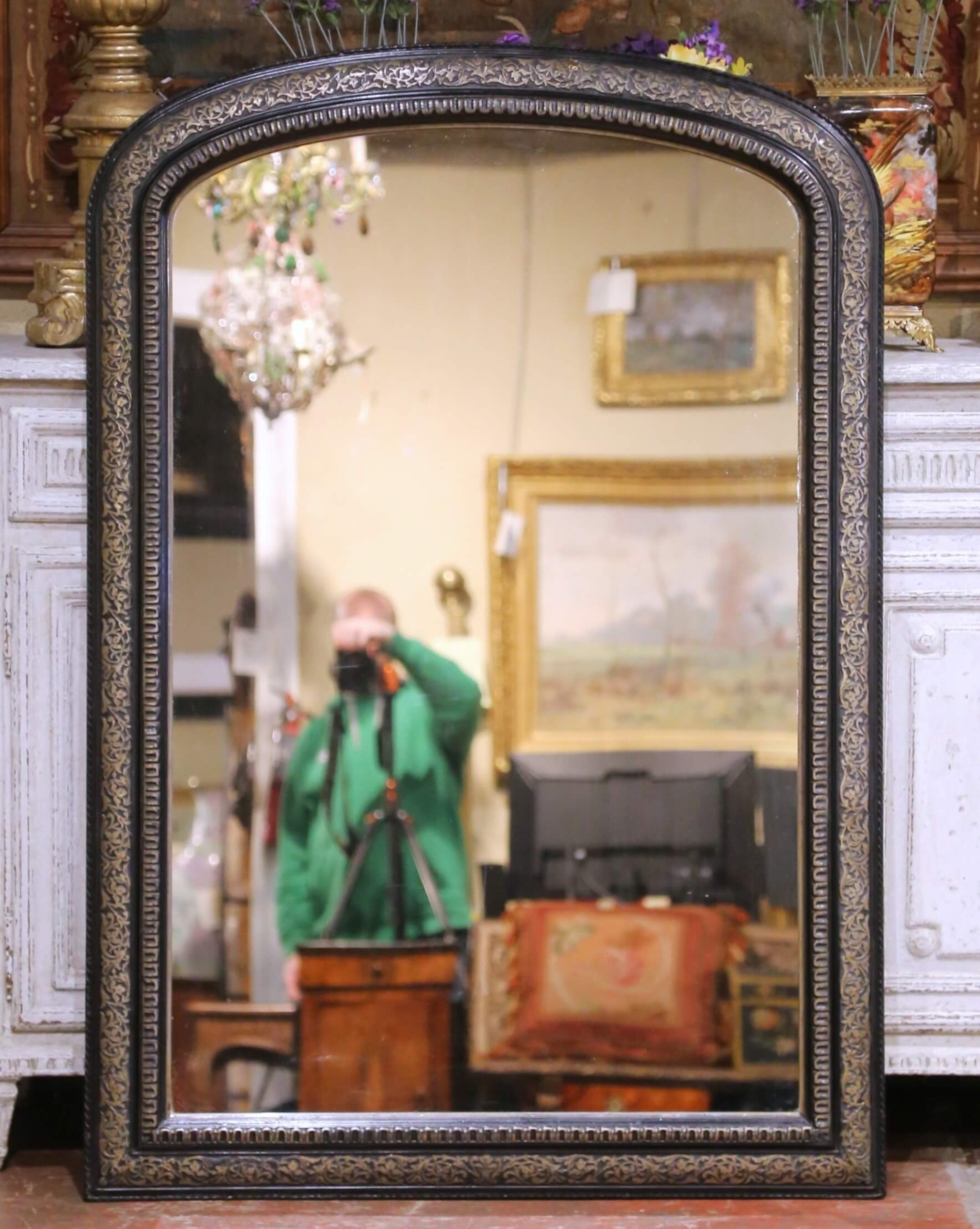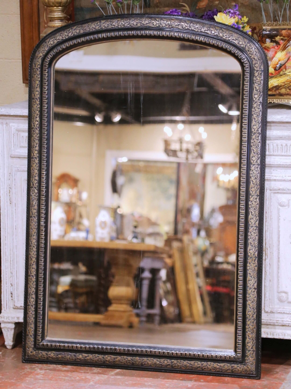 Crafted in France circa 1870, this antique Louis Philippe wall mirror features the classic arched silhouette associated with the period, defined by softly rounded upper corners and a broad molded frame. The frame is finished in a deep ebonized tone and decorated with hand-applied gilt foliate scrollwork along the outer border, creating a striking contrast against the dark ground. An interior band of repeating molded gadroons frames the glass and adds subtle depth to the design. The mirror retains its original mercury glass plate with light foxing consistent with age, enhancing its authentic antique character. The back reveals traditional plank construction and is fitted with hooks for secure hanging. Standing almost five feet tall, this antique French mirror brings strong vertical presence and classic Louis Philippe style to an entryway, powder room, bedroom, or above a console or mantel. Excellent antique condition commensurate with age and use. Dimensions: 40″W x 2″D x 57.5″H