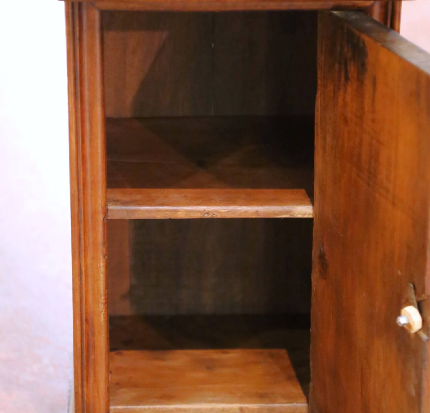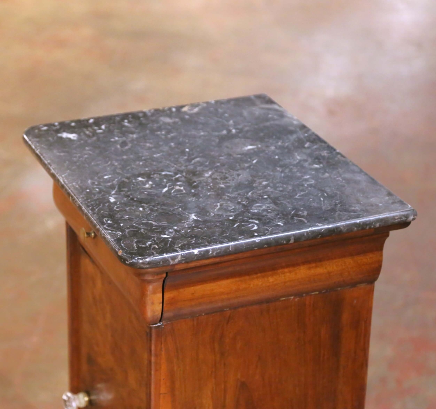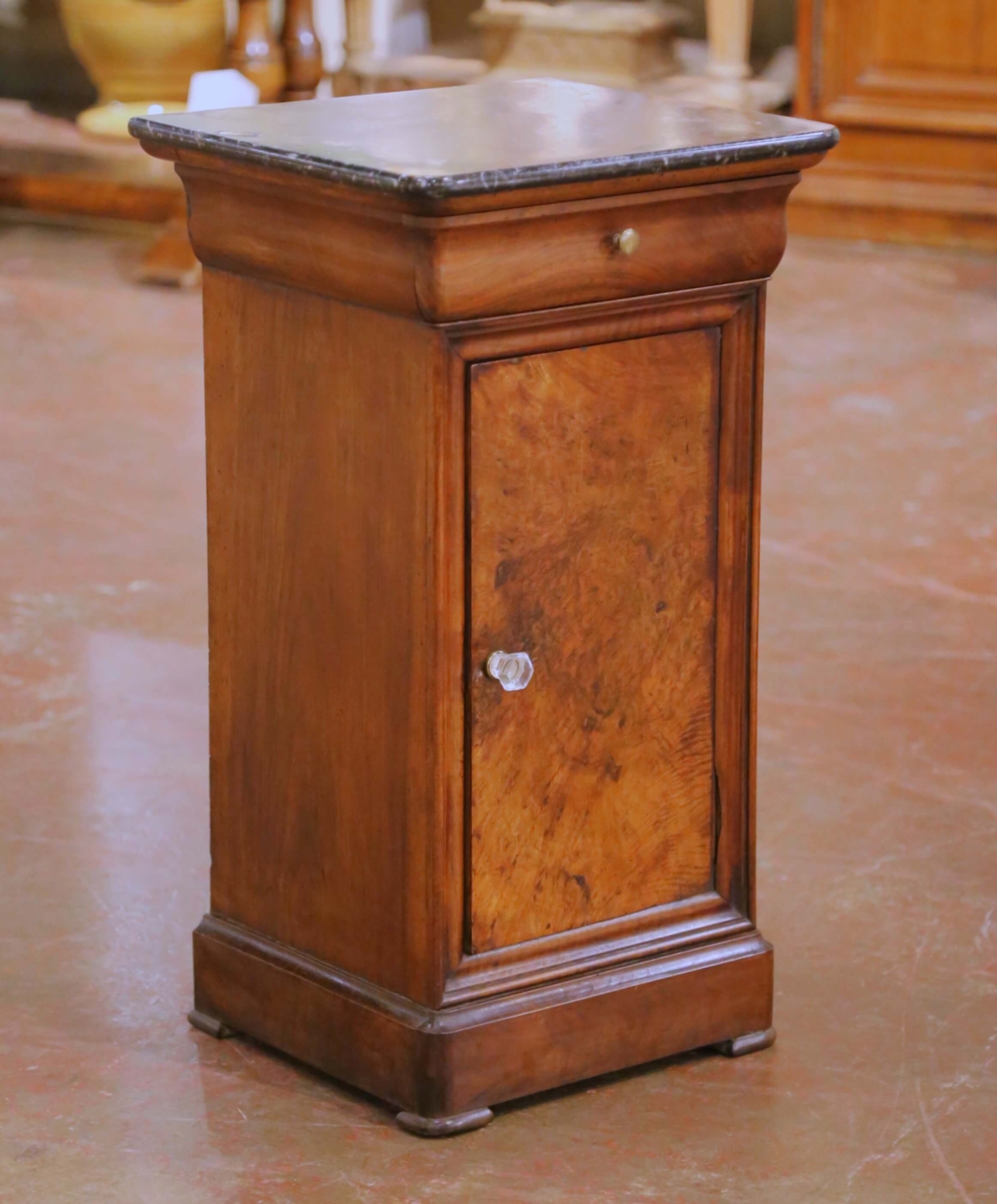 Crafted in France circa 1880, this elegant antique bedside cabinet reflects the restrained sophistication of the Louis Philippe period, emphasizing fine materials, balanced proportions, and functional design. The cabinet is constructed of solid walnut and features richly figured burl walnut panels on the door, offering striking natural movement and depth against the warm, mellow patina developed over time. The rectangular top is fitted with its original dark veined marble, likely Belgian black marble, finished with a softly molded edge that complements the understated architectural lines of the case. Below the marble surface sits a discreet single drawer fitted with a small brass knob, while the paneled door opens to reveal interior shelving, ideal for bedside or lamp-table storage. The door retains its faceted crystal pull, adding a subtle decorative note without detracting from the cabinet’s classical restraint. Raised on small block feet and finished on all sides, this antique cabinet is in excellent condition commensurate with age and use, with light wear consistent with its 19th-century origin. Versatile in scale, it functions beautifully as a bedside table, lamp stand, or occasional cabinet in both traditional and transitional interiors. Dimensions: 16.5″ W x 15″ D x 29.5″ H