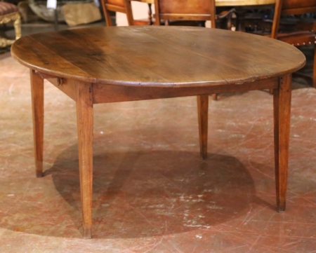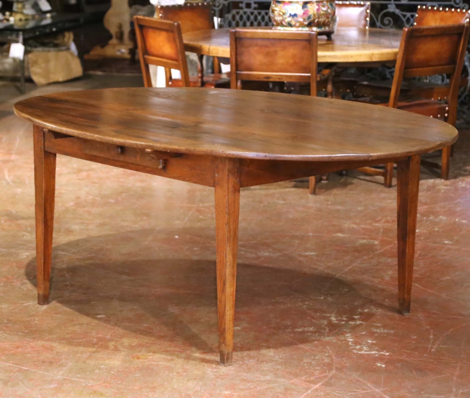 Crafted in France circa 1870, this elegant farmhouse table is a fine example of Louis Philippe period craftsmanship. Built of solid chestnut and oak, the large oval top is assembled with traditional pegged joinery and rests on four gracefully tapered legs, creating a refined yet sturdy silhouette. A single drawer is set discreetly into the apron, providing convenient storage for linens or flatware. The richly grained surface showcases a warm honey-brown patina with timeworn texture and character, reflecting generations of use and care. Measuring 76 inches long by 55 inches wide and standing 31 inches high, the table comfortably seats six to eight guests, ideal for everyday family dining or relaxed entertaining. Sturdy, functional, and full of authentic provincial charm, this antique Louis Philippe table is in excellent condition commensurate with age and use. Its understated lines and natural finish make it an effortless addition to both rustic and contemporary interiors. Measures: 76″ W x 55″ D x 31″ H.