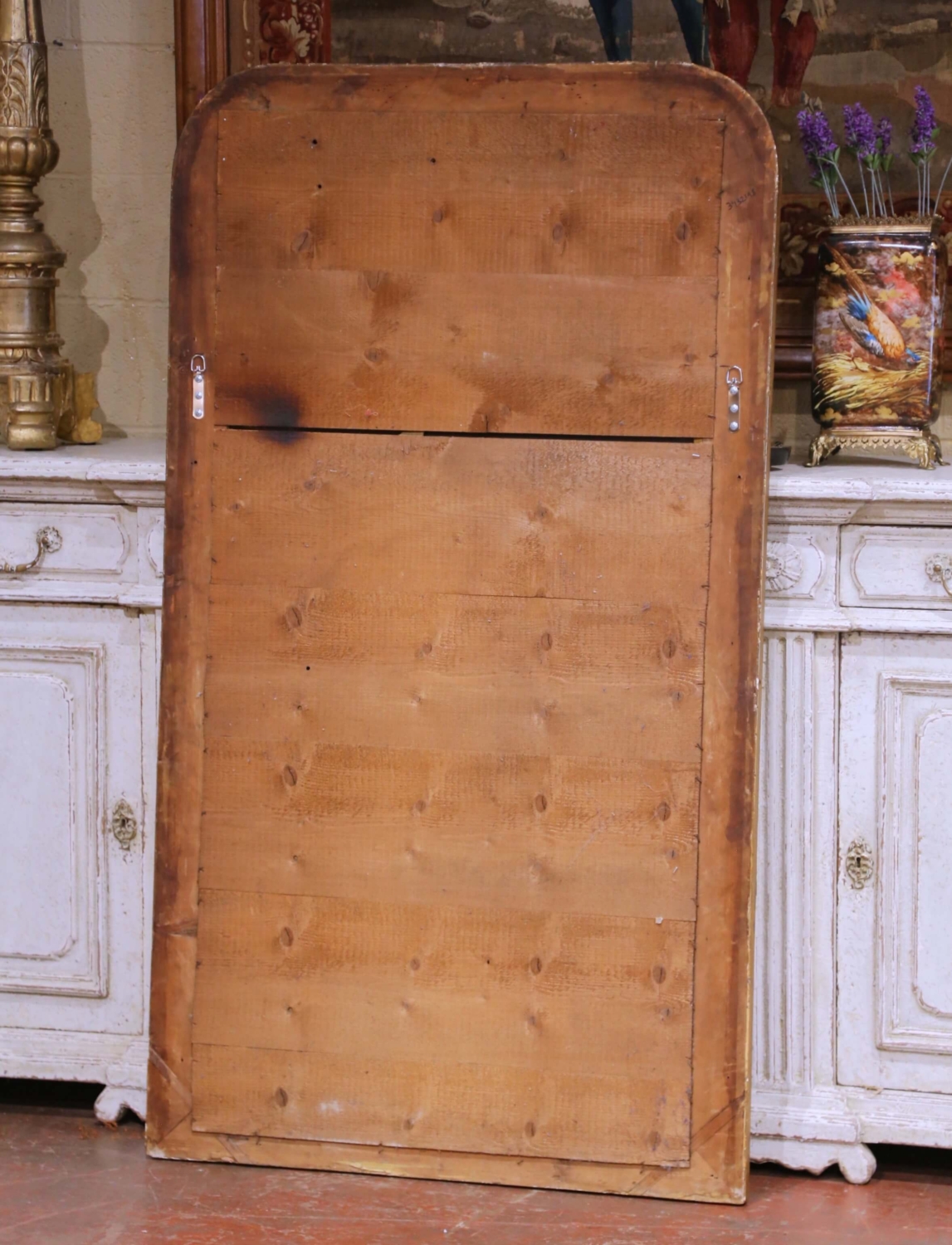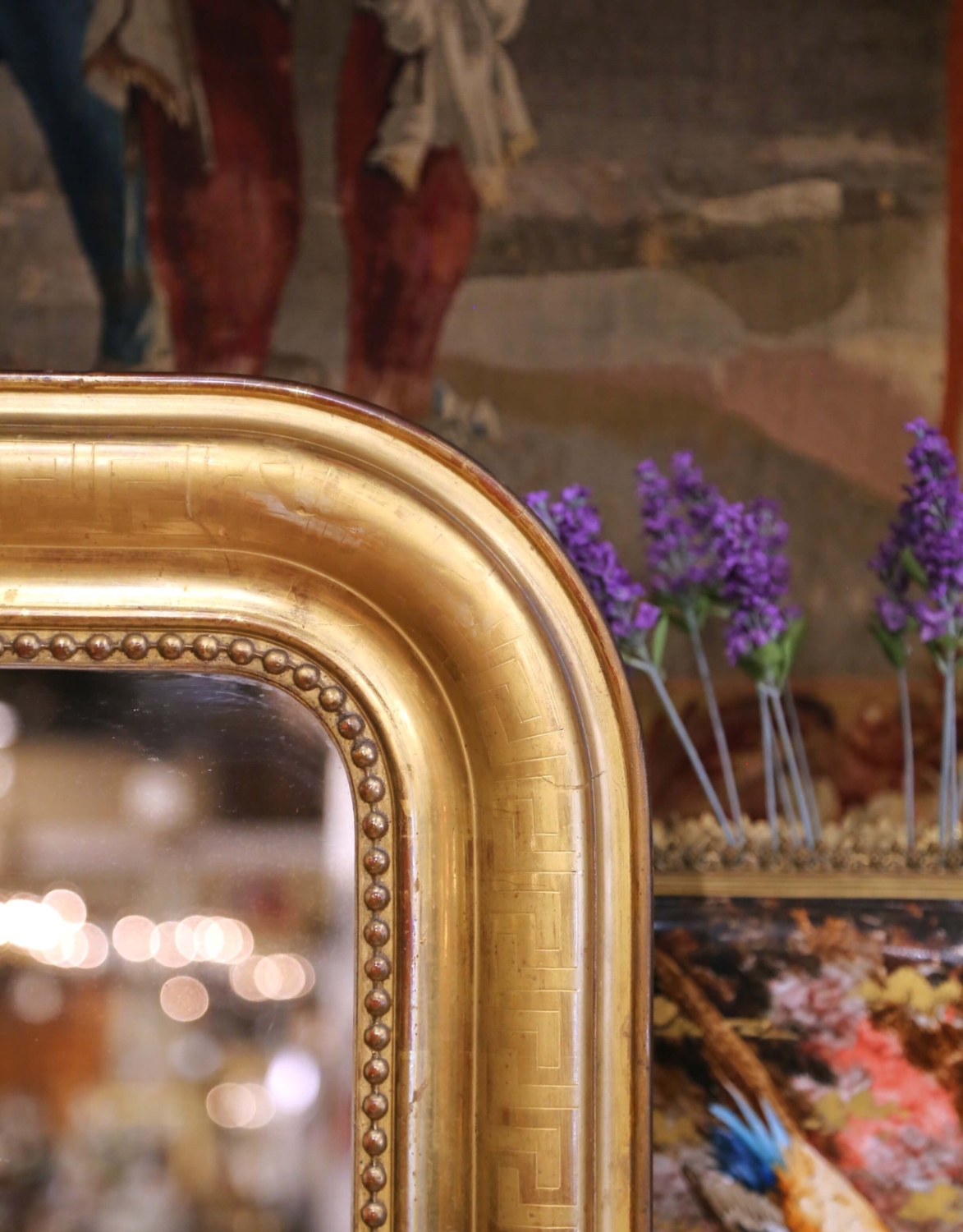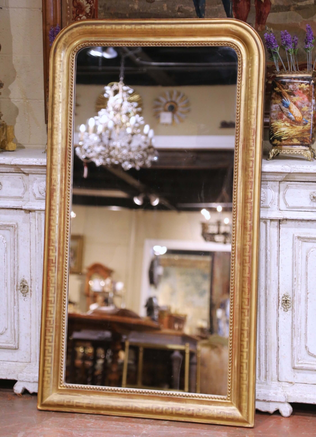 This elegant antique French Louis Philippe wall mirror was crafted in France circa 1850 and exemplifies the restrained sophistication and timeless proportions associated with the Louis Philippe period. Over five feet tall, the rectangular frame features softly rounded corners and a well-balanced profile, accented by a fine beaded inner molding and a subtly incised Greek key motif that adds quiet architectural interest without overpowering the design. The frame retains its original gold leaf finish, now aged to a warm, softly burnished patina with gentle wear that enhances its depth and authenticity. The mirror preserves its original mercury glass plate, displaying light veining, mild foxing, and tonal variation consistent with age and use, contributing to its refined, timeworn character. The original wooden backing remains intact, underscoring the quality and integrity of this well-preserved antique. Understated yet elegant, this Louis Philippe mirror is highly versatile and can be displayed leaning over a mantel, chest, or console, or hung vertically in an entryway, bedroom, or powder room, where its generous scale and soft gold finish add light, warmth, and classic French elegance. 35.25″W x 2″D x 62.25″H