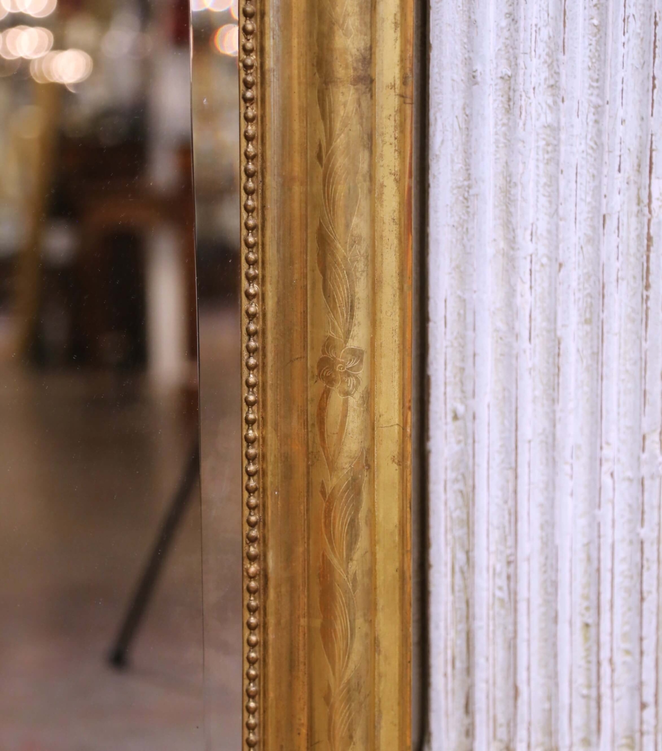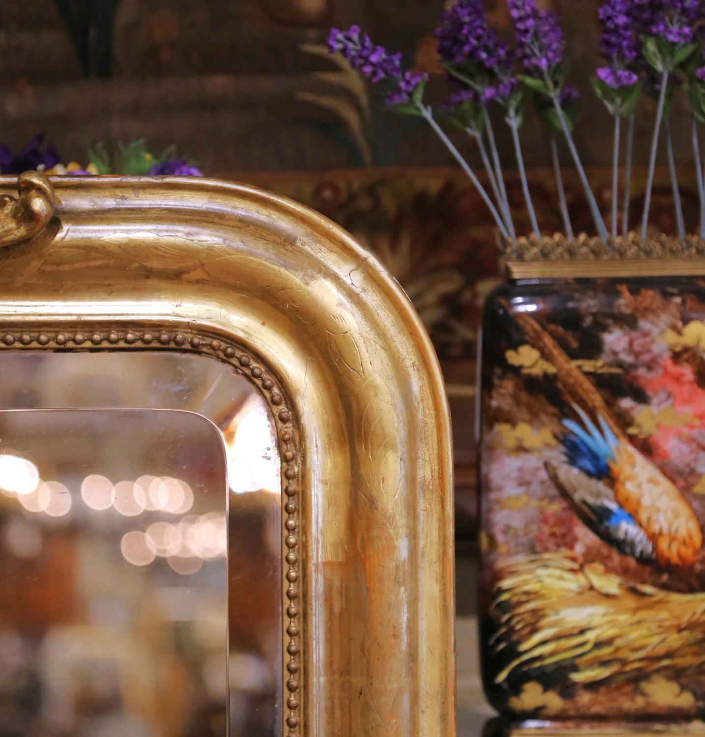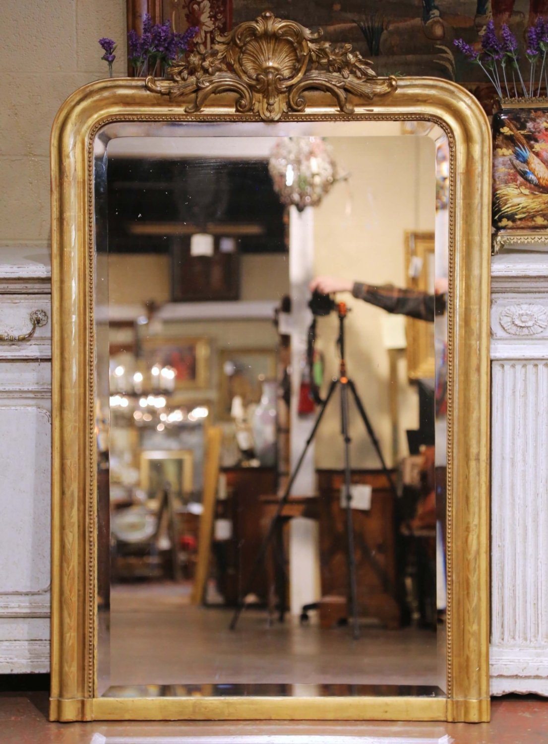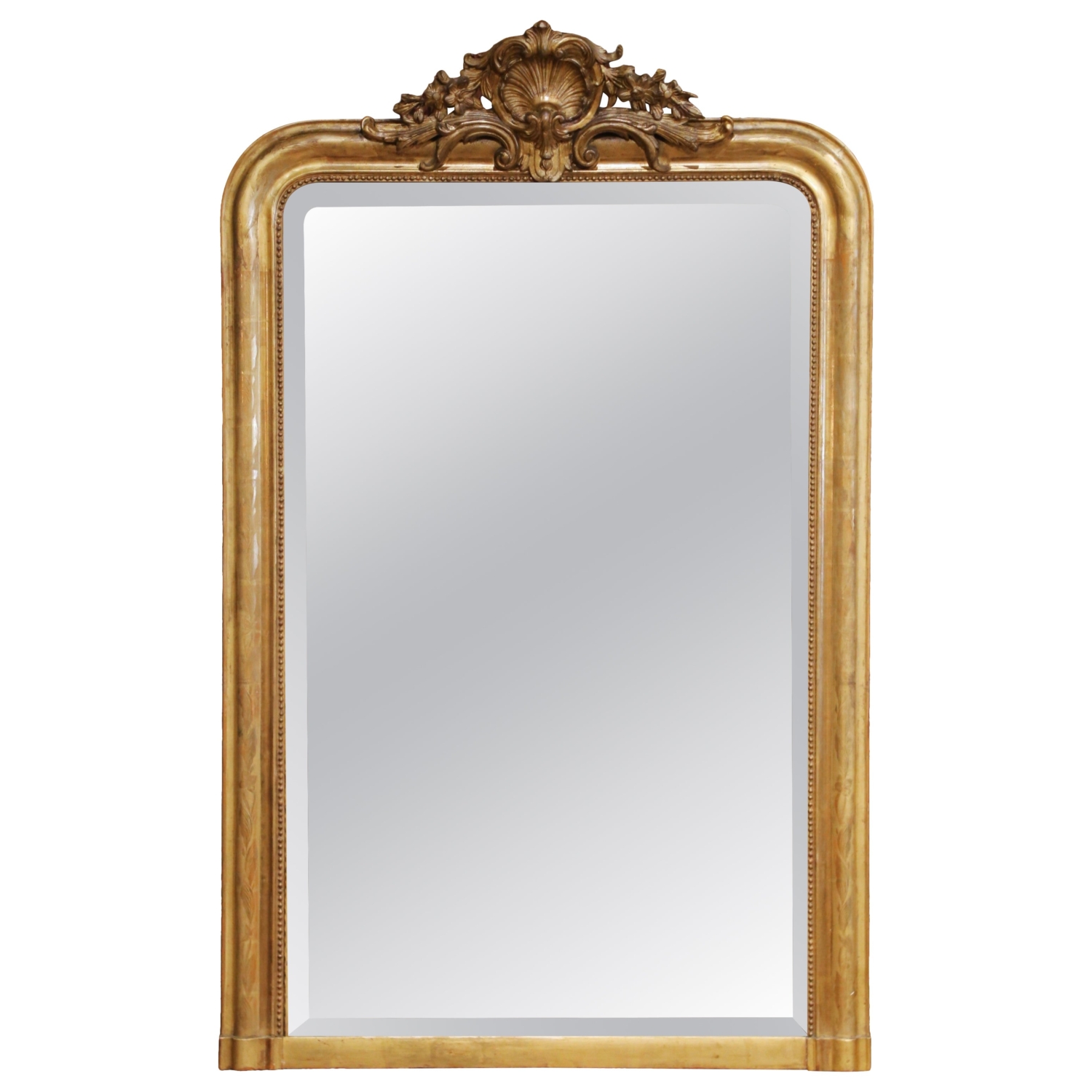 Circa 1870, this elegant antique French giltwood mantel mirror is designed in the Louis Philippe taste, featuring a gracefully shaped rectangular frame surmounted by an elaborate Rococo-style crest. The finely carved crest centers on a scallop shell surrounded by scrolling acanthus, floral sprays, and flowing foliate elements. The broad molded frame is further decorated with delicate floral engraved motifs across the gilt surface, adding refinement and subtle texture to the design. An inner beaded border neatly frames the mirror plate, while the original water-gilded finish retains a warm, mellow gold tone with attractive variations in patina that highlight the depth of the carving and engraving. The mirror retains its original mercury glass plate with beveled edge, softly reflecting light and displaying light age spotting consistent with its 19th century origin. Standing over five feet tall, the mirror has an impressive vertical presence, making it particularly well suited as a mantel mirror, though it would also display beautifully above a console, commode, or in an entryway. The reverse reveals traditional wood plank construction consistent with 19th century craftsmanship and retains its original mounting hardware. The mirror remains in excellent condition commensurate with age and use. Dimensions: 38.5″W x 5″D x 61.5″H.