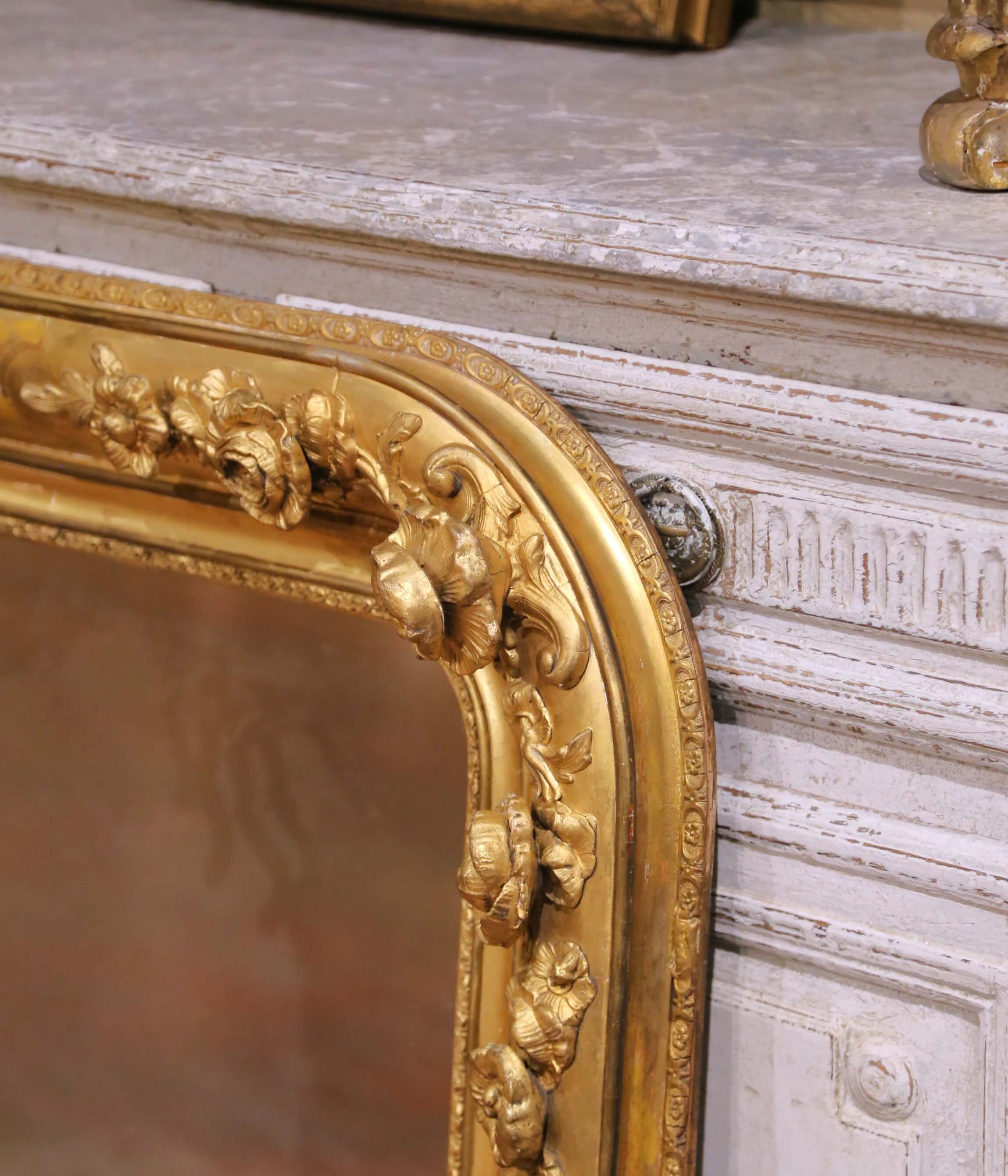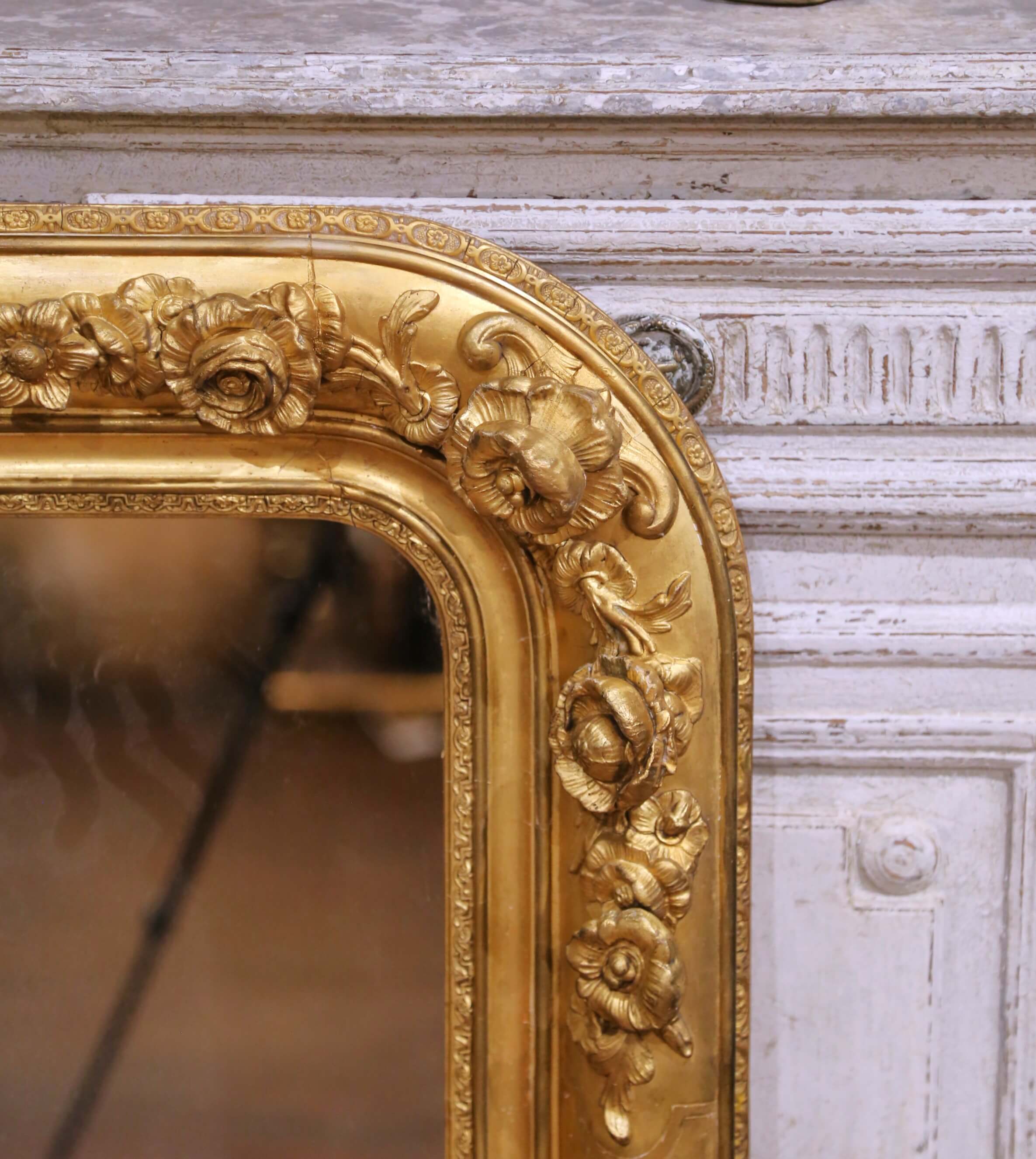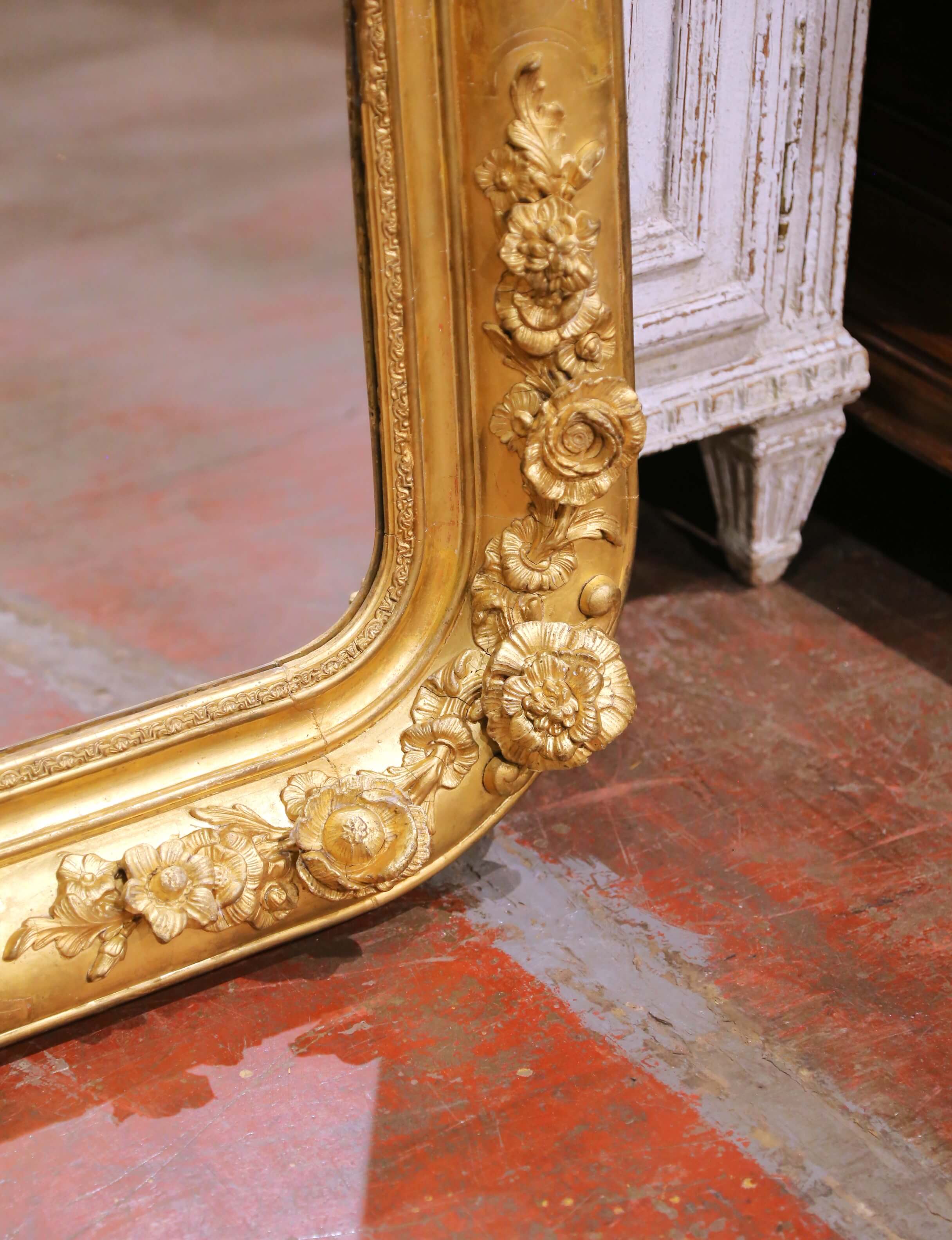 Anchor a room with this impressive antique French giltwood mirror, crafted circa 1870 in the Louis Philippe taste. The substantial rectangular frame with softly rounded corners features a richly carved surround, adorned with applied floral and foliate reliefs at the corners and along the rails. The sculptural decoration adds depth and movement, while the broad molded profile retains a warm, luminous gold finish with a beautifully aged patina.