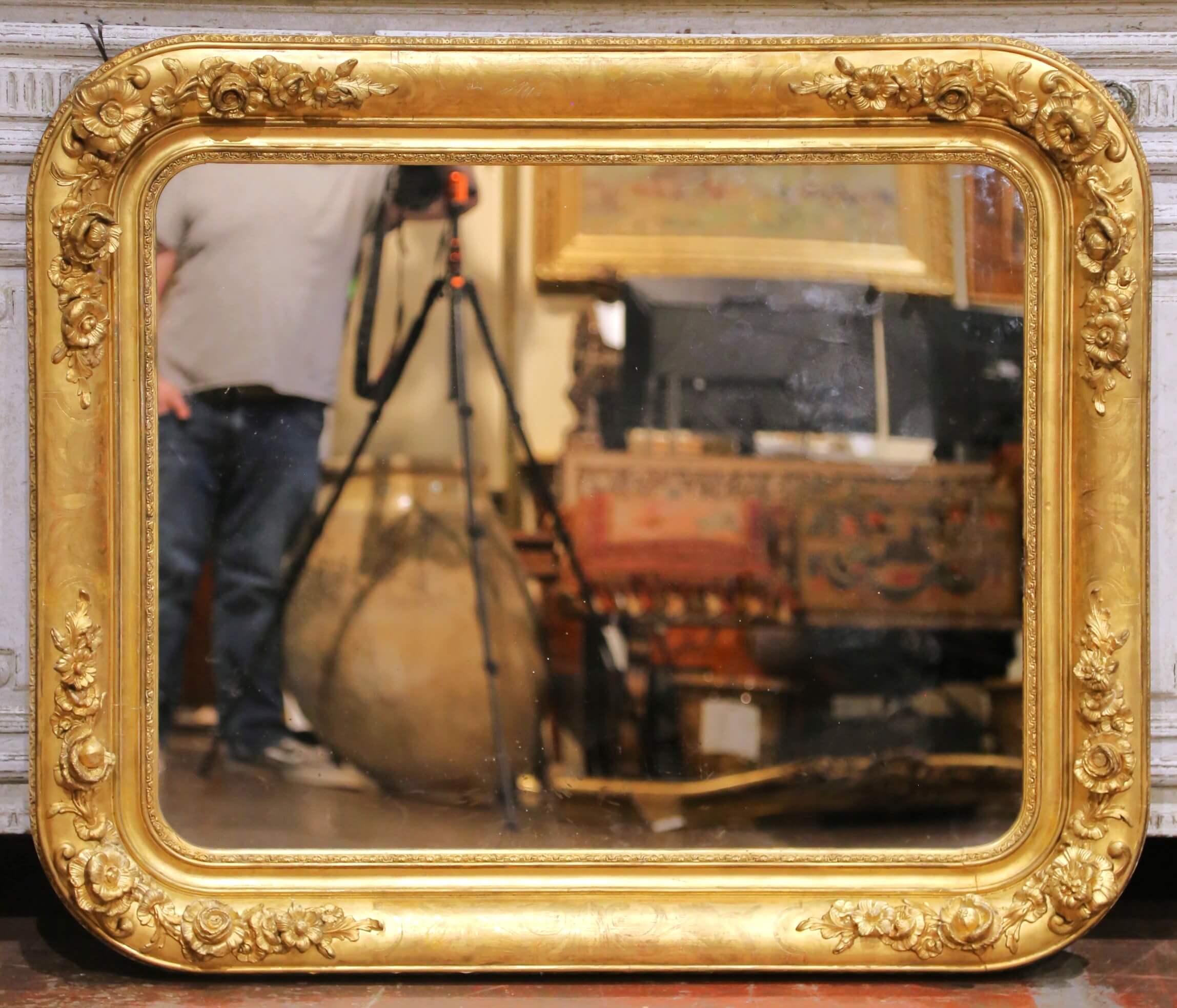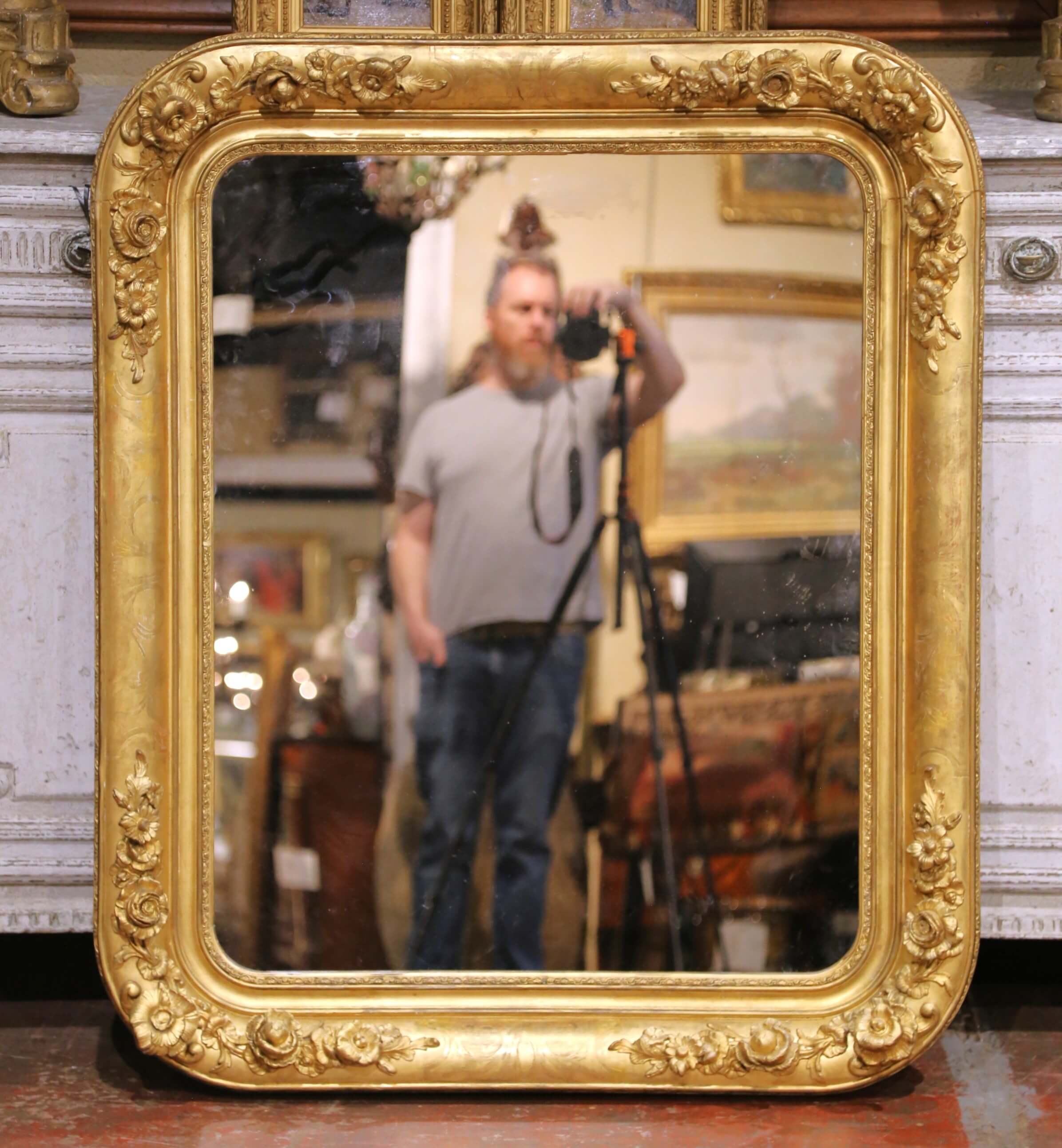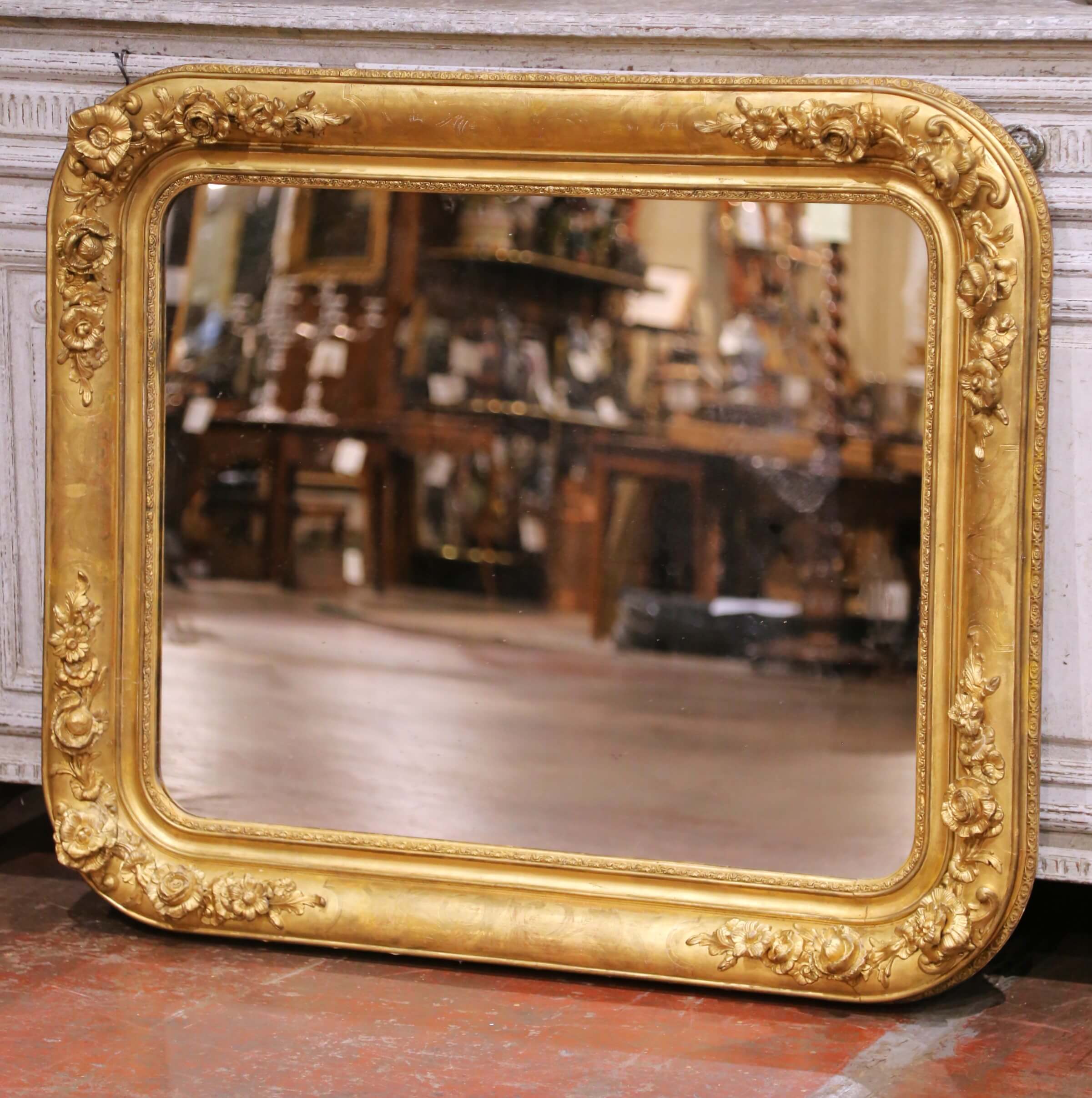 Anchor a room with this impressive antique French giltwood mirror, crafted circa 1870 in the Louis Philippe taste. The substantial rectangular frame with softly rounded corners features a richly carved surround, adorned with applied floral and foliate reliefs at the corners and along the rails. The sculptural decoration adds depth and movement, while the broad molded profile retains a warm, luminous gold finish with a beautifully aged patina.