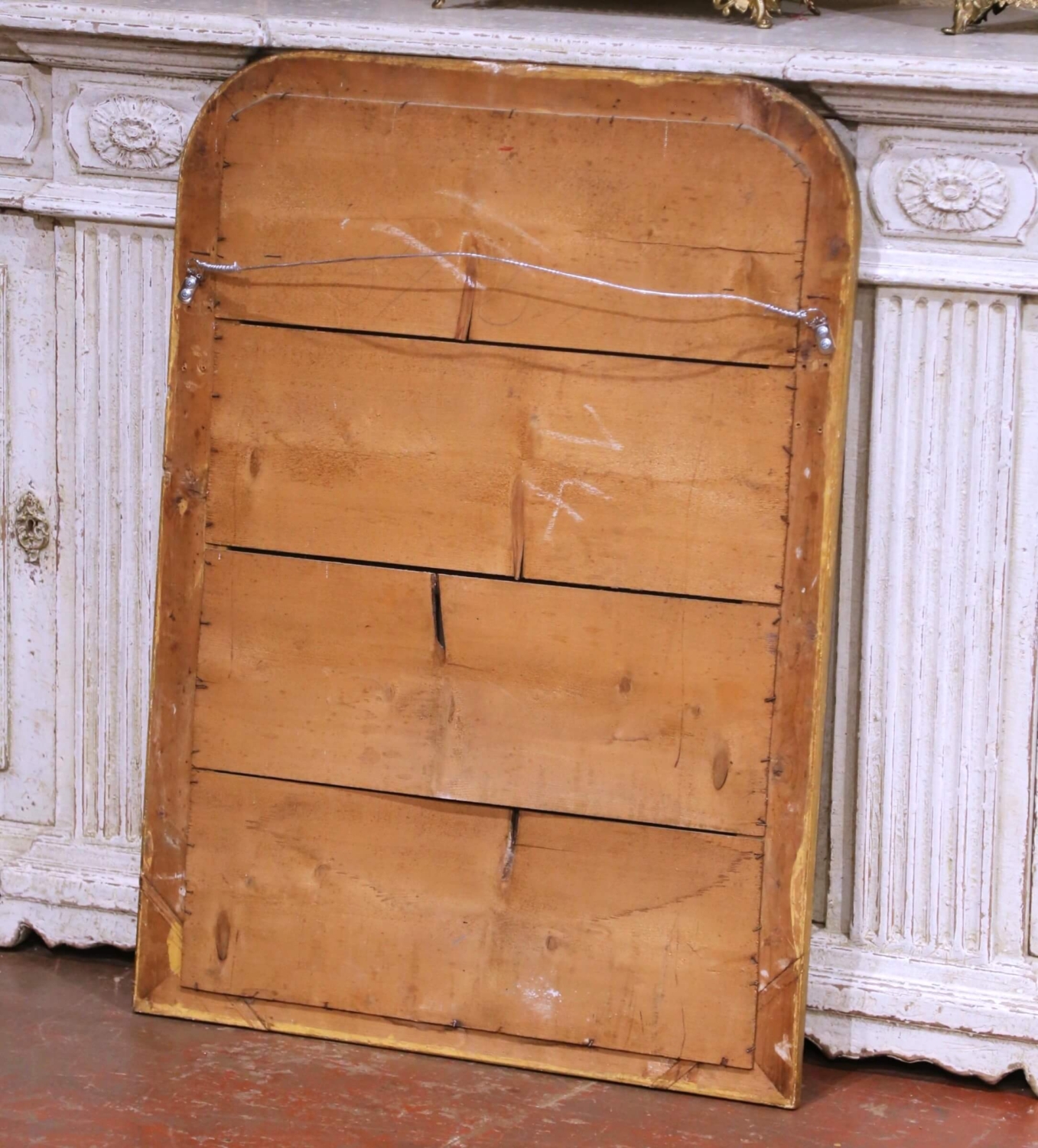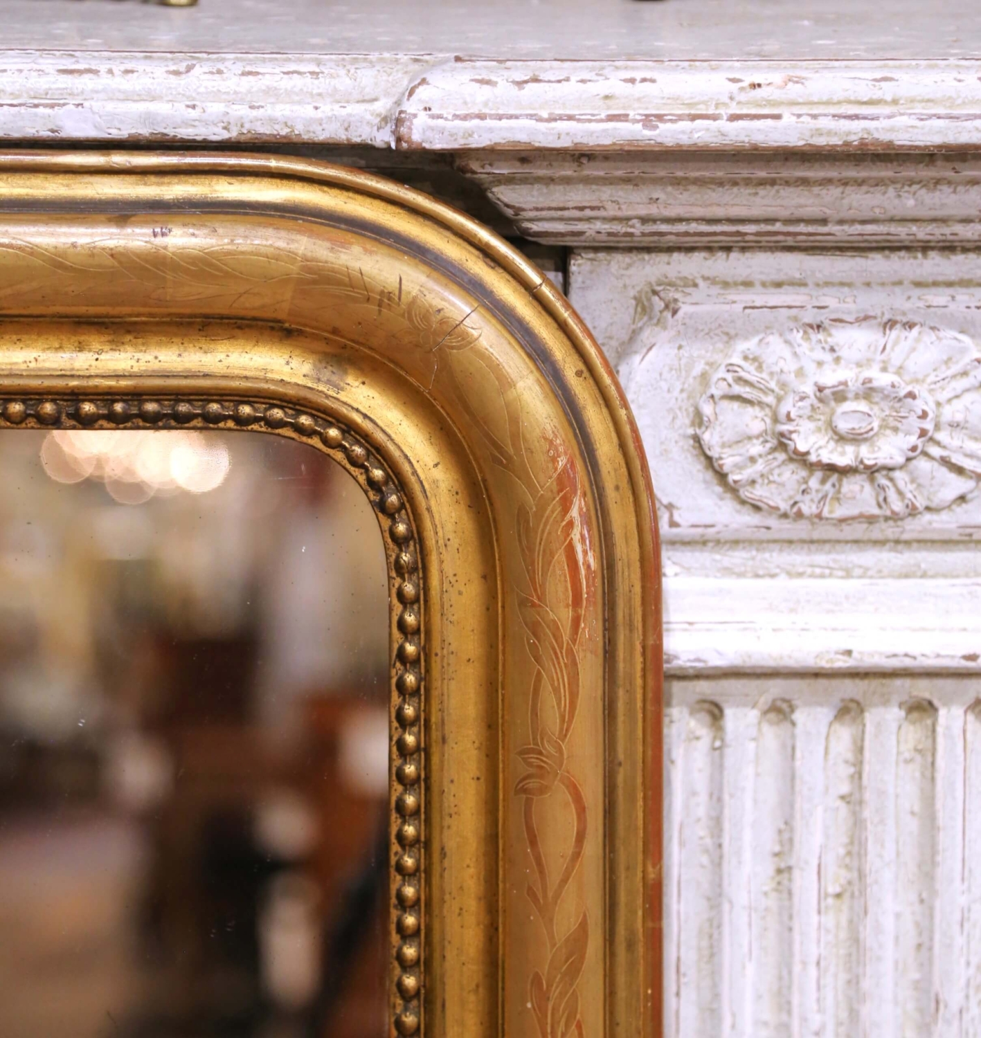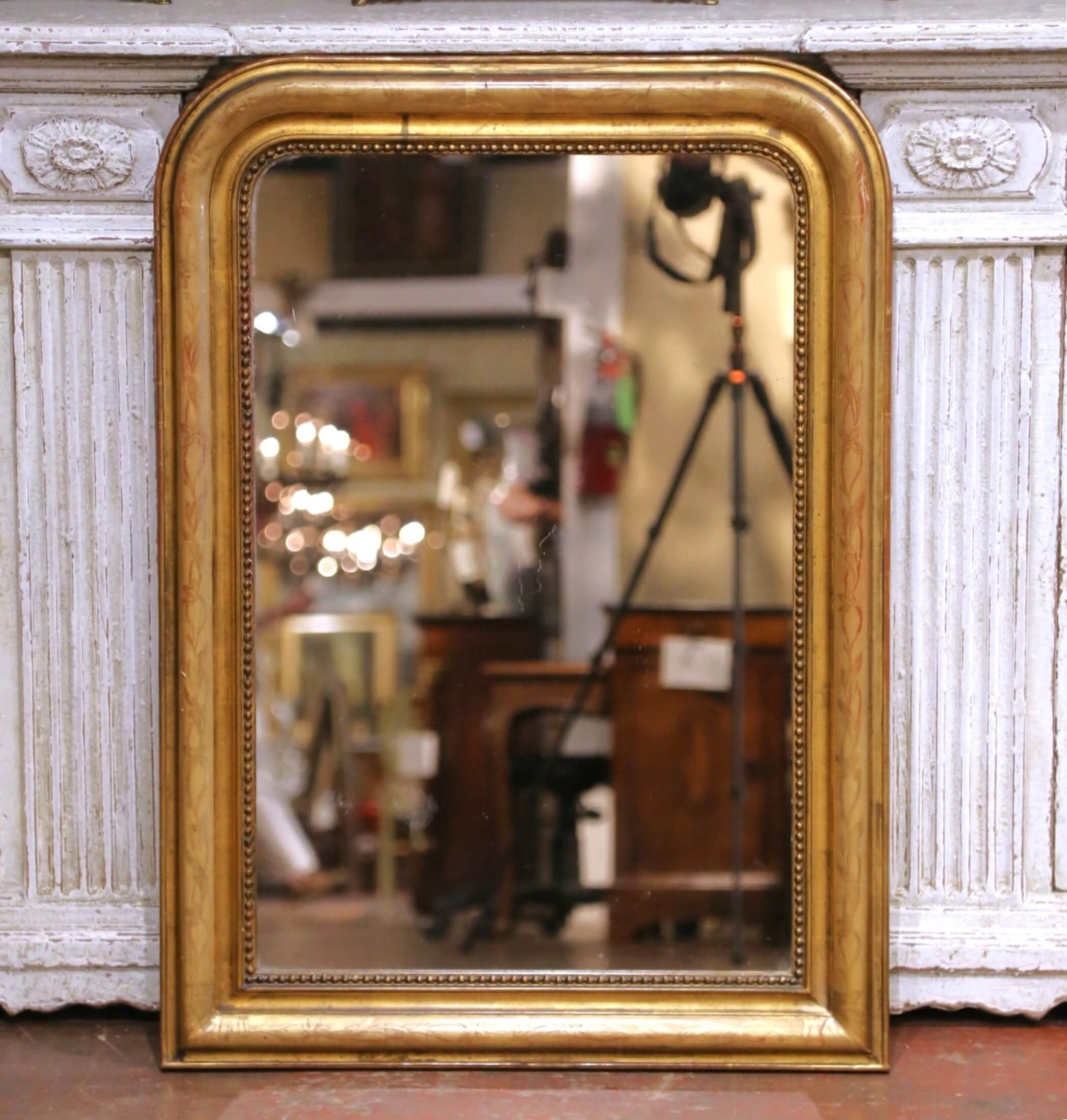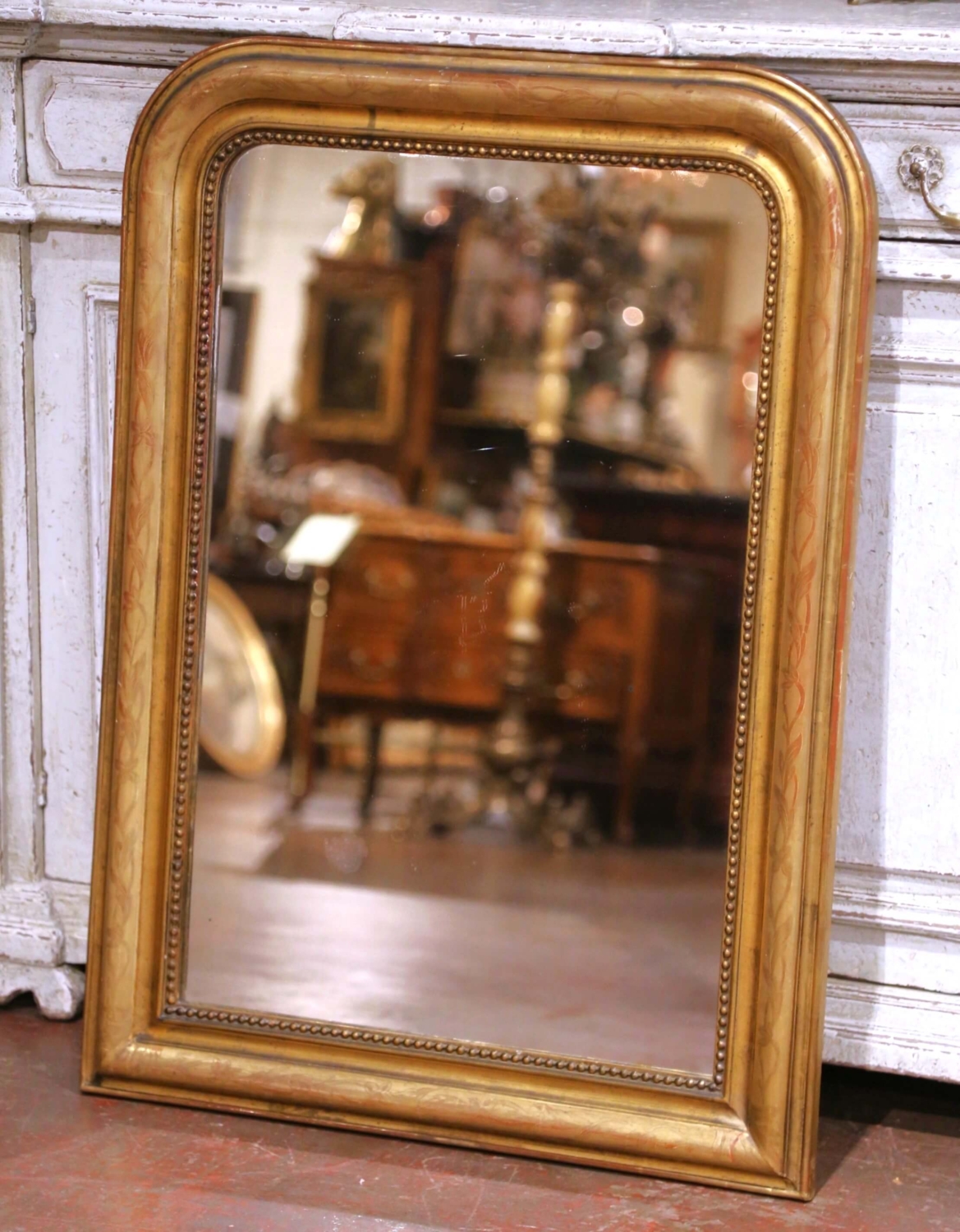This elegant antique French Louis Philippe wall mirror, crafted circa 1870, features the classic understated silhouette of the period with softly rounded upper corners and a substantial molded frame. Designed to bring both light and depth to an interior, the piece embodies the refined simplicity that defines Louis Philippe design. The frame is finished in warm gilt with a rich, time-softened patina, enhanced by delicate hand-engraved floral and foliate motifs running along the outer band. A beaded inner border adds subtle definition, drawing the eye inward to the mirror plate. The original mercury glass retains light foxing and surface wear, contributing to the authentic antique character and softly diffused reflection. The back is constructed of old wood planks, consistent with traditional 19th century craftsmanship, and fitted with a later hanging wire for ease of installation. The overall surface shows gentle wear and minor losses to the gilt, all consistent with age and use, and adding to its charm and authenticity. A versatile decorative accent, this antique mirror can be placed above a commode, console, or mantel, or used in a powder room or entryway to bring timeless French elegance to any setting. In excellent antique condition commensurate with age and use. Dimensions: 28.25”W x 1.75”D x 38.75”H