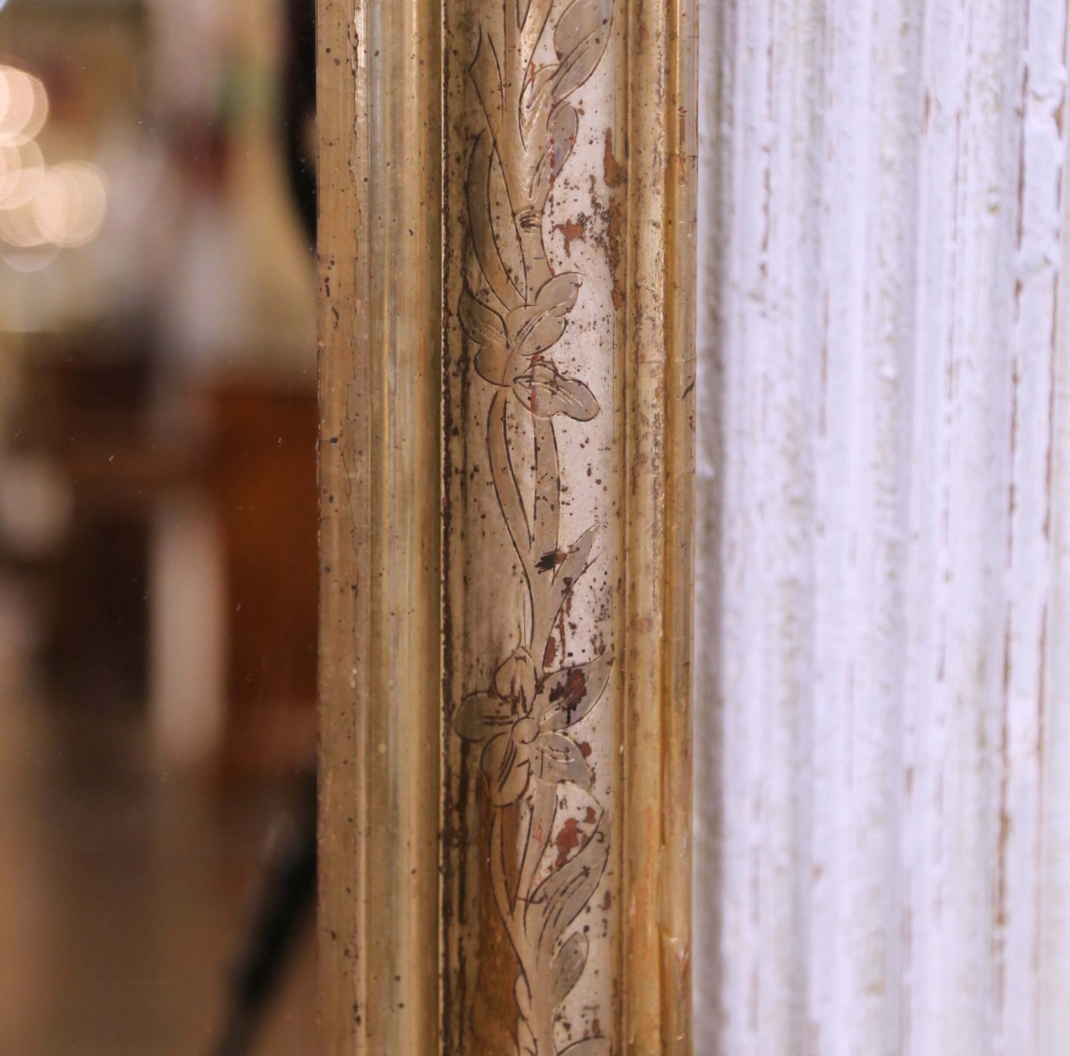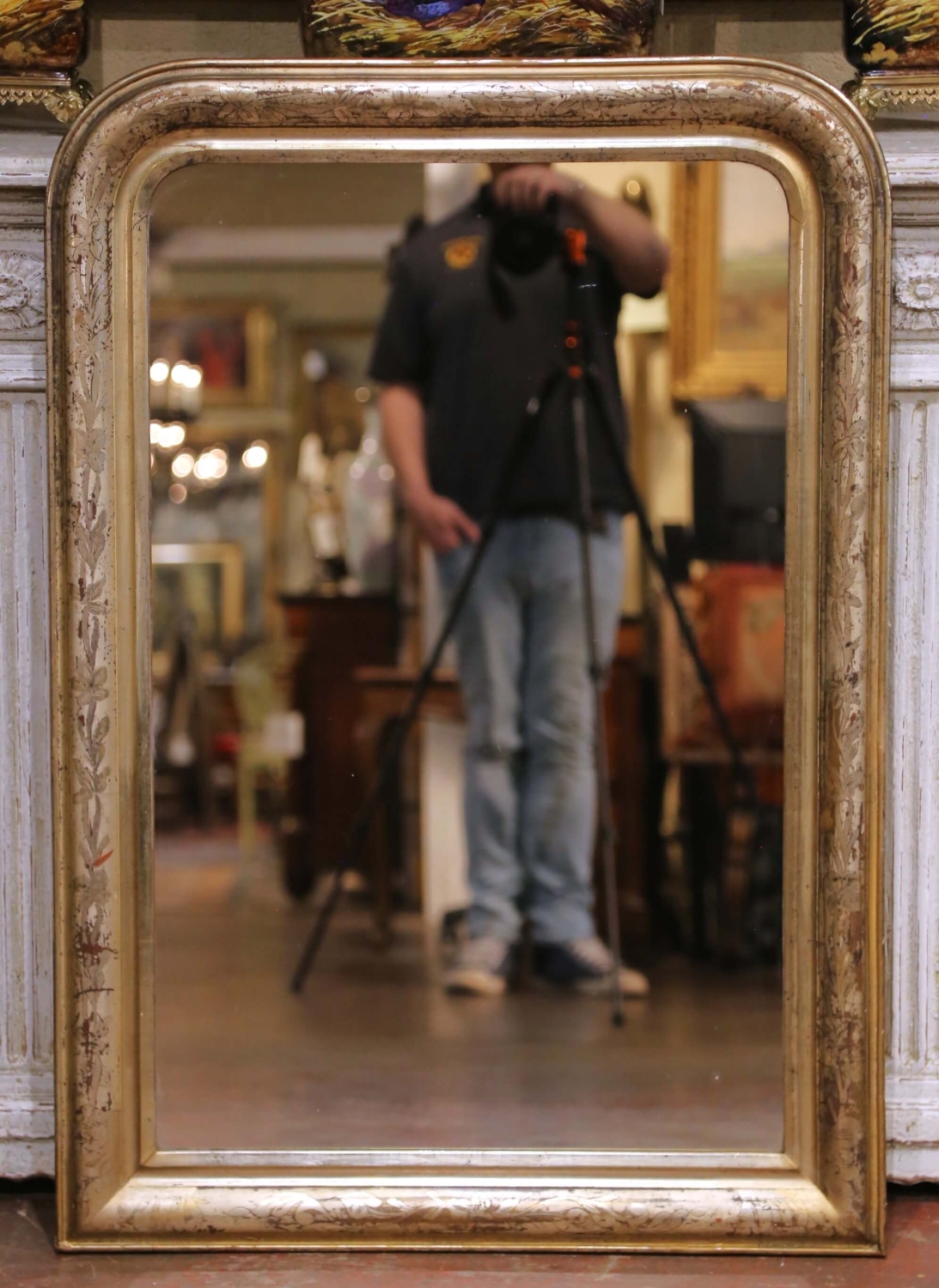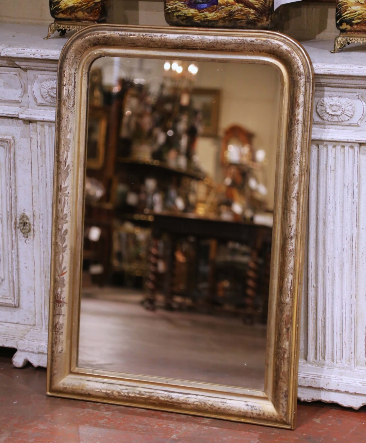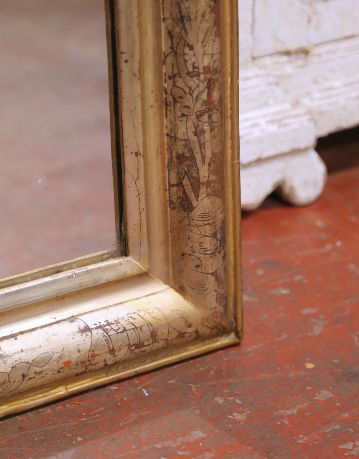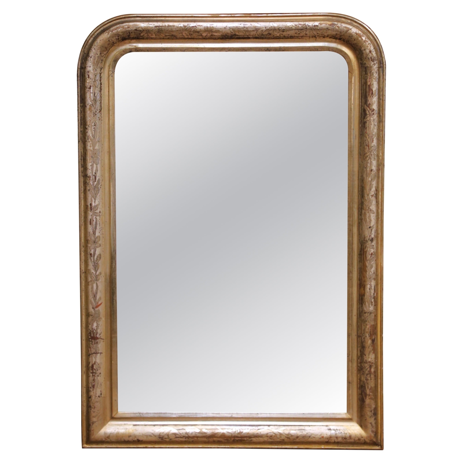 Place this elegant antique Louis Philippe mirror above a commode, console, chest, or in a refined powder room to instantly introduce warmth and classic French character to a space. Crafted in France circa 1870, the mirror features the iconic rounded rectangular silhouette associated with the Louis Philippe period, defined by softly curved upper corners and a generously molded frame. The frame is finished in silver leaf with subtle gilt accents along the inner molding, creating a refined contrast that highlights the elegant profile. The surface is beautifully decorated with delicate hand-engraved floral and foliate motifs that run throughout the frame, adding movement and craftsmanship to the design. Areas of gentle wear and natural patina reveal warm undertones beneath the silvered finish, enhancing its authentic antique character and timeworn charm. The mirror retains its original mercury glass plate, displaying light oxidation and age spotting consistent with its 19th century origin, giving the reflection a soft, romantic depth while remaining fully functional. The reverse reveals old plank construction and period mounting hardware, further confirming its traditional craftsmanship. The mirror is in excellent antique condition commensurate with age and use and retains a rich, beautifully aged finish. Dimensions: 30.5″W x 1.5″D x 43.5″H