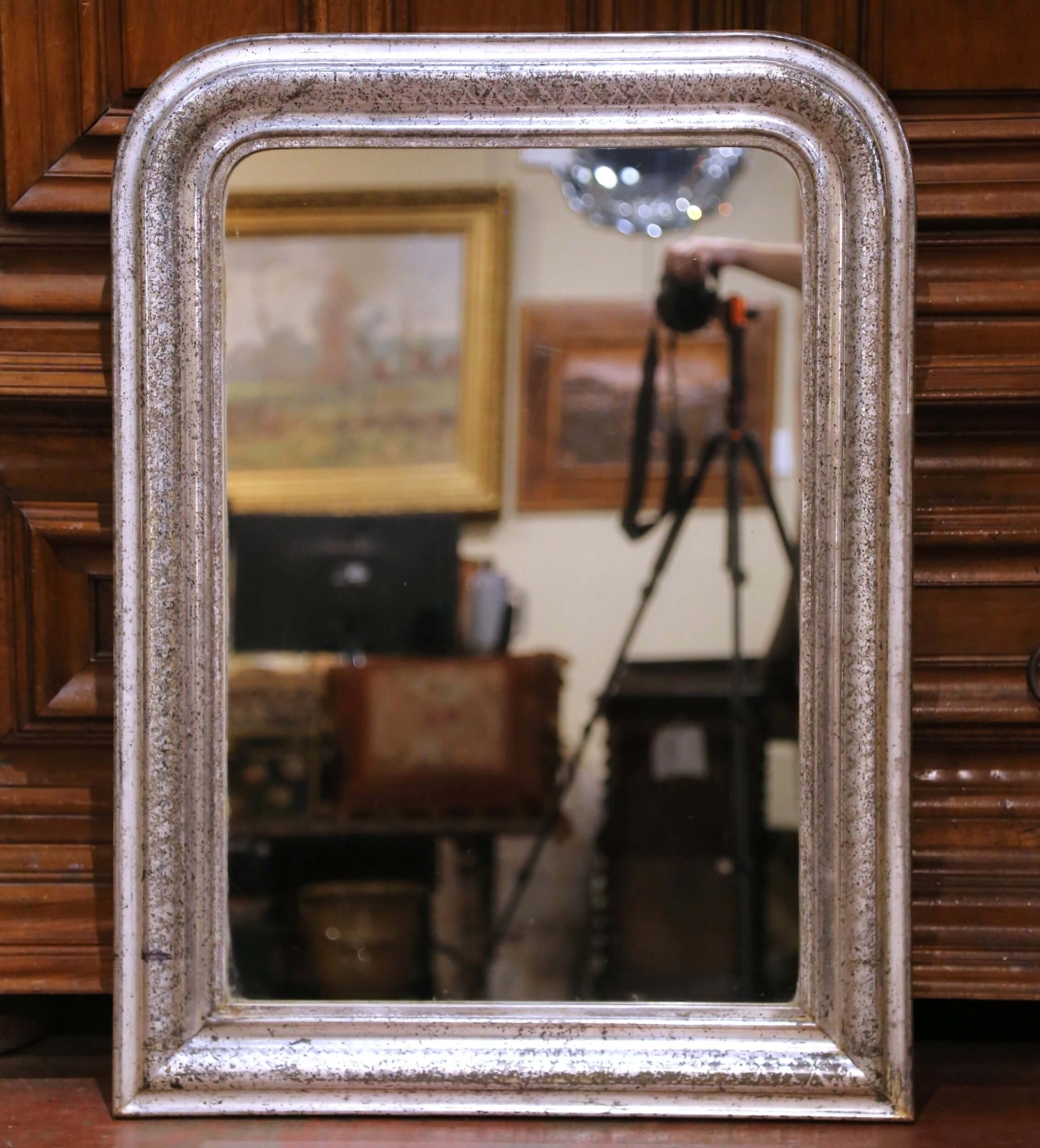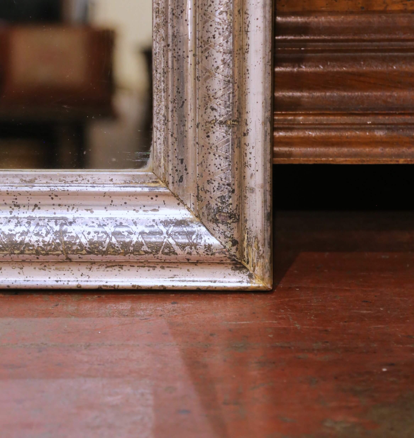 Circa 1870, this elegant French wall mirror reflects the restrained refinement of the Louis Philippe period. The rectangular frame with softly rounded corners is crafted in wood and finished in hand-applied silver leaf that has developed a beautiful aged patina over time. The wide molded frame is decorated with a subtle engraved crosshatch motif running along the inner band, adding quiet texture and depth while maintaining the clean architectural lines characteristic of the style. The original mercury glass plate remains clear and bright, offering a soft reflection typical of 19th century mirrors. The silver leaf finish shows natural rubbing and gentle tonal variation that enhance its authentic antique character and highlight the timeworn surface expected from a piece of this age. The back reveals traditional plank construction and period mounting, further confirming its age and craftsmanship. This antique French mirror works beautifully above a commode, console, or in a powder room, entry, or bedroom where its understated elegance complements both traditional and transitional interiors. The piece is in excellent condition commensurate with age and use. Dimensions: 30.5″W x 41″H