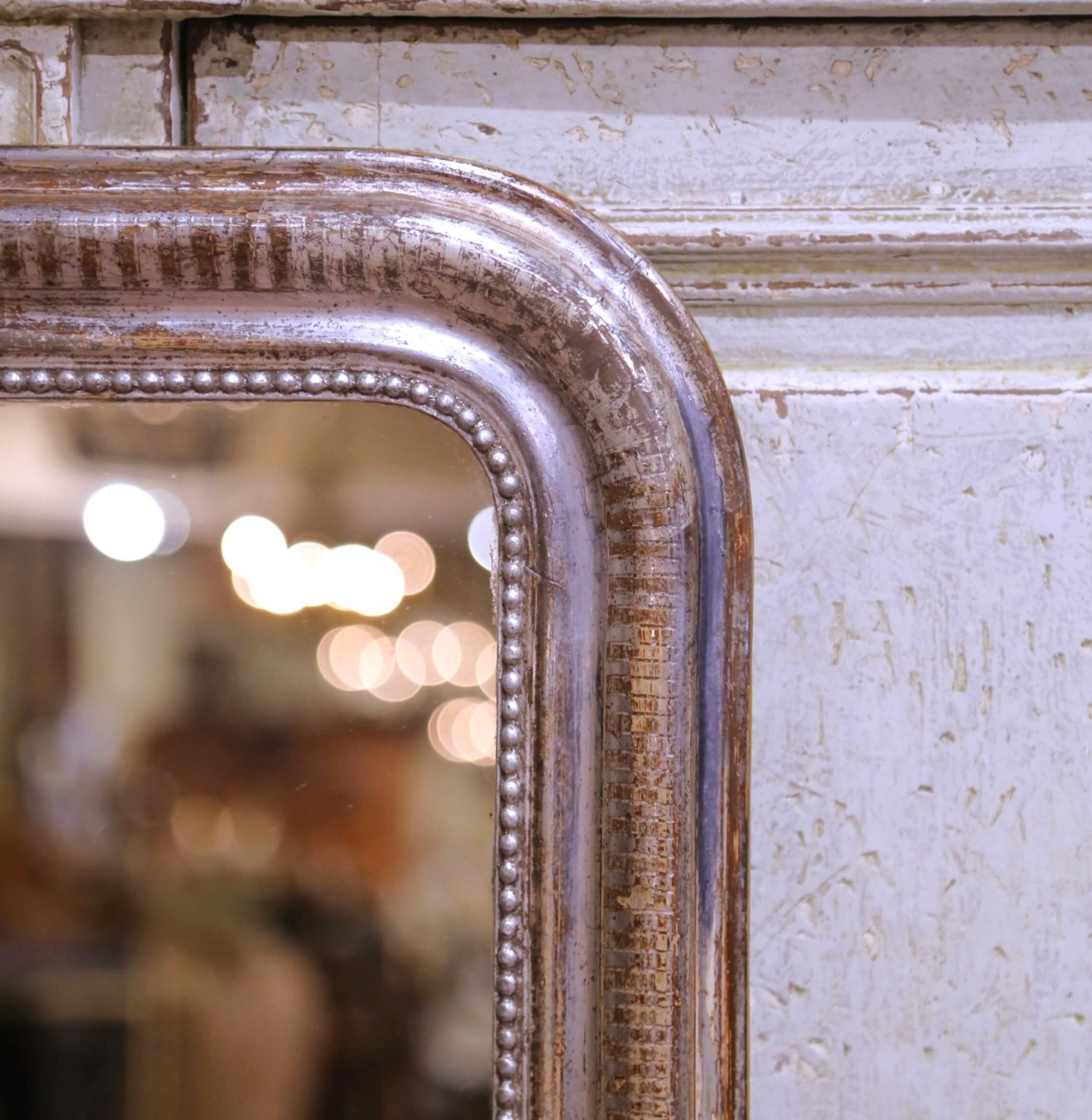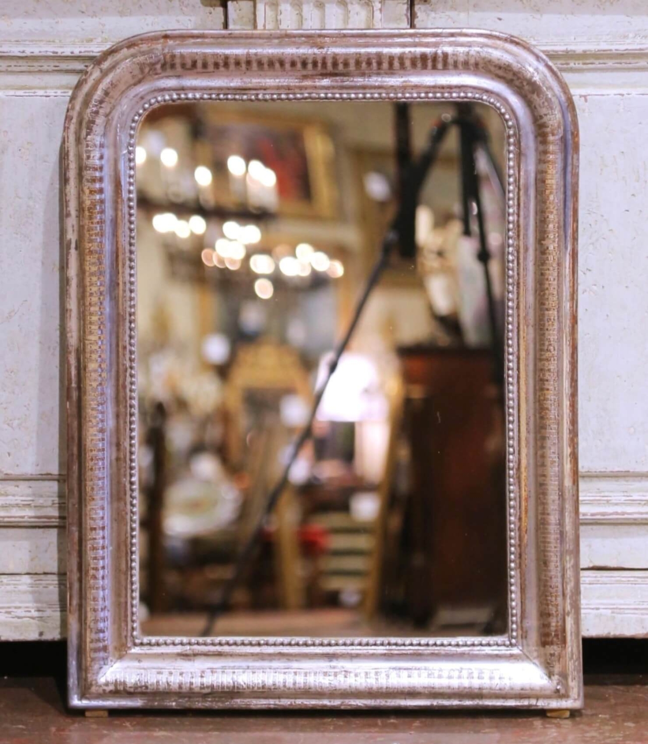 Crafted in France circa 1870, this elegant antique Louis Philippe wall mirror reflects the refined simplicity characteristic of the period. The rectangular frame features softly rounded corners and a stepped profile, decorated with finely incised linear stripe motifs and an inner beaded molding that provides subtle definition without excess ornament. The frame is finished in silver leaf, now presenting a softly worn, time-earned patina that enhances its warmth and authenticity. The mirror glass has been professionally replaced, offering a clean, clear reflection while preserving the integrity of the antique frame. The backing has also been professionally replaced for added stability, and new hanging wire has been installed for secure and easy mounting. The silvered surface displays light wear and tonal variation consistent with age and use. Well proportioned for a powder room, hallway, dressing area, or above a small console or chest, this antique French wall mirror brings understated Louis Philippe elegance and timeless decorative appeal to both classic and transitional interiors. The piece is in excellent condition commensurate with age and use. Dimensions: 22″W x 1.5″D x 29.75″H