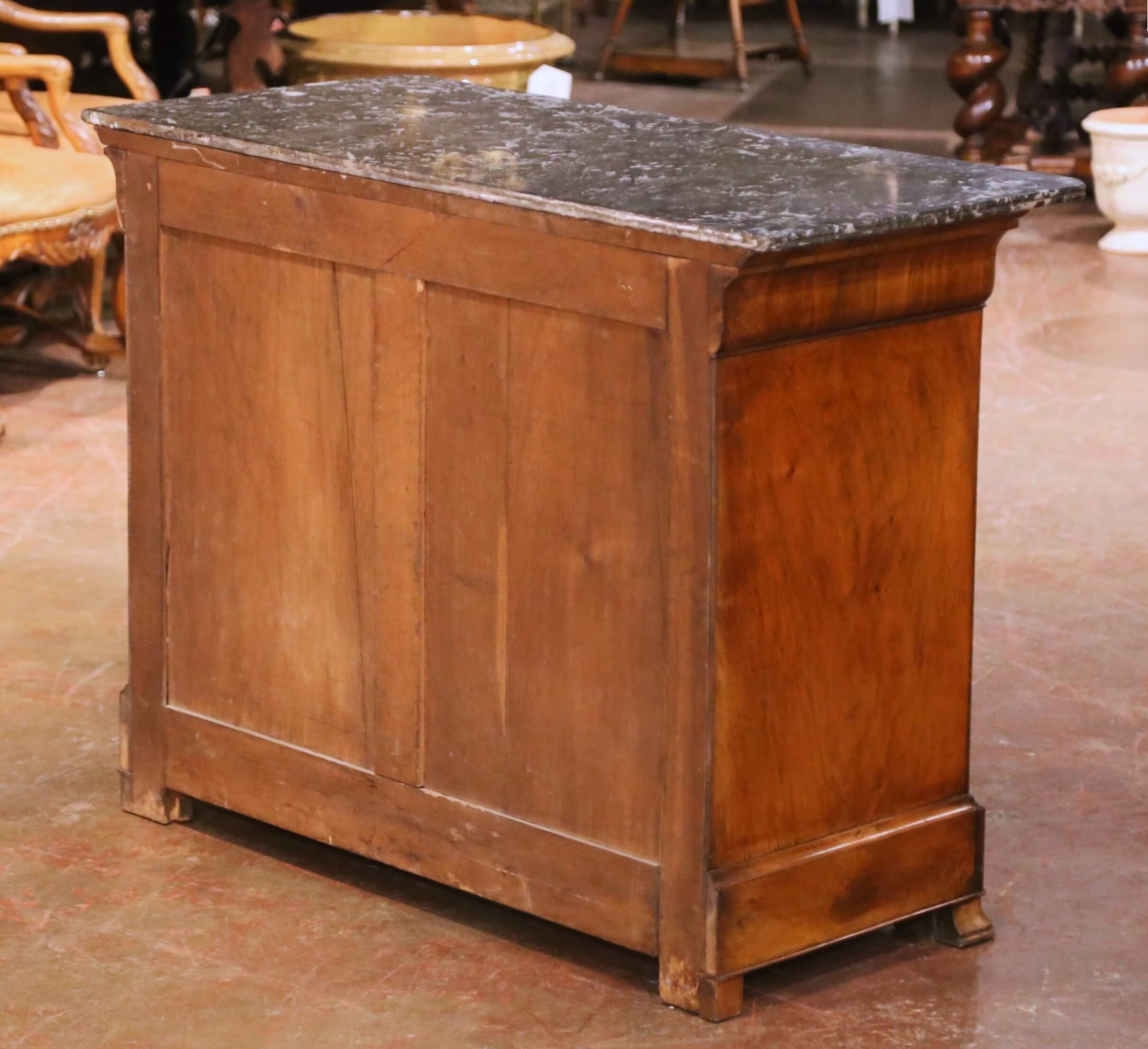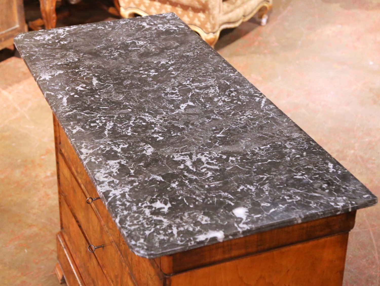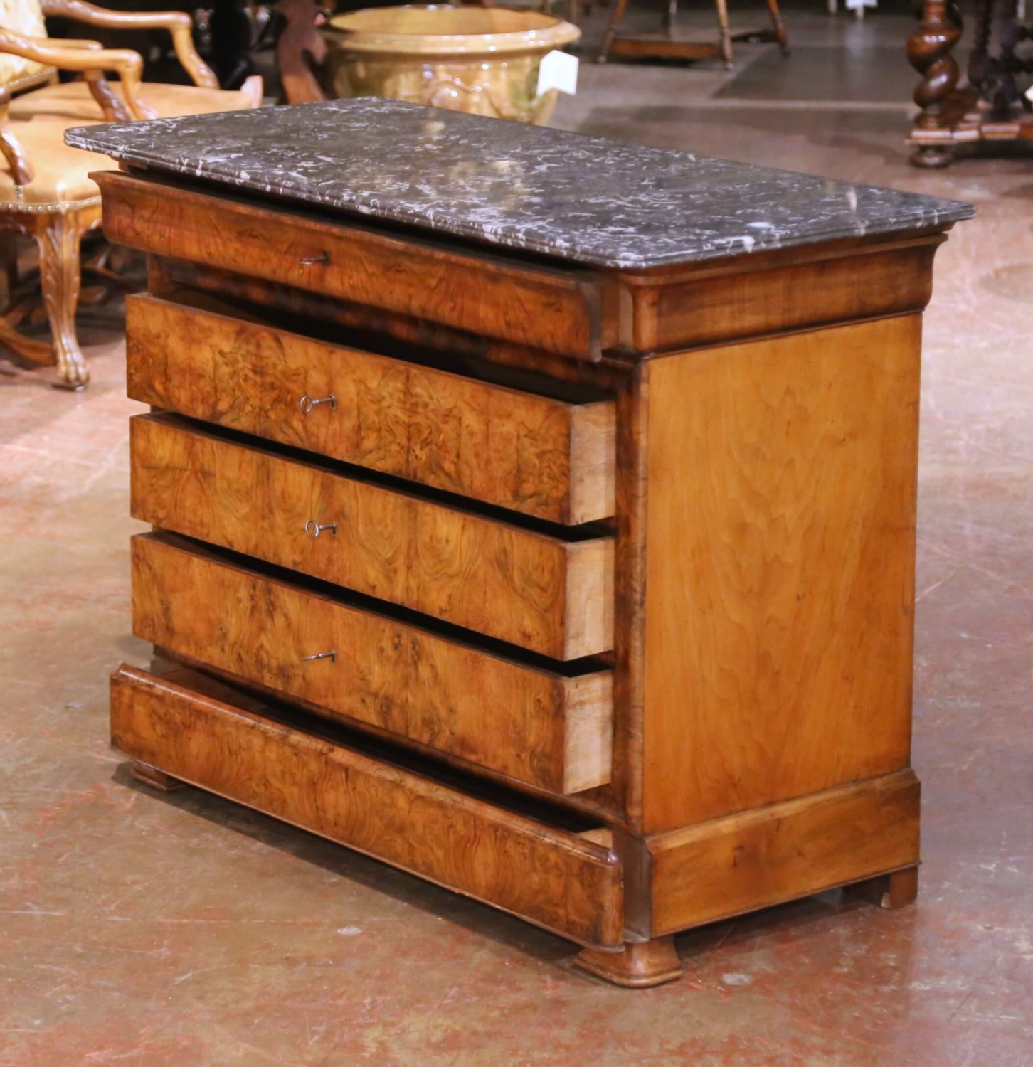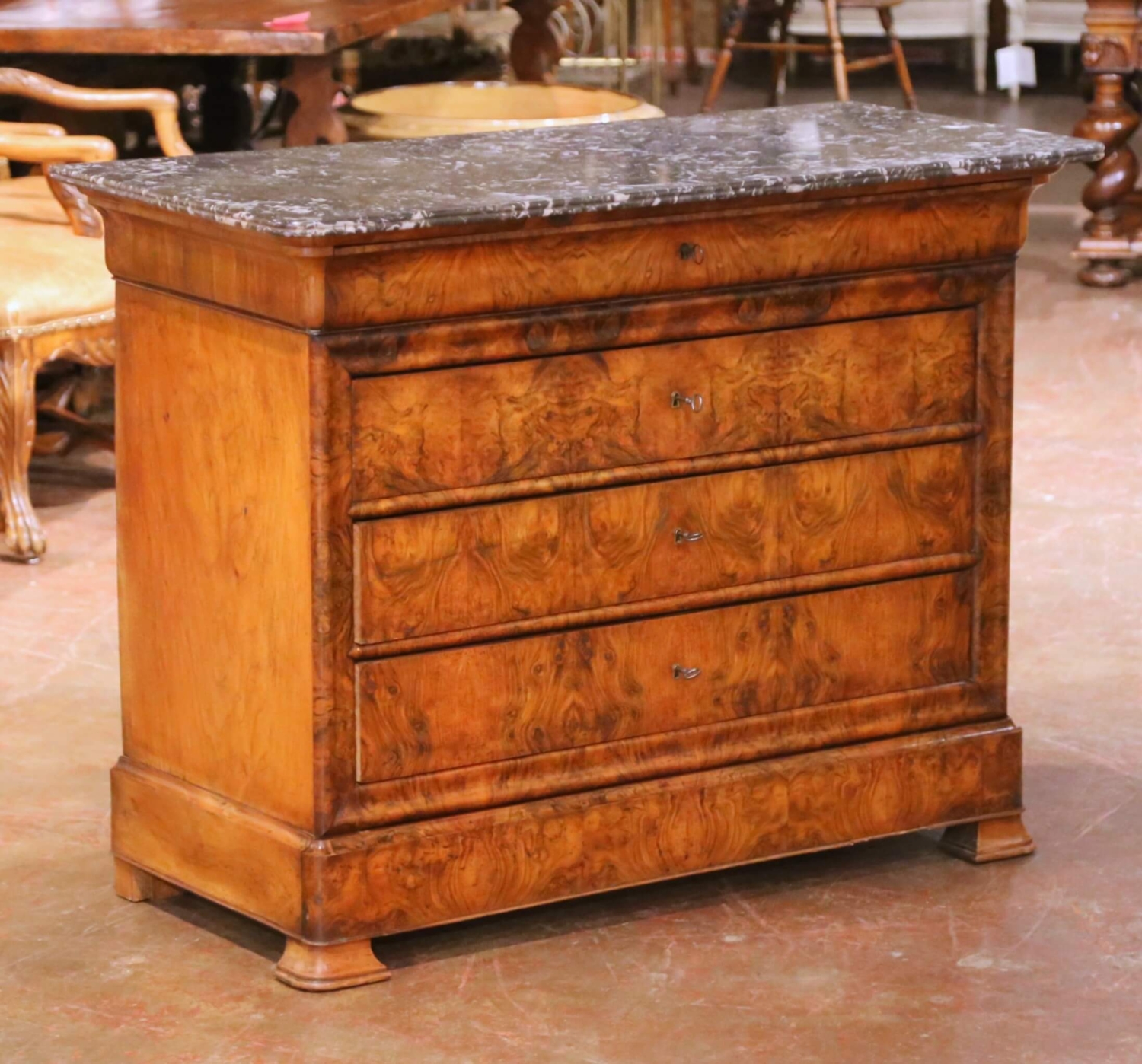 This authentic antique French Louis Philippe chest dates to circa 1870 and is crafted in beautifully figured walnut. The façade is veneered in striking burr (ronce) walnut, presenting rich movement in the grain and a warm, time-softened patina. The clean, architectural lines and restrained molding are characteristic of the Louis Philippe period, emphasizing proportion and material over ornament. The chest is fitted with four graduated drawers above and a concealed fifth drawer housed within the plinth. Four original keys are included, and the drawers feature traditional keyhole cutouts typical of the period. Grain continuity across the drawer fronts is excellent, while the sides are finished in solid or plain walnut veneer, consistent with quality mid-19th-century French construction. The piece is topped with a dark gray veined marble top with a molded edge, offering elegant contrast while remaining period appropriate. The marble shows natural veining and surface character consistent with age. The chest is in excellent condition commensurate with age and use. Grounded on the plinth base, this piece provides generous storage and a timeless Louis Philippe silhouette well suited for a bedroom, entry hall, or refined interior. Dimensions 51″W x 23.75″D x 39.25″H