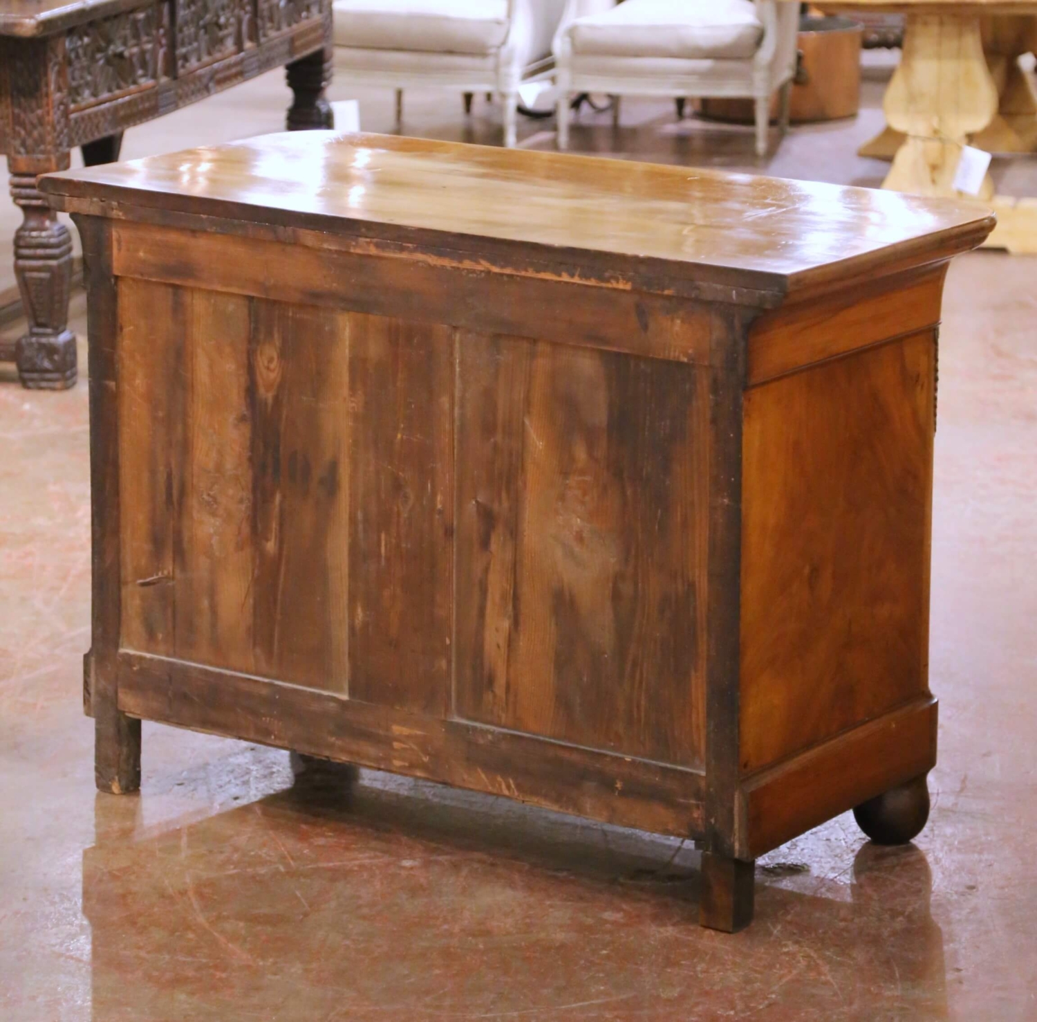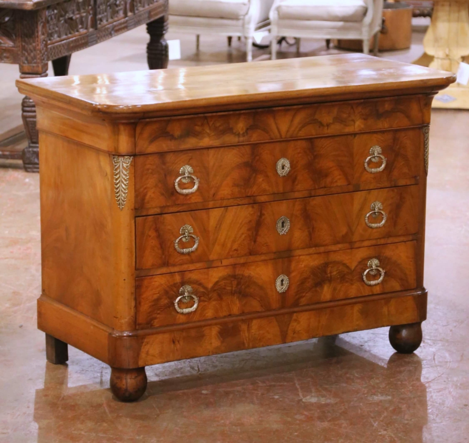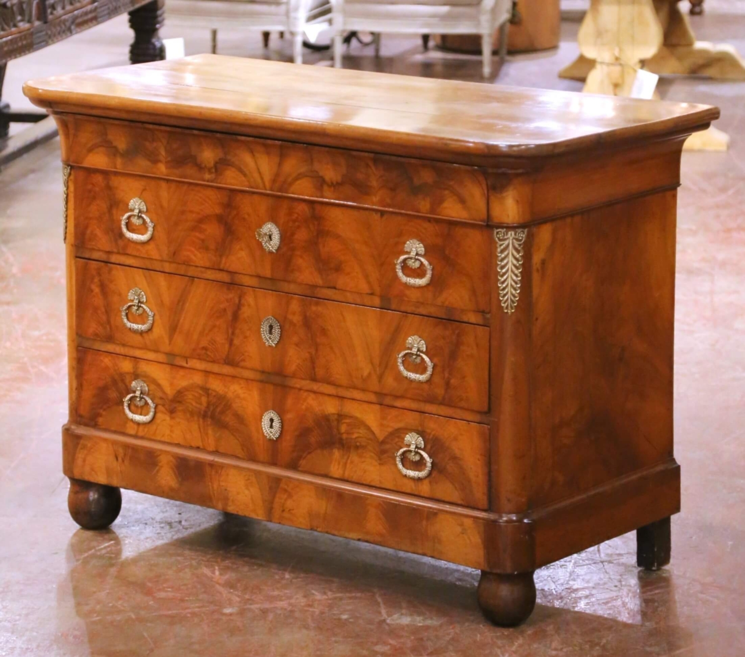 This elegant 19th century French walnut commode, dating to circa 1860, is a fine example of the Louis Philippe style, known for its restrained lines, balanced proportions, and emphasis on beautifully figured wood rather than elaborate ornamentation. Crafted from solid walnut with richly grained veneers, the commode presents a clean rectangular form topped by a molded walnut top with softly rounded front corners, characteristic of the period. The façade is fitted with four drawers, including a shallow frieze drawer discreetly set beneath the top and three larger graduated drawers below. Each drawer displays striking flame walnut grain arranged in a symmetrical pattern, a hallmark of Louis Philippe cabinetry. The drawers retain their original brass ring pulls and escutcheons, while finely cast brass foliate mounts accent the corners, adding subtle decorative detail without compromising the piece’s architectural simplicity. The commode stands on turned bun feet, reinforcing the solid, grounded elegance associated with the style. The drawer interiors are constructed with traditional dovetail joinery and retain a warm, time-softened patina consistent with age and use. The back and secondary surfaces show honest wear, further confirming the antique character and authenticity of the piece. Well proportioned and versatile, this Louis Philippe walnut commode is ideally suited for use in a bedroom, living room, or entry, and integrates effortlessly into both traditional and transitional interiors. The antique commode is in excellent condition, with wear consistent with age and use. Dimensions: 50.75″W x 24.5″D x 36.5″H.