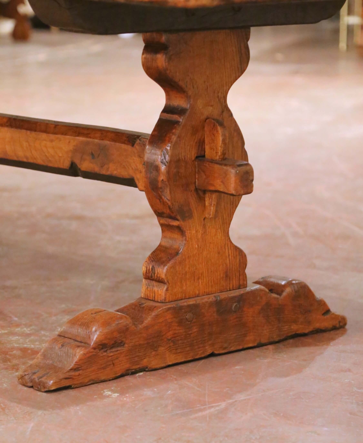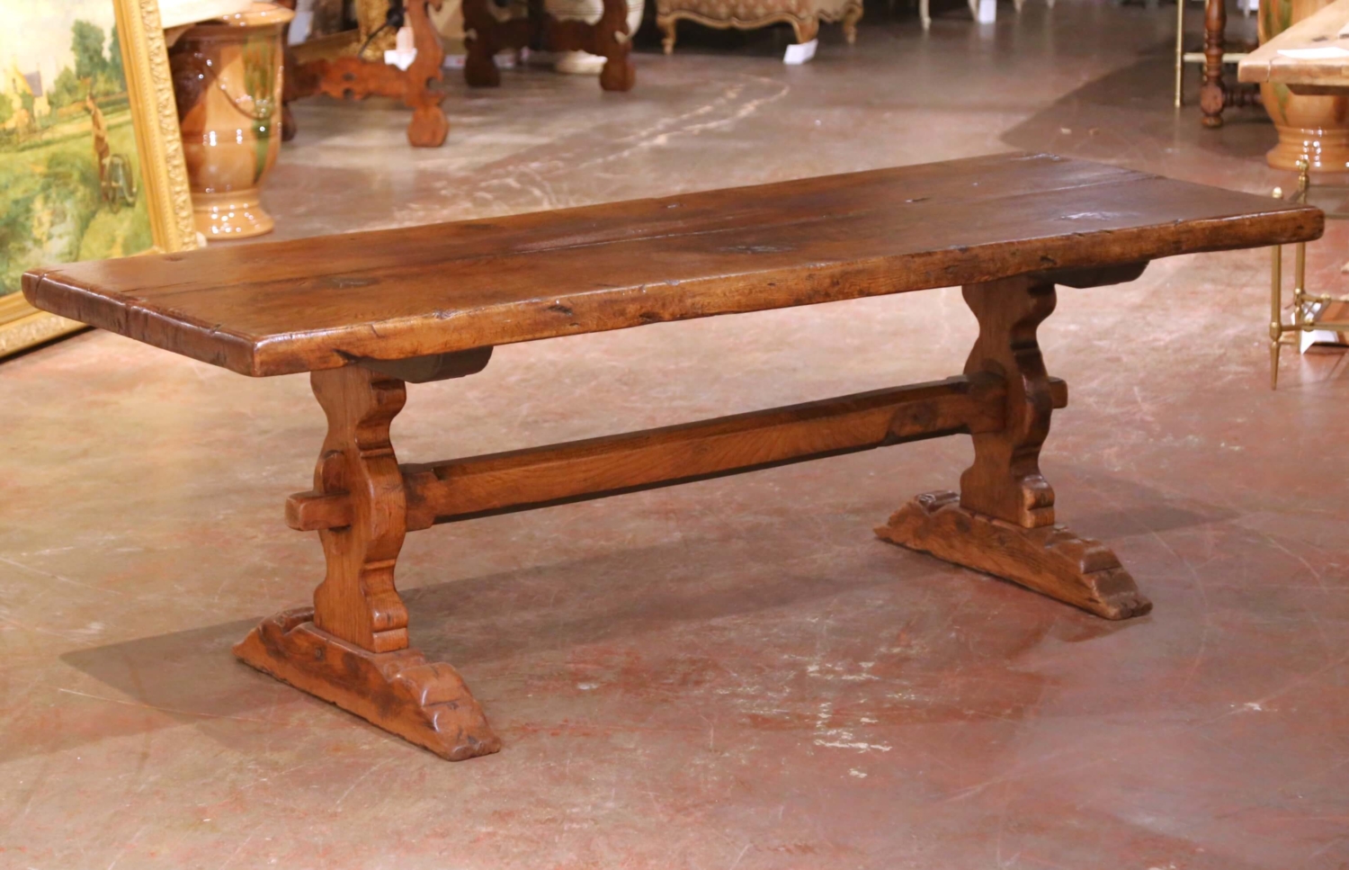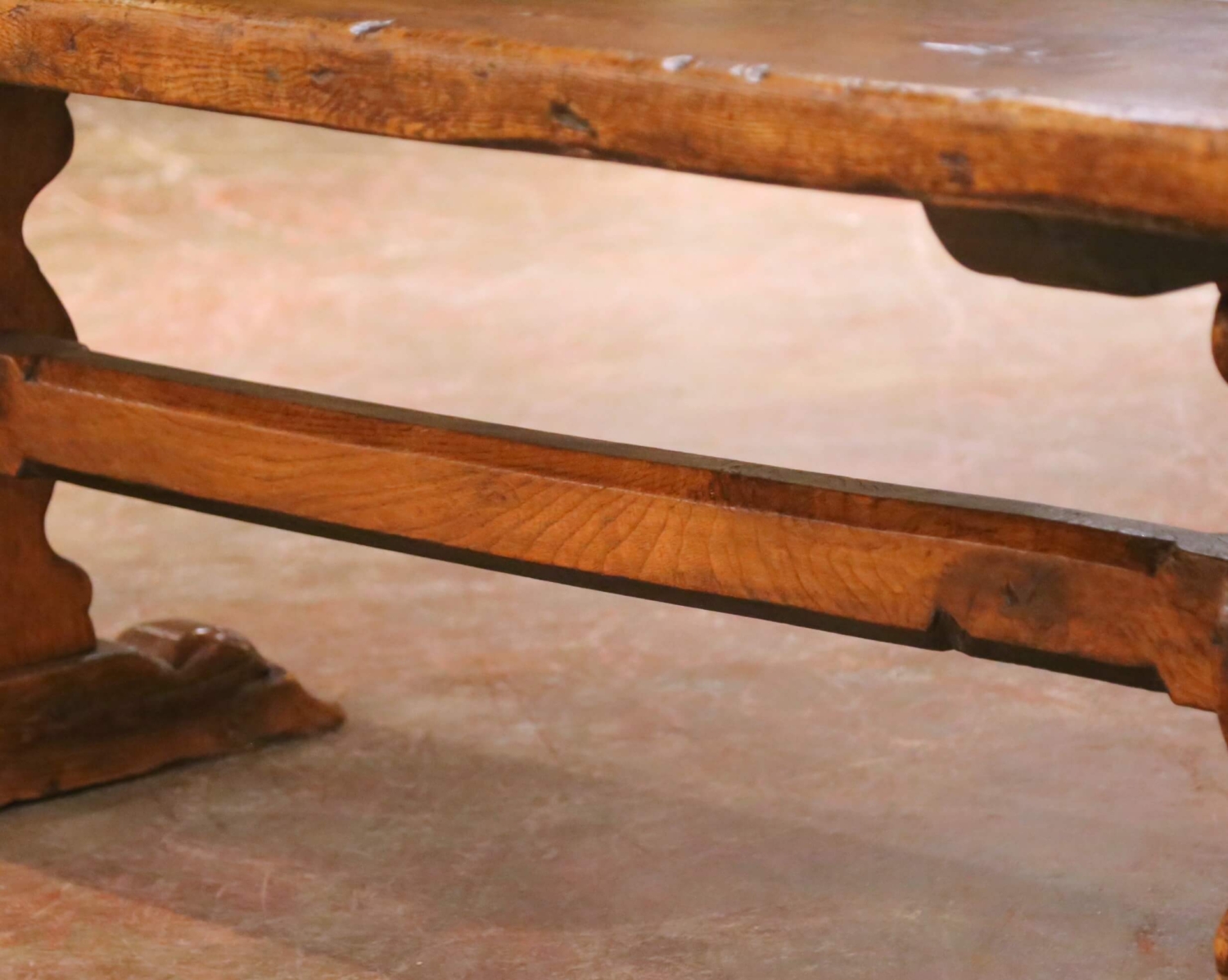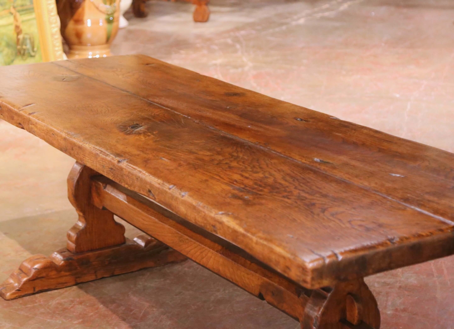 This exceptional antique French refectory farm table was crafted in southern France circa 1880 from solid old-growth chestnut and oak. The remarkable two-plank top showcases the natural beauty of centuries-old wood, with pronounced grain, knots, age separations, and visible tool marks that speak to its rural origins and honest craftsmanship. The thick surface retains a warm, richly developed patina with softly worn edges and surface variation consistent with generations of use. The table rests on a robust trestle base with sculpted feet and a substantial through-tenon stretcher secured with exposed wooden wedges, providing excellent stability and strong architectural presence. Traditional pegged joinery and bold proportions reflect classic 19th century French provincial construction. Designed to comfortably seat eight to ten people, this antique refectory table works beautifully as a dining table, harvest table, or large kitchen centerpiece. Excellent condition commensurate with age and use, with old repairs and wear that enhance its authenticity and character. Dimensions: 88.75″W x 32.75″D x 29.5″H