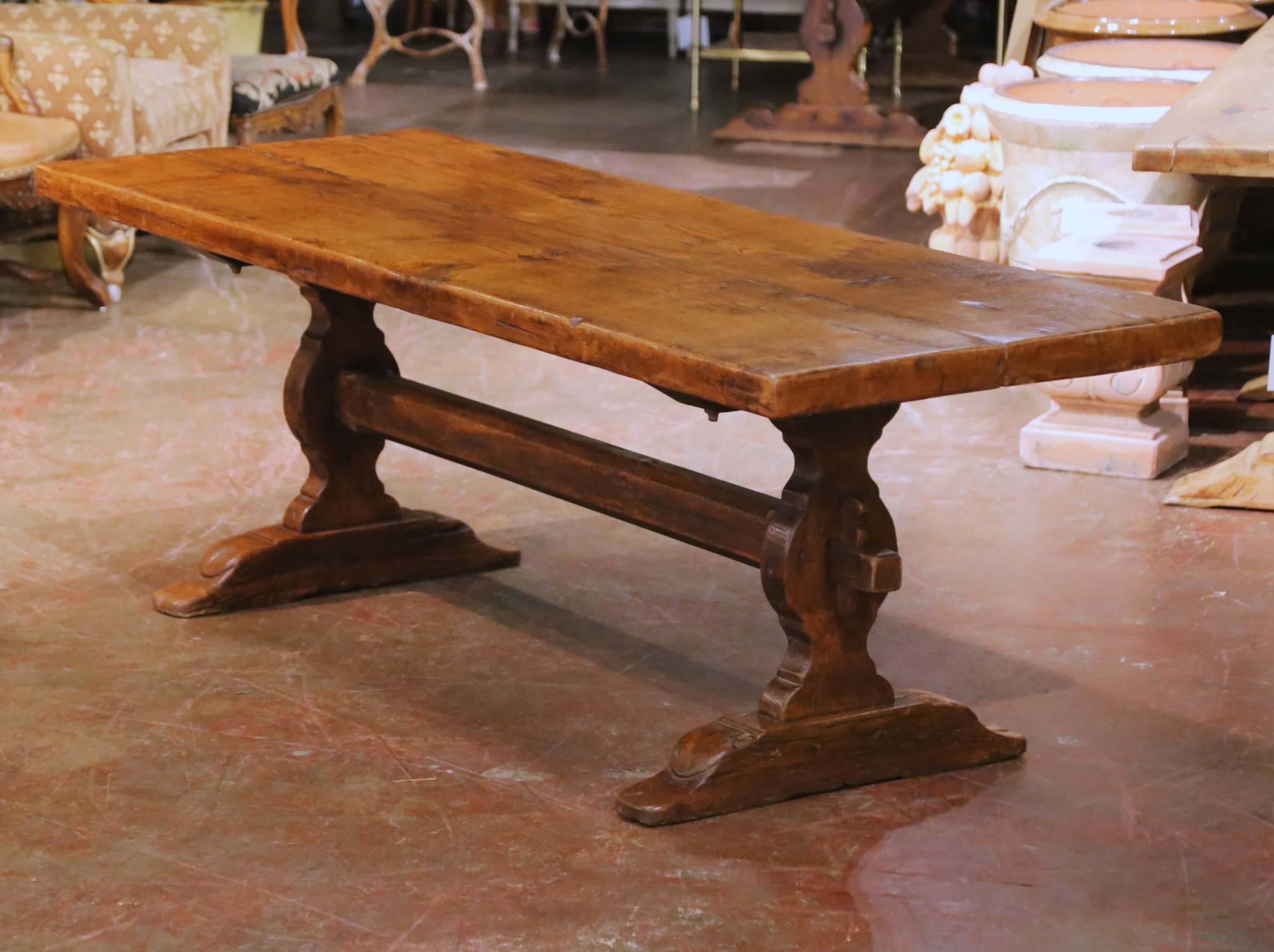 Comfortably seating eight to ten people, this antique oak monastery table is ideal as a dining table, harvest table, or large kitchen centerpiece. Excellent condition commensurate with age and use, with old repairs and surface variations that enhance its authenticity and visual appeal.