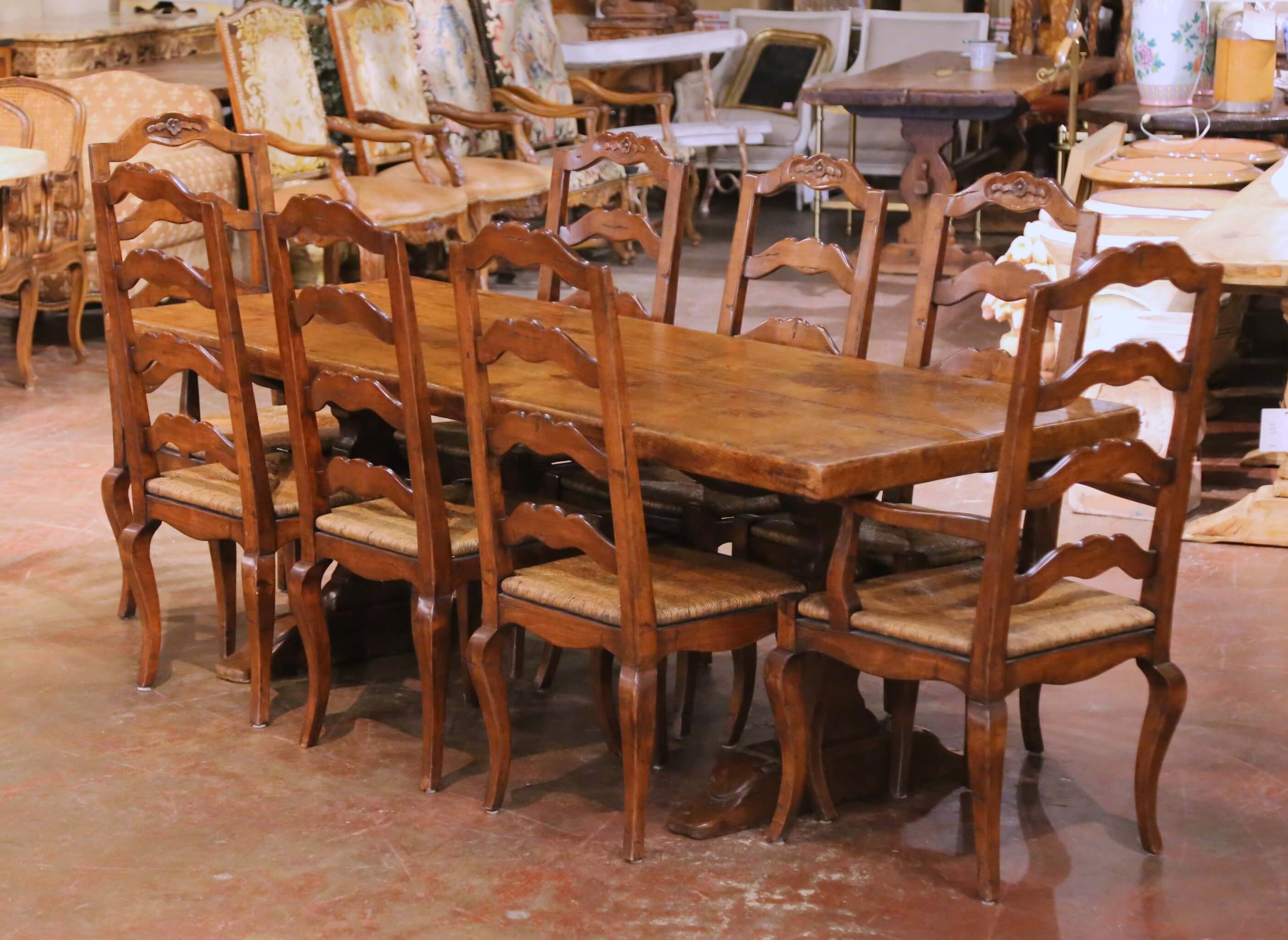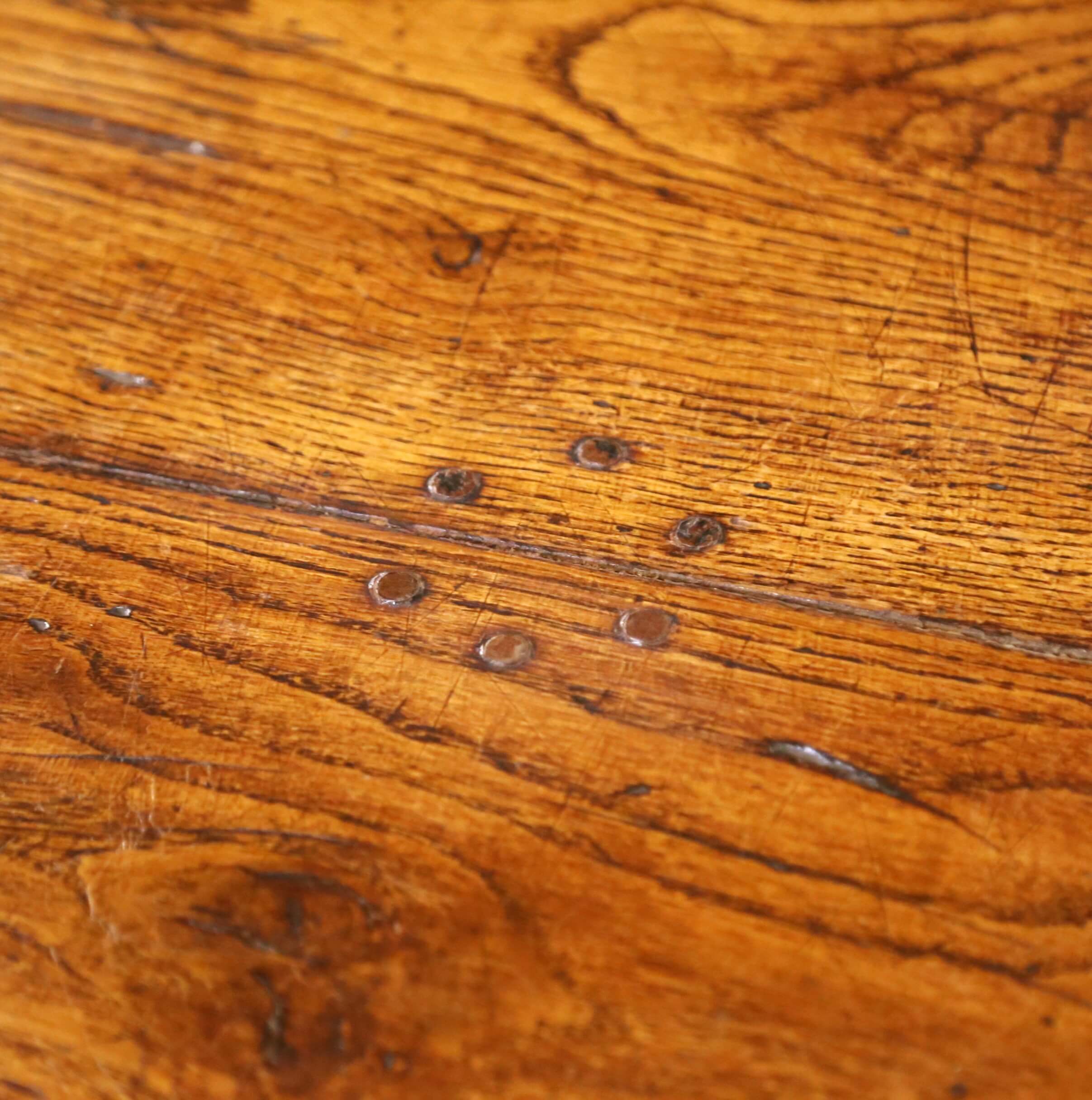 Crafted in France circa 1880, this exceptional antique refectory table is built from solid oak and exemplifies the robust character of Louis XIII–inspired provincial furniture. The thick two-plank top displays pronounced grain, knots, age separations, and surface wear developed over decades of use, all enhanced by a warm, time-softened patina and gently worn edges. The plank top retains visible hand-cut wooden pegs, a traditional construction detail typical of 19th century French provincial tables.