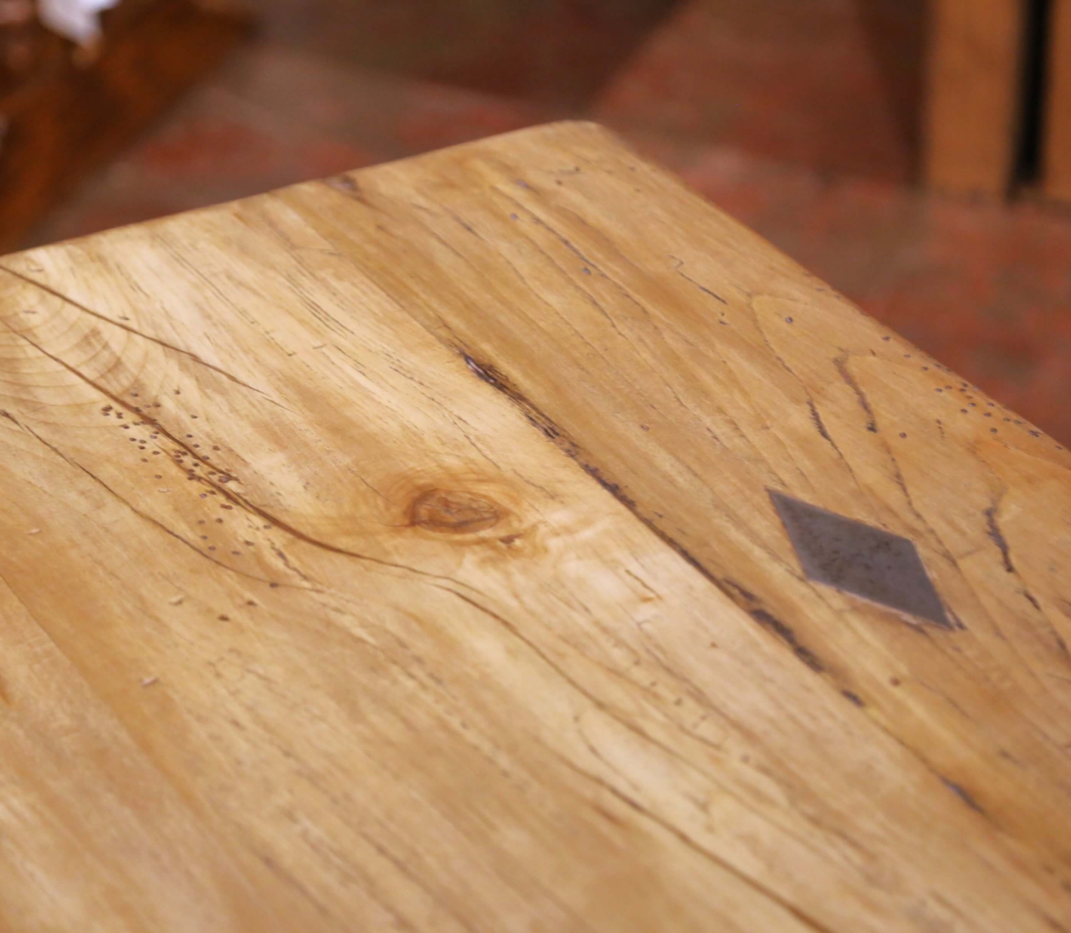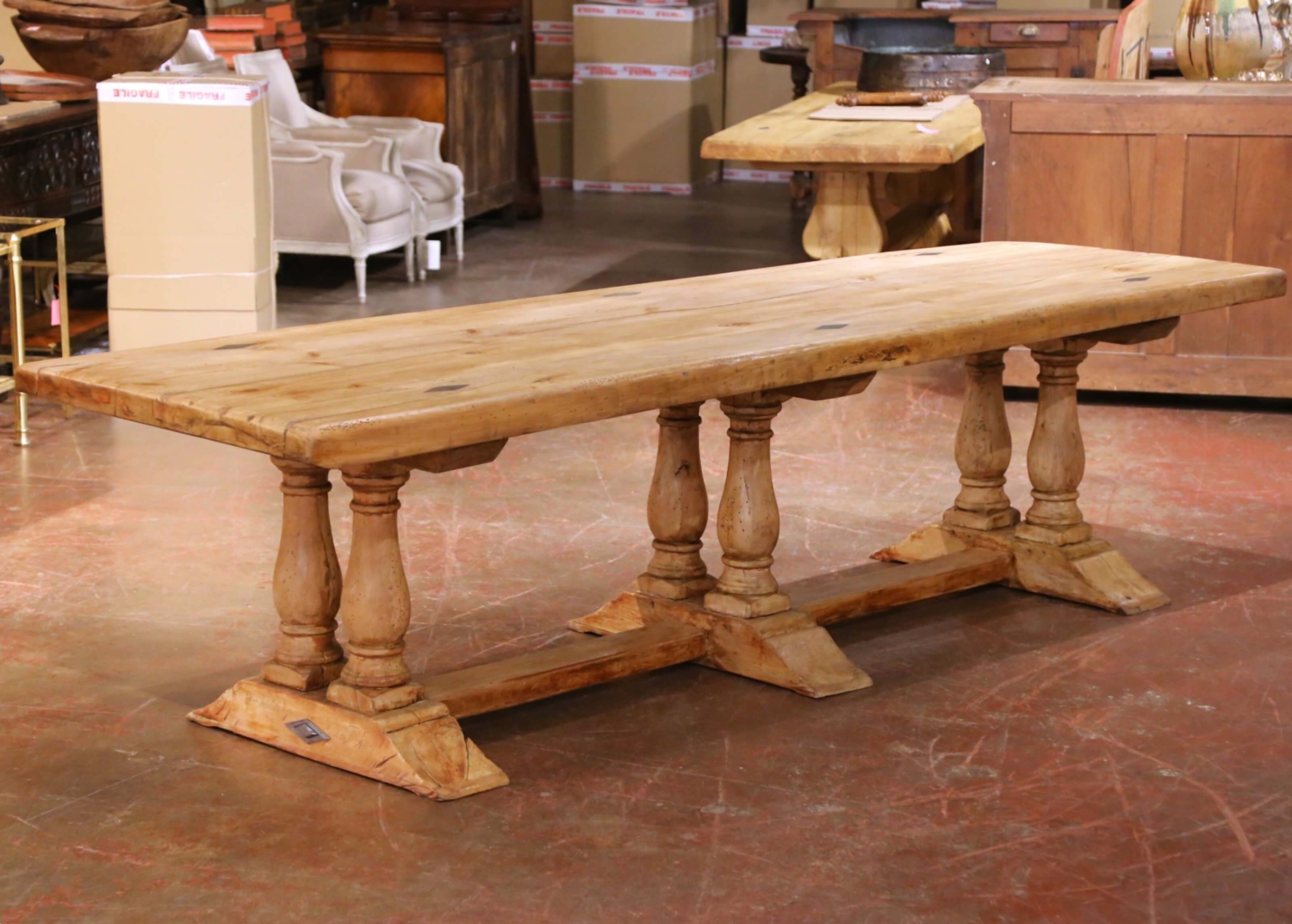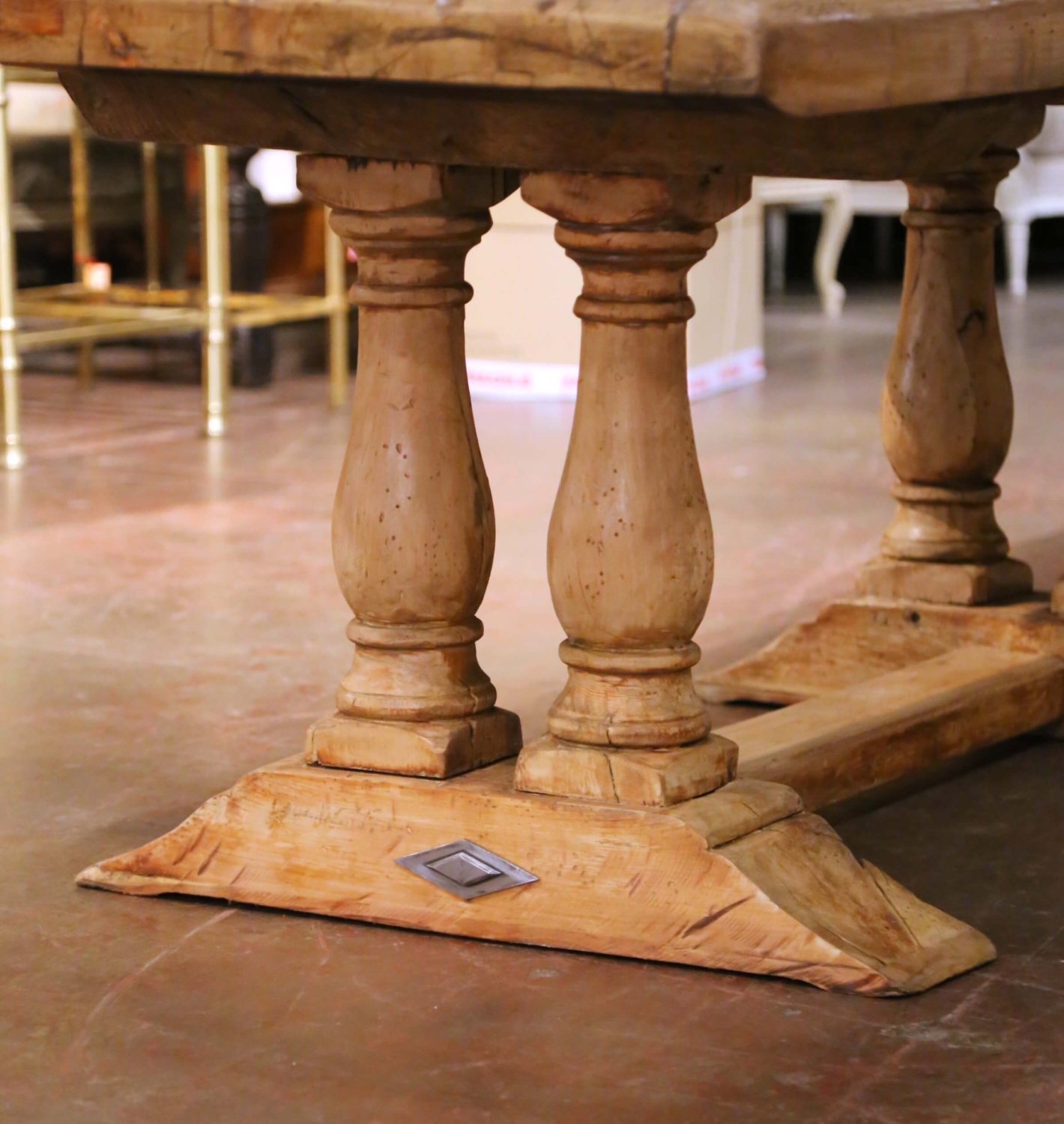 Crafted in France circa 1890, this substantial antique trestle dining table embodies the honest, utilitarian beauty of Louis XIII furniture. Originally made for communal dining or refectory use, the long and generously proportioned surface was designed to accommodate large gatherings, making it as functional today as it was in the 19th century. Constructed from solid oak, the thick four plank top displays rich grain variation, time softened edges, and butterfly style inserts, all consistent with age and traditional practices. Forged iron diamond nails accent the top and base, adding subtle decorative detail to the table’s honest rural construction. The bleached finish highlights the natural character of the oak, revealing knots, shrinkage lines, and gentle wear, all resting under a soft, pale honey patina developed through decades of use. Almost 10 feet long, the table is raised on three trestle support bases, each composed of turned baluster legs set on shaped platform feet and connected by a long central stretcher for exceptional strength and stability. This architectural configuration allows the table’s impressive length while maintaining excellent balance and generous legroom. Sculptural and grounded, this antique French table works beautifully in a dining room, wine cellar, kitchen, or large entry and pairs equally well with rustic benches or refined provincial seating. The large table is in excellent condition commensurate with age and use and would seat 10 to 12 people comfortably. Dimensions: 118″ W x 34.5″ D x 30.25″ H
