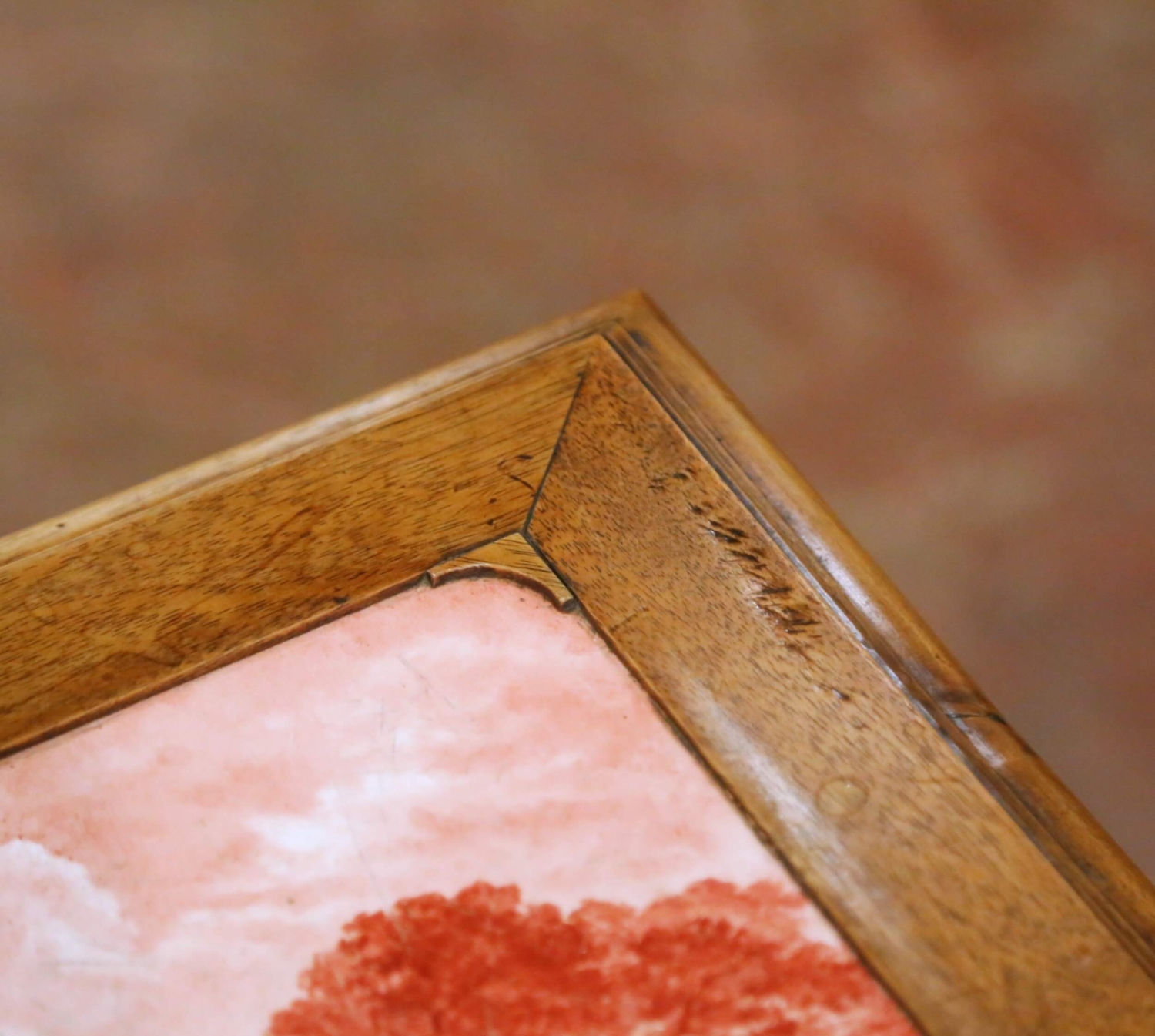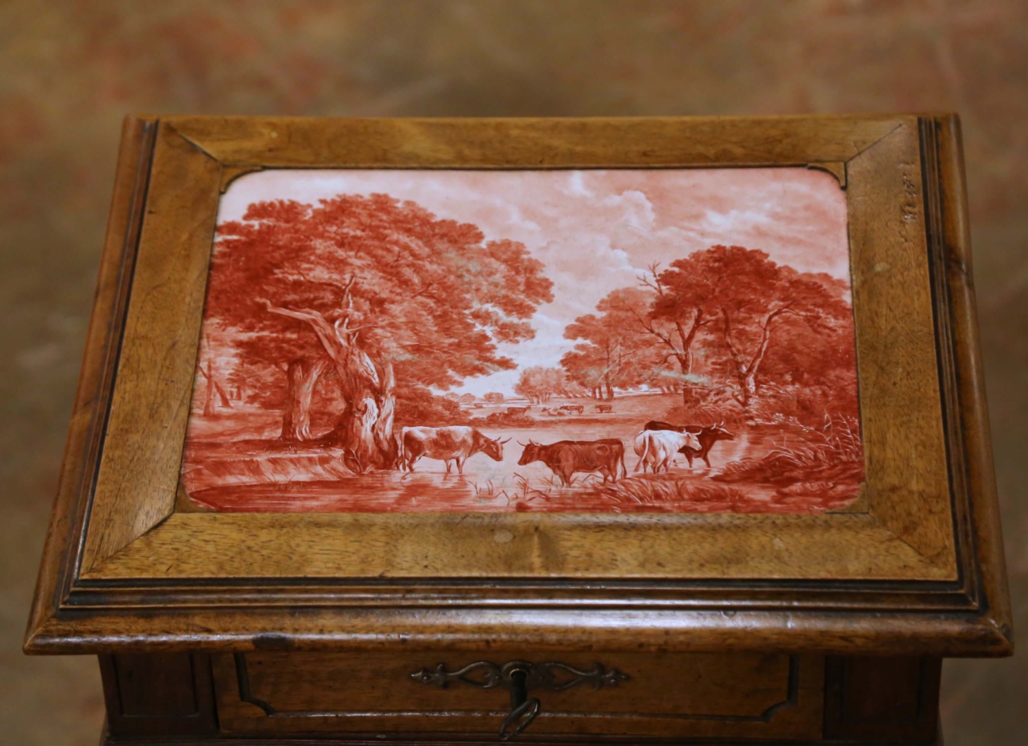 This refined antique French side table was crafted circa 1880 in the Louis XIII revival style and built in solid walnut with a warm, richly developed patina. The rectangular top is inset with a hand-decorated ceramic tile panel depicting a pastoral countryside scene with grazing cattle and trees, rendered in deep red tones. Set flush within a molded walnut surround, the tile top adds strong decorative presence while remaining practical for everyday use. The table is raised on finely turned walnut legs joined by a cross stretcher with a central turned finial. A single fitted drawer is discreetly integrated into the apron and retains its original metal pull, offering convenient storage for small items. The overall form is slender, architectural, and well balanced, making this antique table ideal as a side table, lamp table, or occasional table in a living room, bedroom, or study. The piece is in excellent condition commensurate with age and use, with light surface wear consistent with its period and no structural issues. A charming and functional example of late 19th century French walnut furniture combining classical Louis XIII styling with a decorative pastoral tile top. Dimensions: 17.25″W x 14.5″D x 28″H.