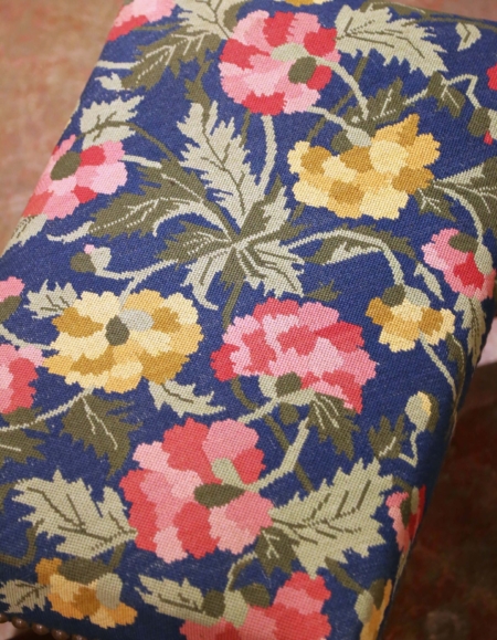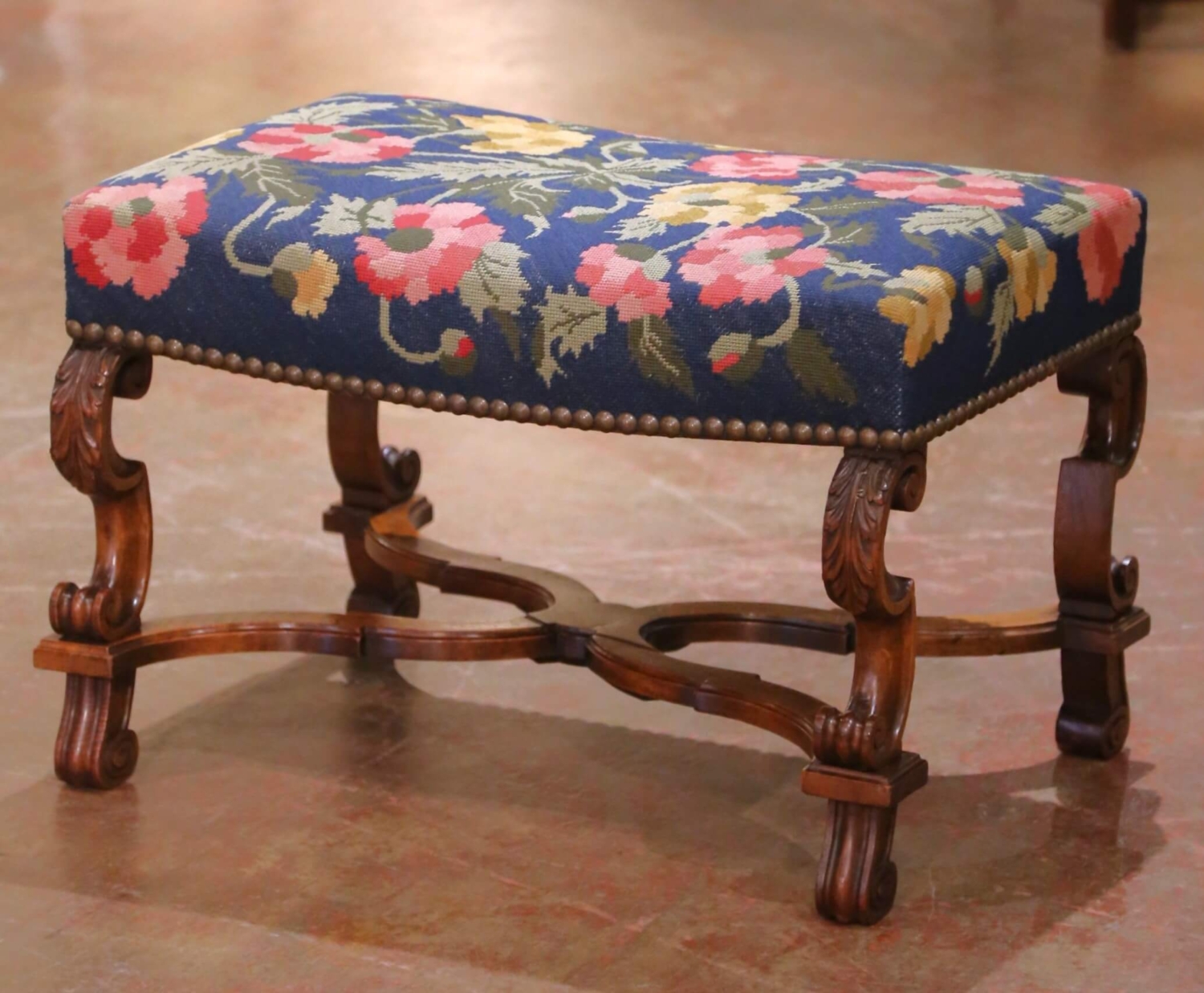 Bring a touch of old-world charm to your home with this antique Louis XIII style stool. Made in France circa 1870, the rectangular seat is upholstered with vibrant floral needlepoint in shades of rose, yellow, and green set against a rich blue background, secured with brass nailhead trim. The frame is fashioned from solid walnut and features beautifully hand-carved scroll legs with acanthus leaf motifs, connected by an elegant X-form stretcher for strength and balance. This charming stool is sturdy and comfortable, with a warm walnut patina that enhances its antique character. The floral upholstery adds a bold pop of color, making it an excellent accent piece for a bedroom, hallway, or living space. In excellent condition commensurate with age and use, this 19th-century French stool is ready to be enjoyed for generations. Dimensions: 26″ W x 18″ D x 17″ H